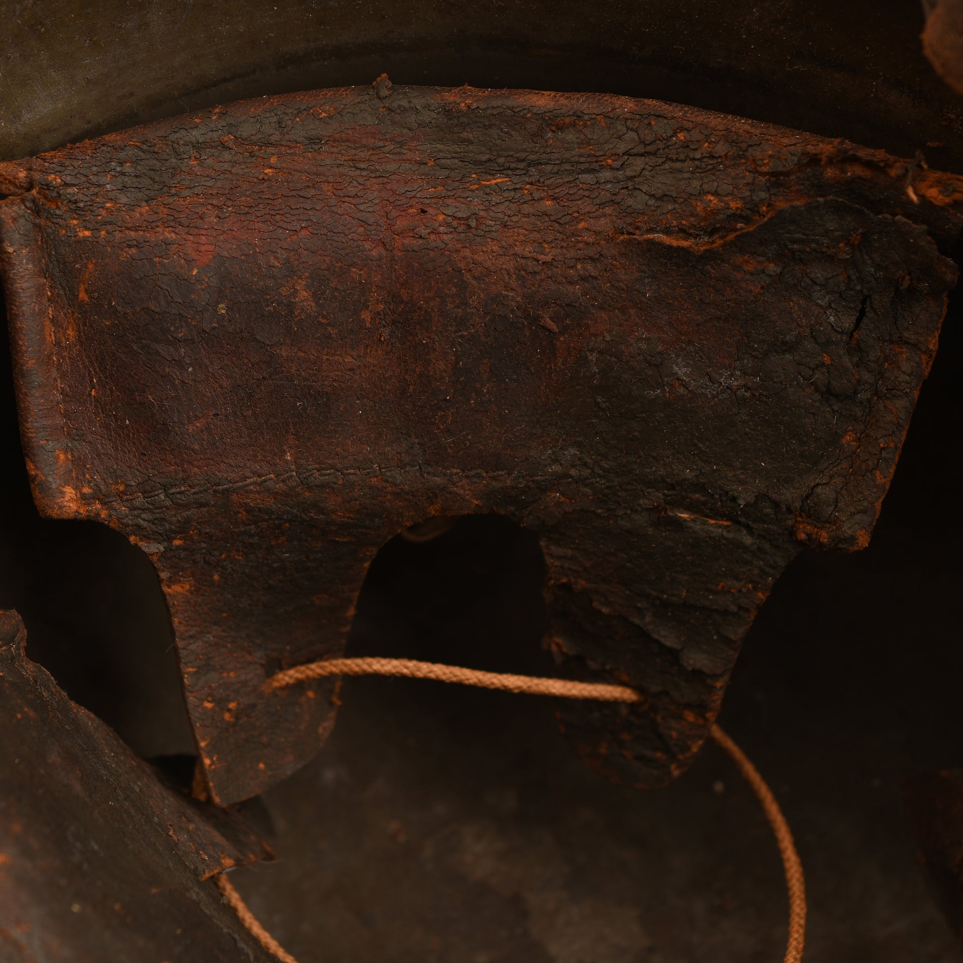 The helmet retains its original three-pad liner, with one pad showing a period-style but non-contemporary repair. The original horsehair pads and drawstring remain in place. The leather has been treated at some stage, slightly altering its tone. The chinstrap, of heavier construction than standard issue, appears to have been modified from a wartime utility strap.