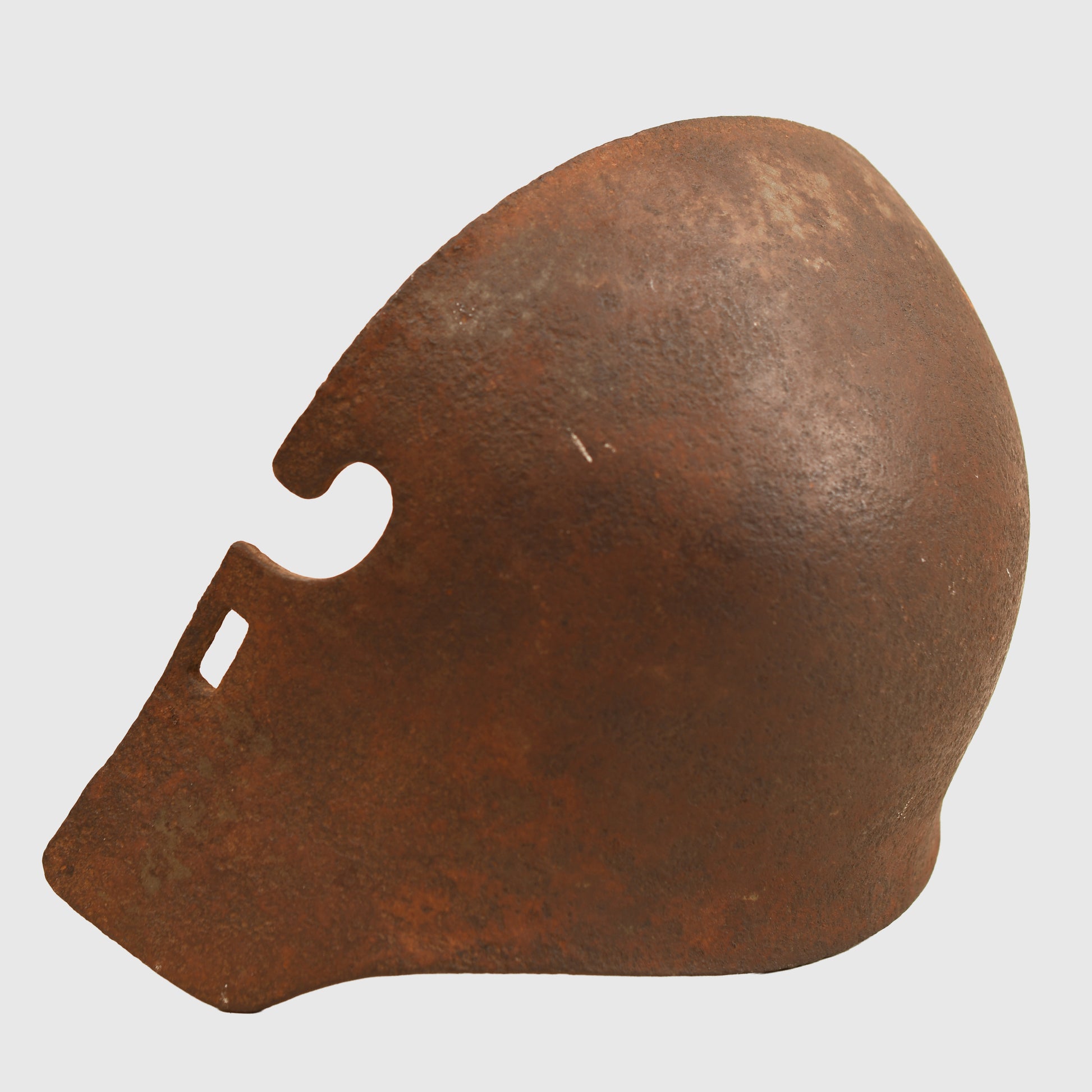 A rare example of a World War I M16 helmet armoured front plate, showing slight surface corrosion throughout. Faint traces of the original apple green paint remain in a small section on the reverse side, with additional minor areas of paint visible on the front right of the exterior.