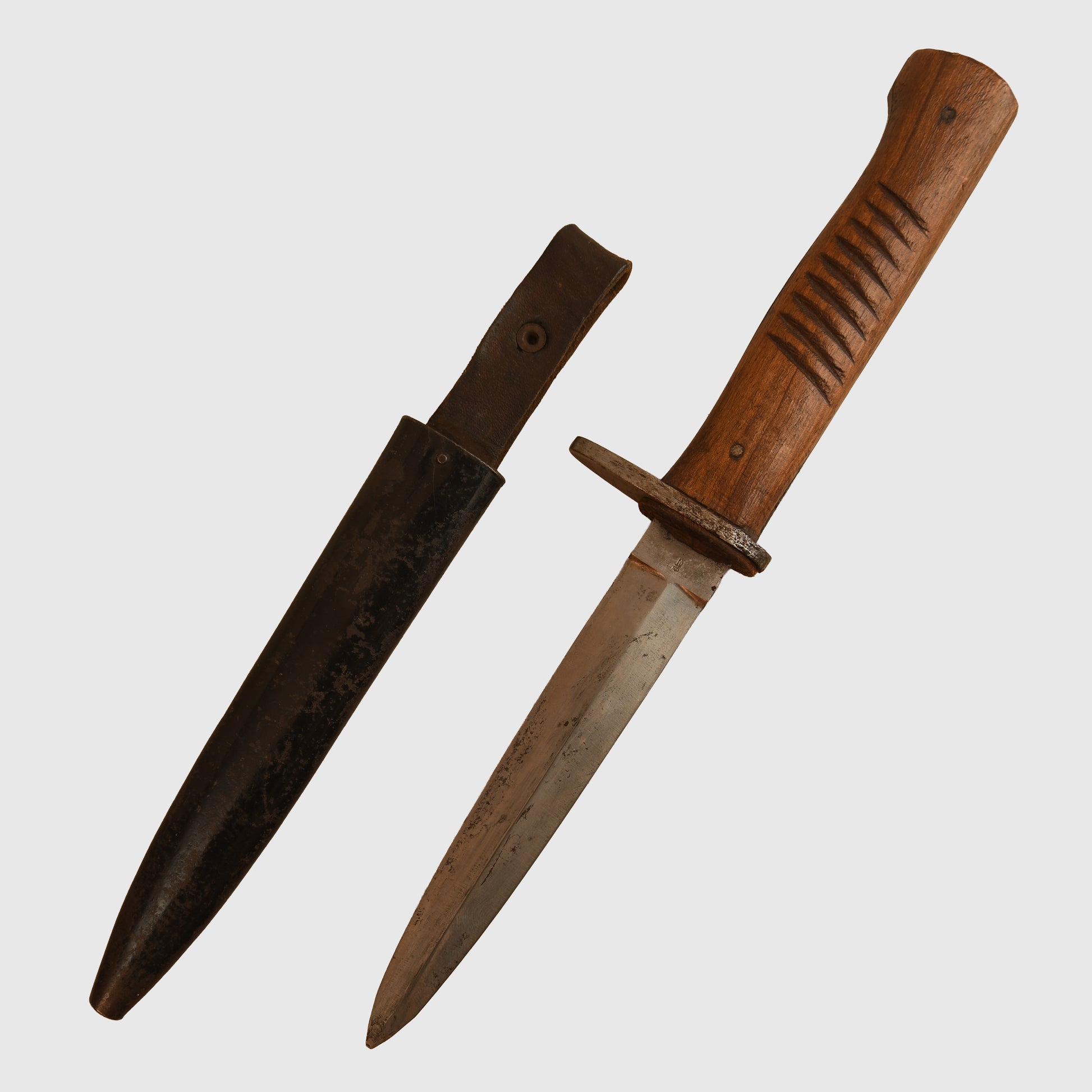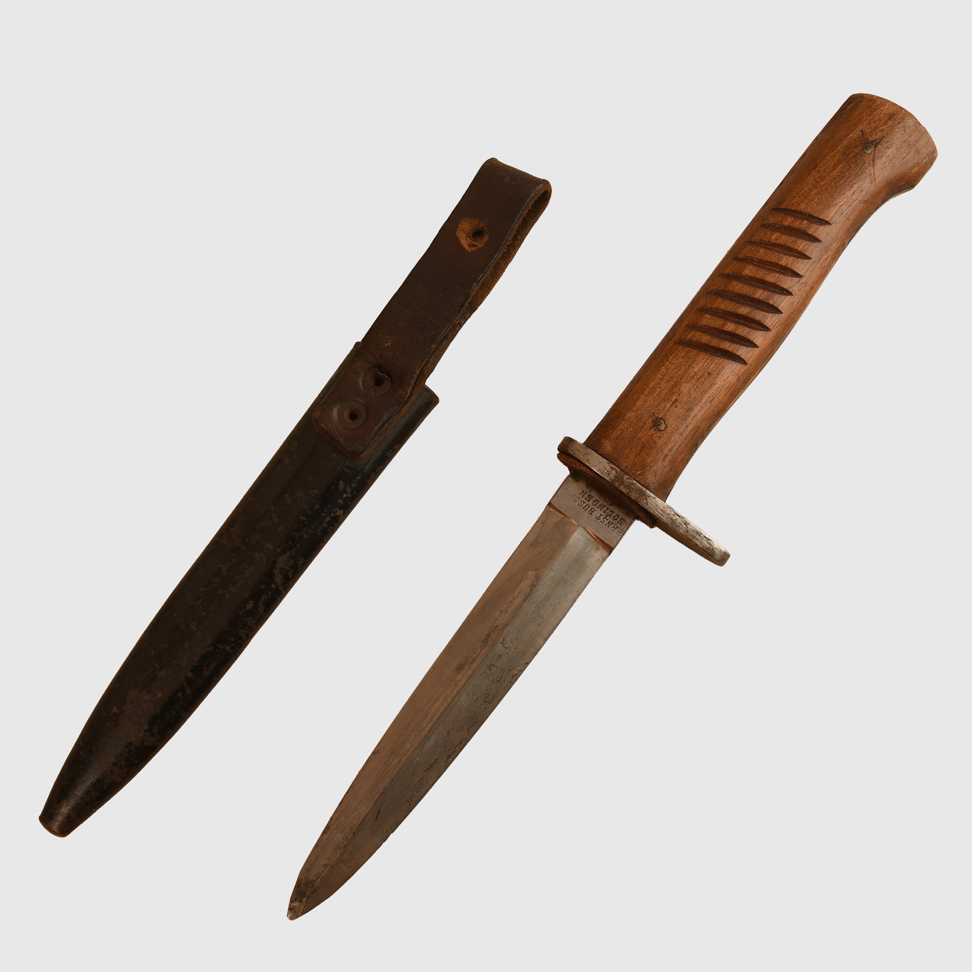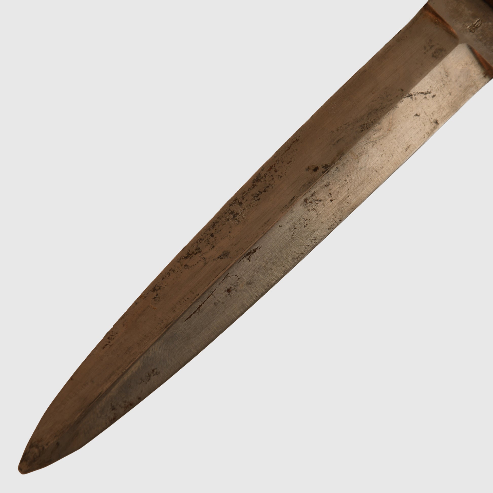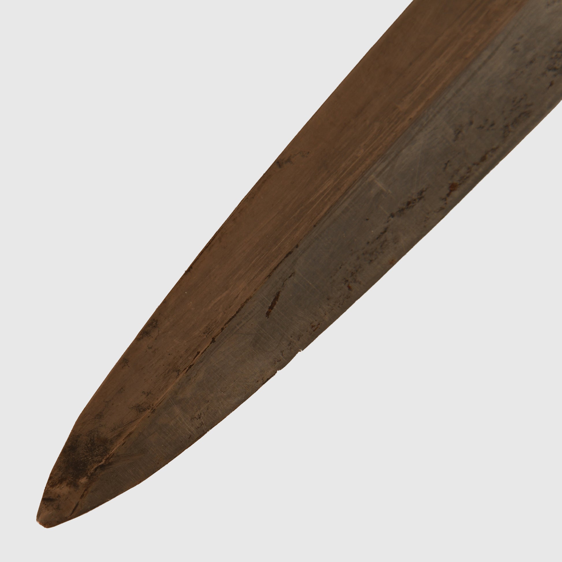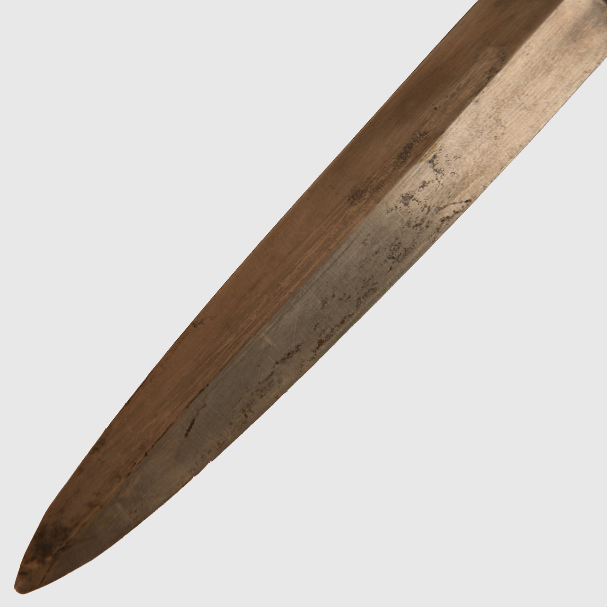 A desirable World War I German display piece with light pitting at the very tip, otherwise retaining excellent profile. Clear Mauser manufacturer markings and Imperial acceptance stamp dated ‘17’ remain visible. The rifle retaining system functions correctly, and the grips are undamaged. Complete with its original scabbard, which shows minor pitting and a single piece of battle damage, adding to its period character.