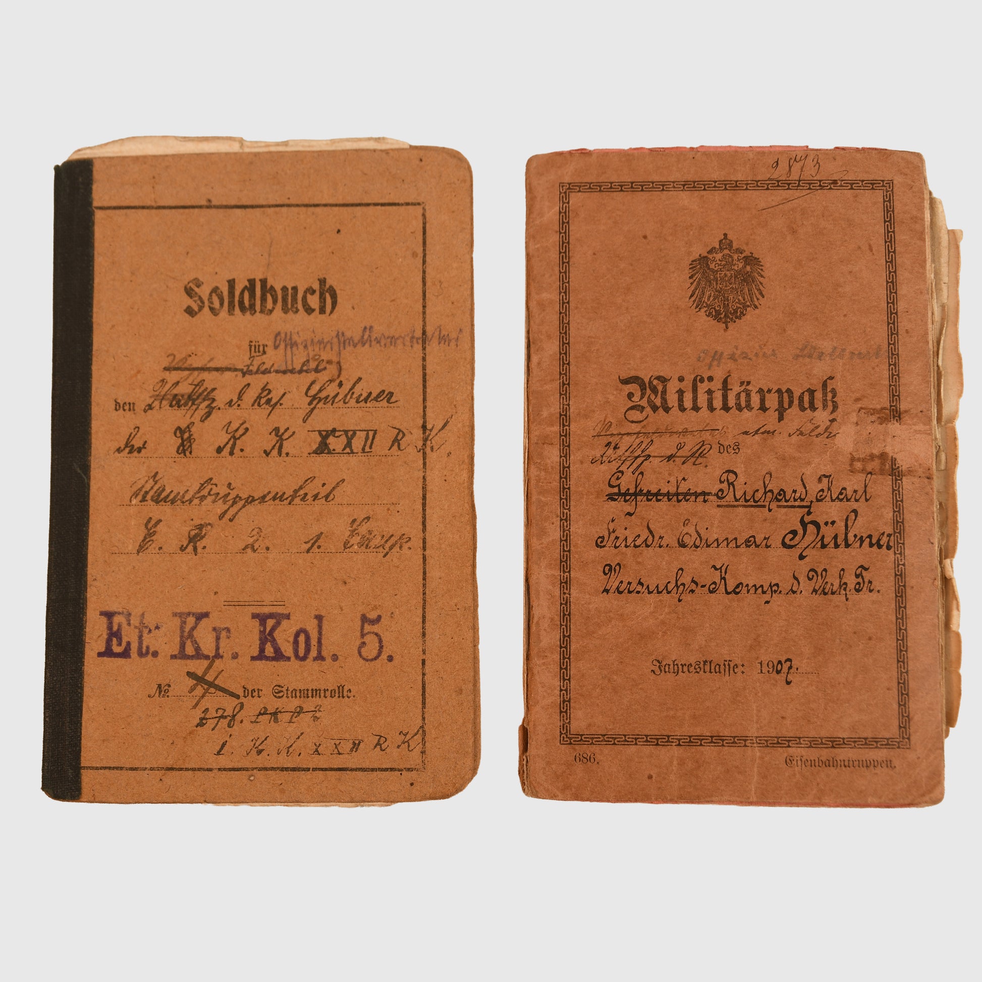 At the rear of the album are mounted images of a Cossack officer dated 1916 and captured Bulgarian officers with an Austrian officer. Accompanying the album are both the Wehrpass and Soldbuch of Feldwebel Richard Hubner—a rare combination for WWI—both extensively filled with documentation. Hubner was also attached to the Prussian Flying Station at Cologne.