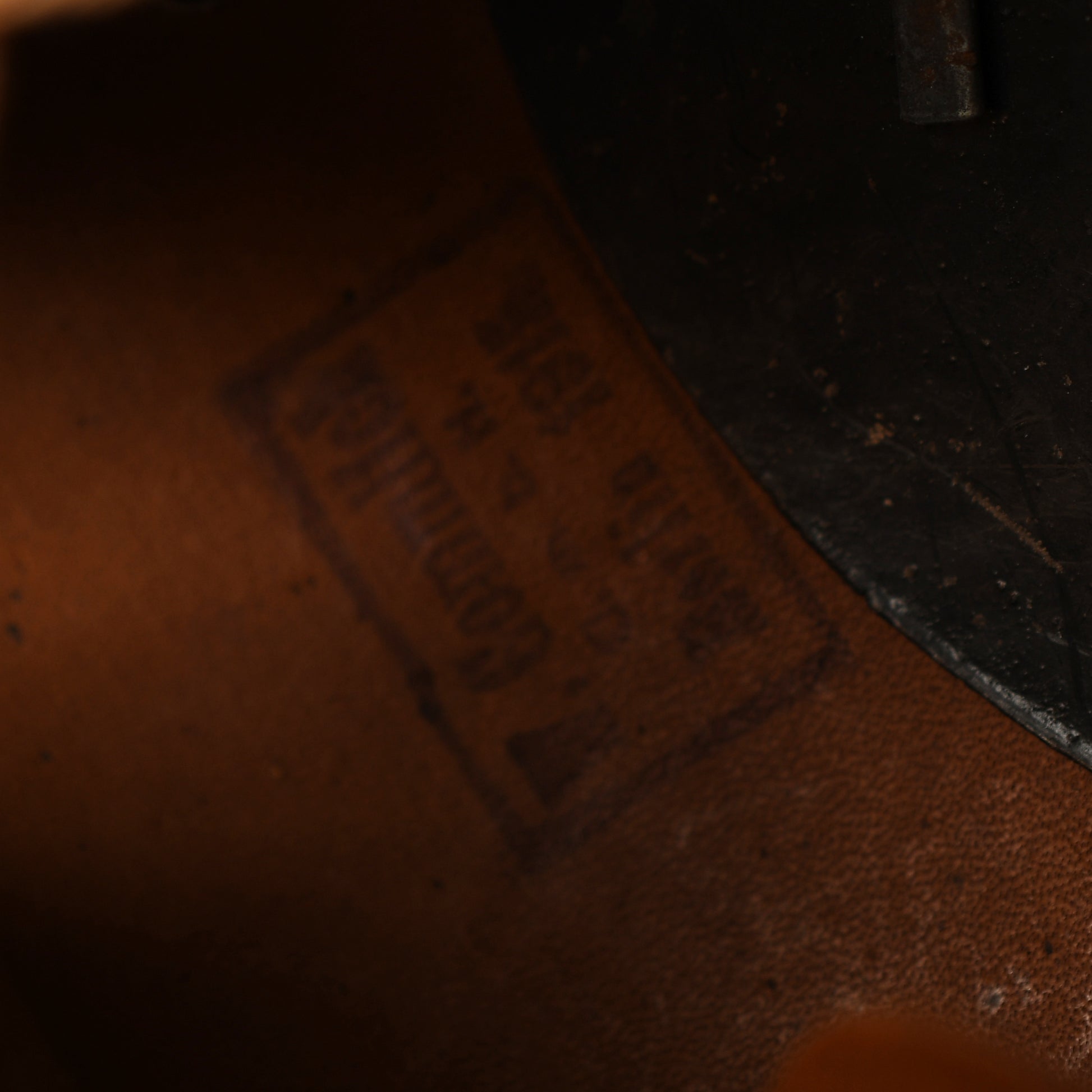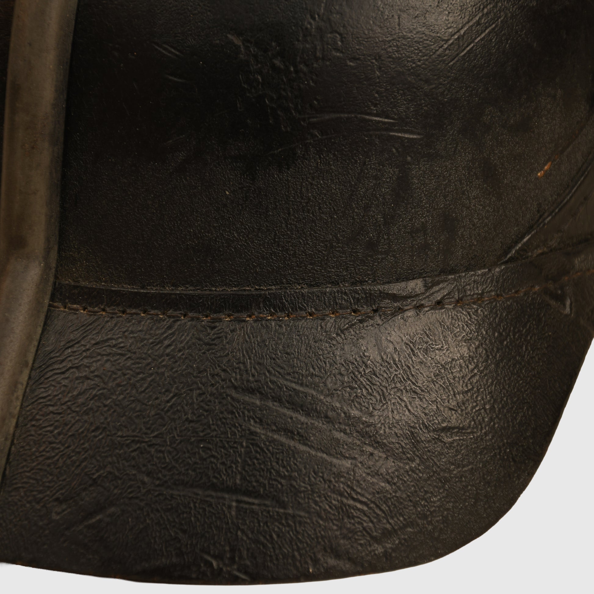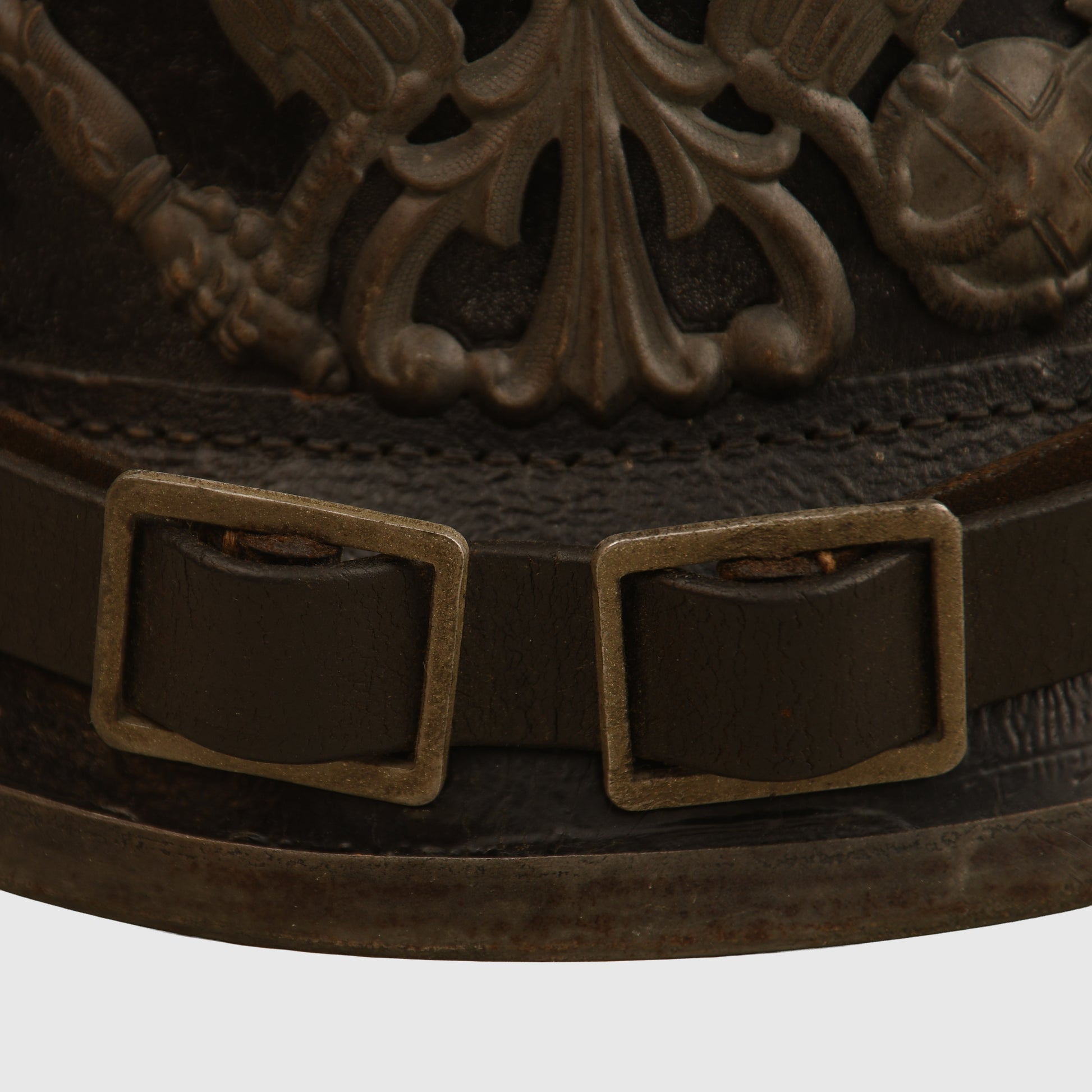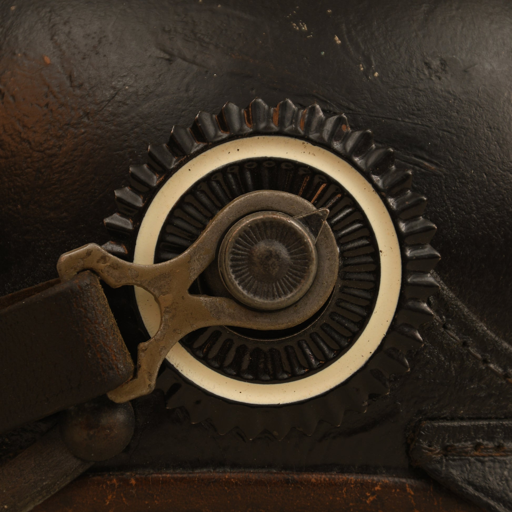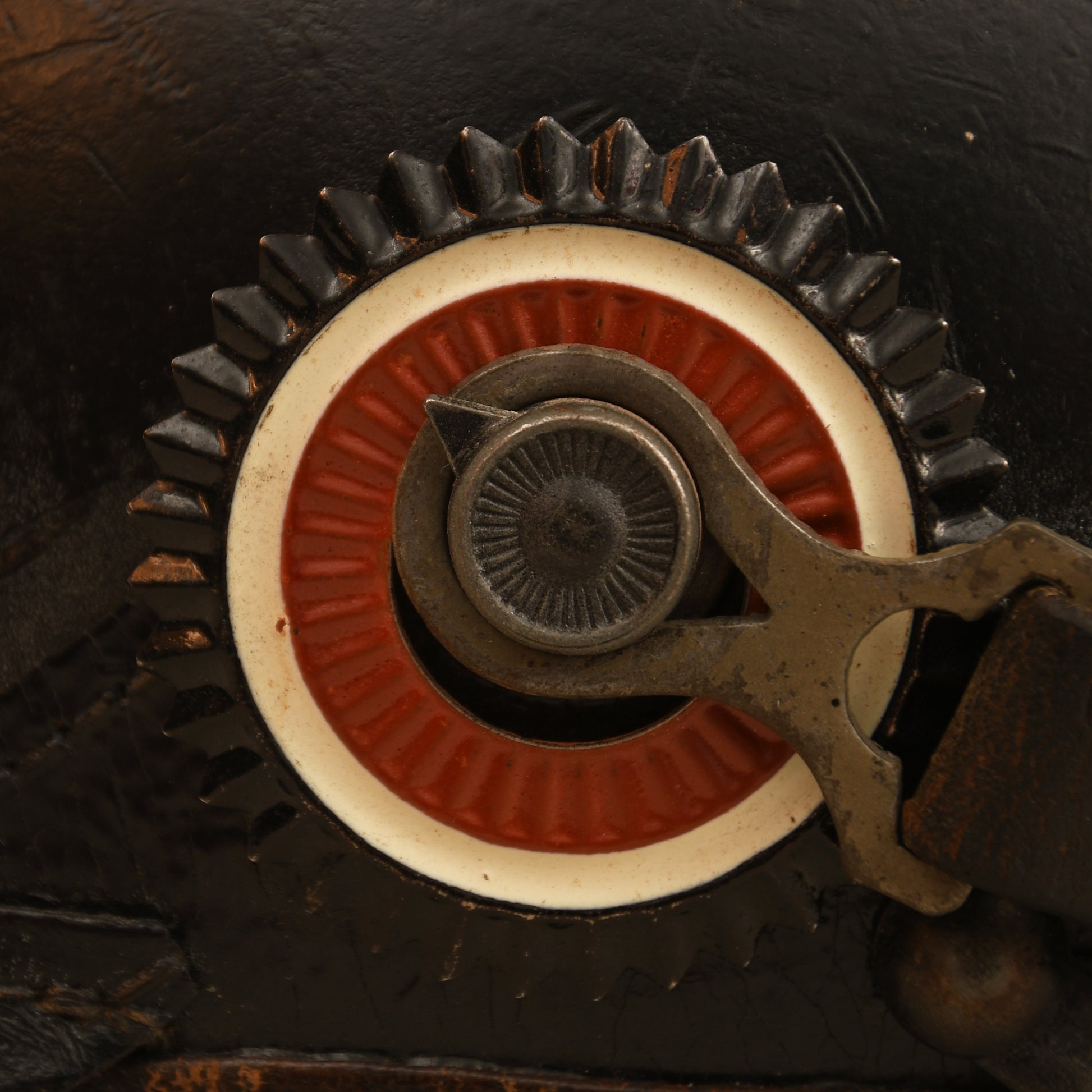 A superb example, virtually mint, possibly one of the thousands sold by the U.S. Government on War Bond drives after the war. Small size stamped ‘52’. The leather exterior skull is in excellent condition with all stitching to the front and back peaks intact and secure. The front field grey peak trim is undamaged and free of kinks. All fittings—including the removable spike, circular spike base, back strap, Prussian front plate, front peak trim, and strap fittings—are in excellent condition, with a slight shade difference between the spike and the other fittings. The national and Prussian cockades are complete and appear as mint as the day they were made.