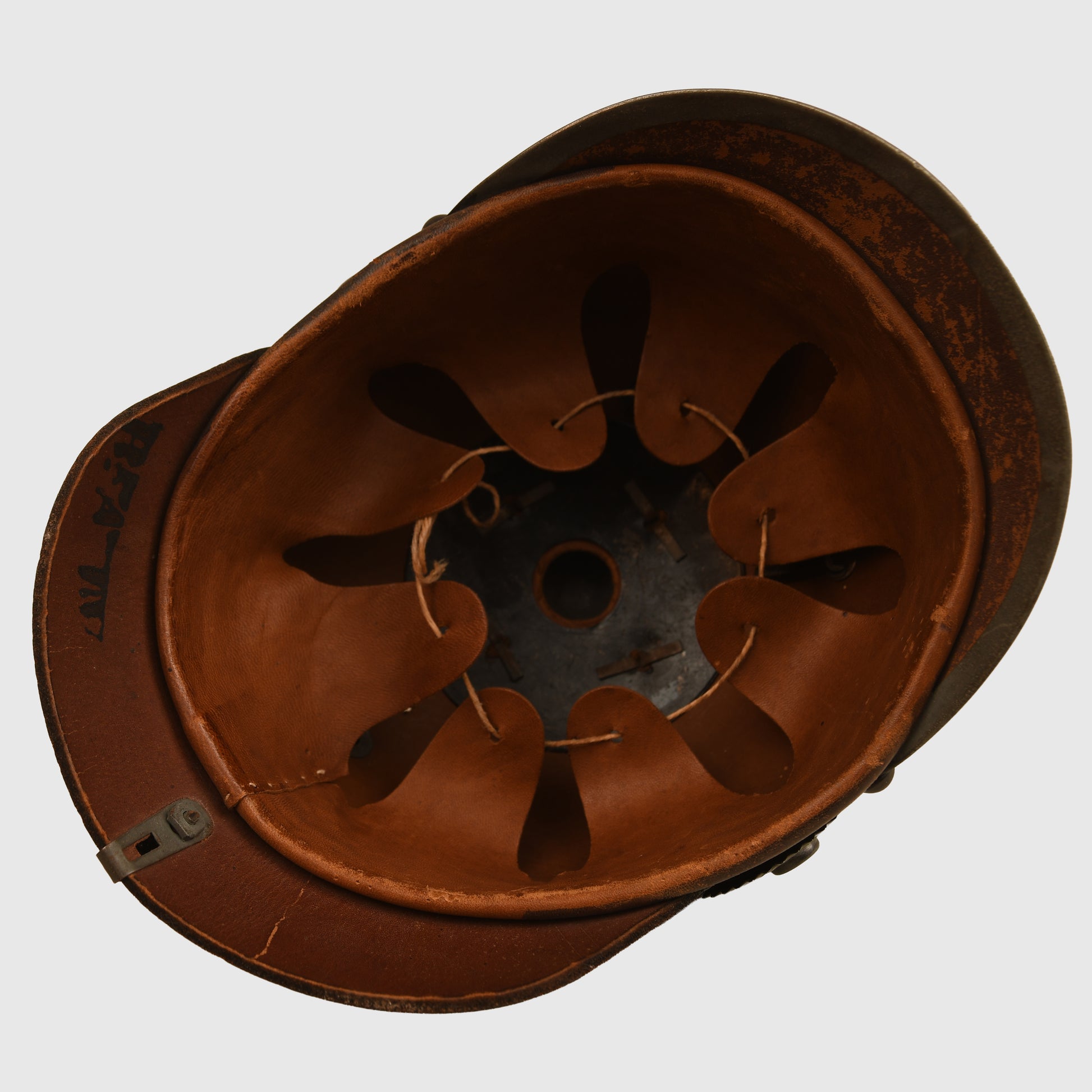 The interior retains its original light tan skull and full 8-tongue liner with original drawstring. The helmet bears an inked rectangular maker’s stamp ‘Berlin 1915’ and an additional inked number ‘5’, possibly indicating the 5th Army Corps. Unit or corps markings are faintly visible on the rear peak but difficult to fully ascertain.