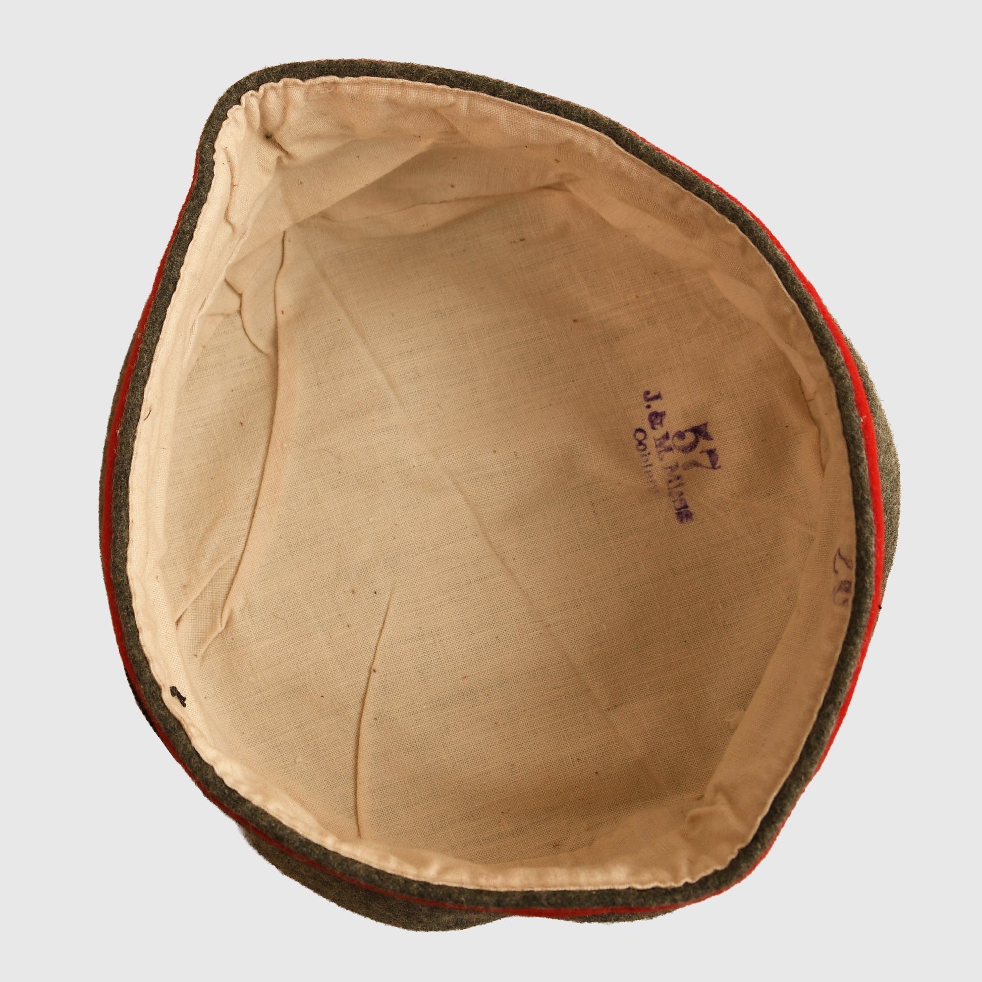An exceptional, unissued example of a Prussian enlisted man’s feldmutze, size 57. Crafted from quality field grey cloth that retains its full nap, showing only the lightest traces of moth tracking. The cap displays vibrant red waffenfarbe to the crown and a matching wide red centre band, fitted with its original large Prussian and national cockades. The interior features a clean cotton lining, crisply stamped with the size ‘57’ and the maker’s details from Koblenz. A superb, untouched example that would be difficult to improve upon.