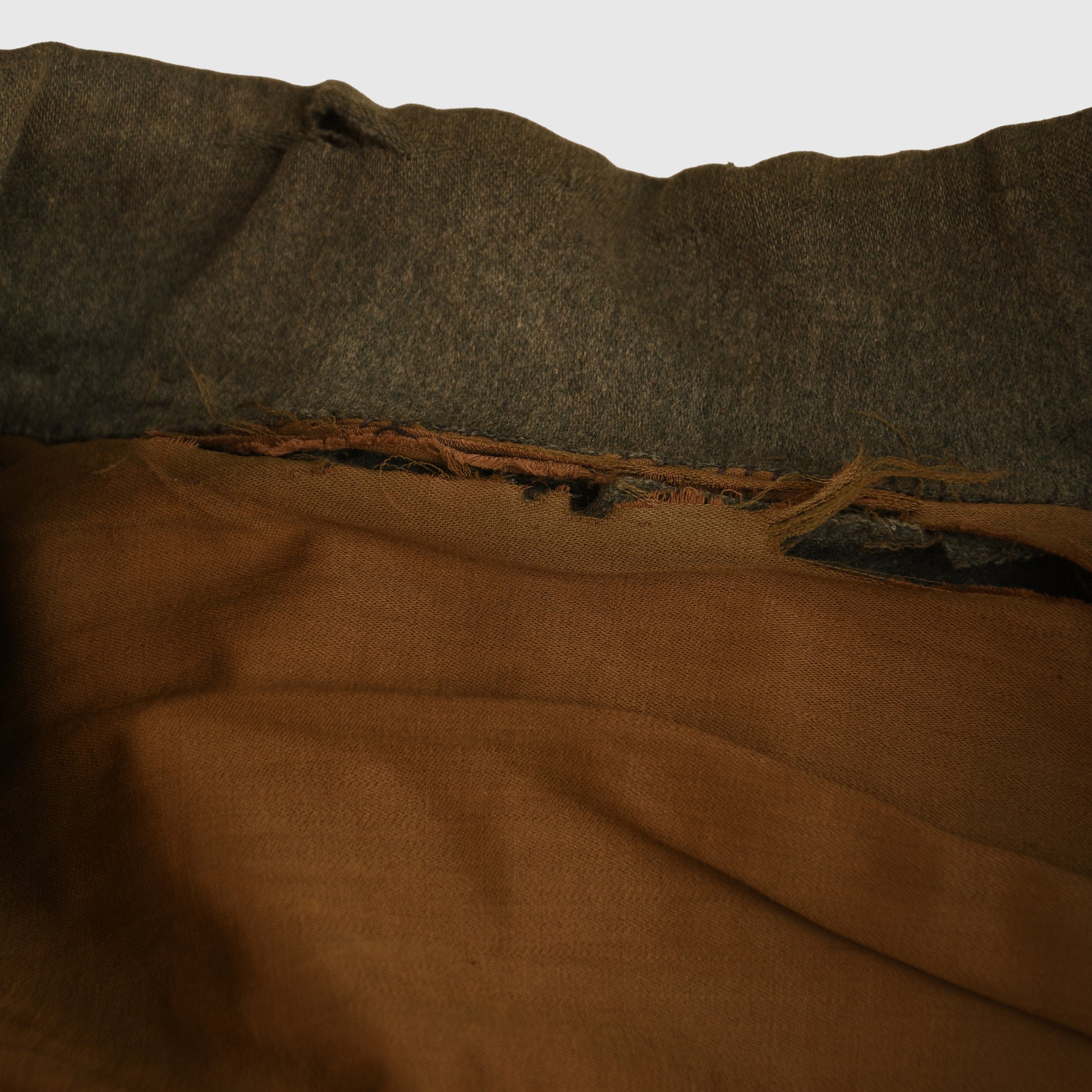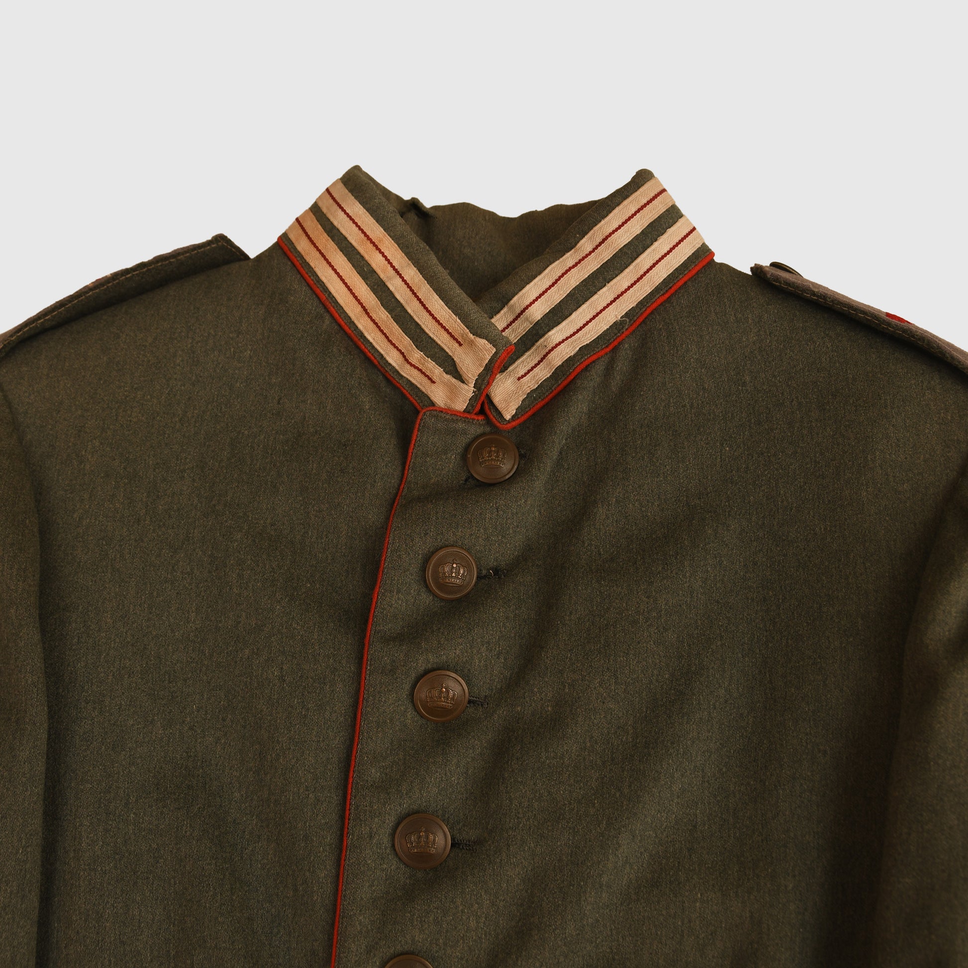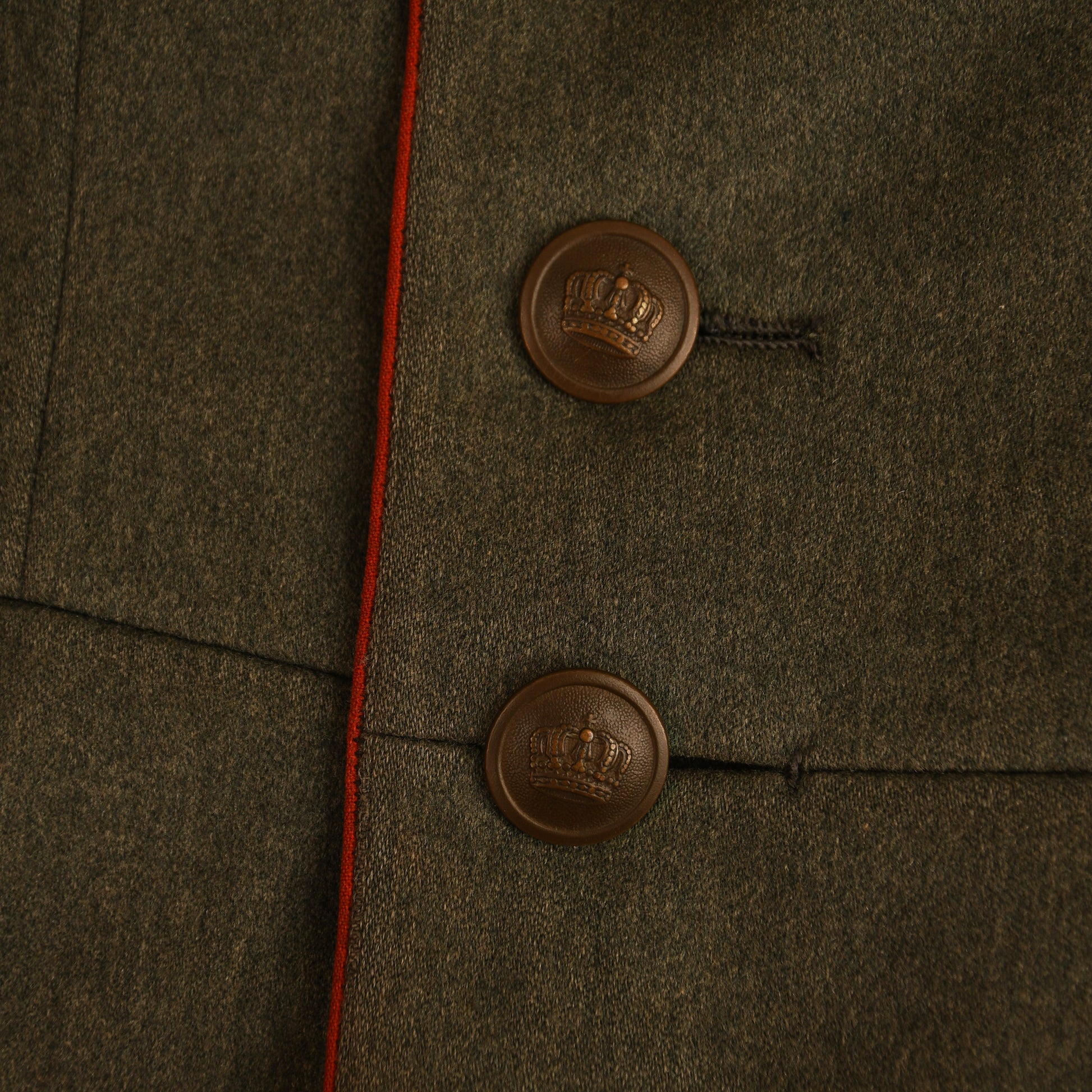 A fine example of a Prussian Guard friedensrock in standard grey-green officer quality material. The long red and white Guard litzen are fitted to the collar, with matching litzen to the lower cuffs, showing only minor loose stitching. All Prussian other ranks hollow back buttons are present and matching. The tunic is fitted with dove grey shoulder boards featuring an applied winged propeller and embroidered number ‘5’ below, denoting the 5th Aviation Unit. Standard red-piped skirted back, with no moth damage anywhere. A very clean and well-preserved example.