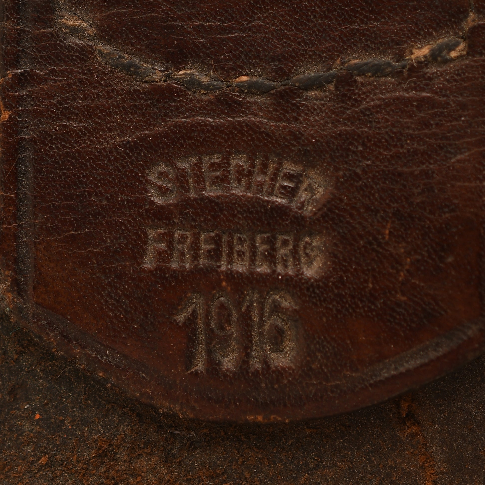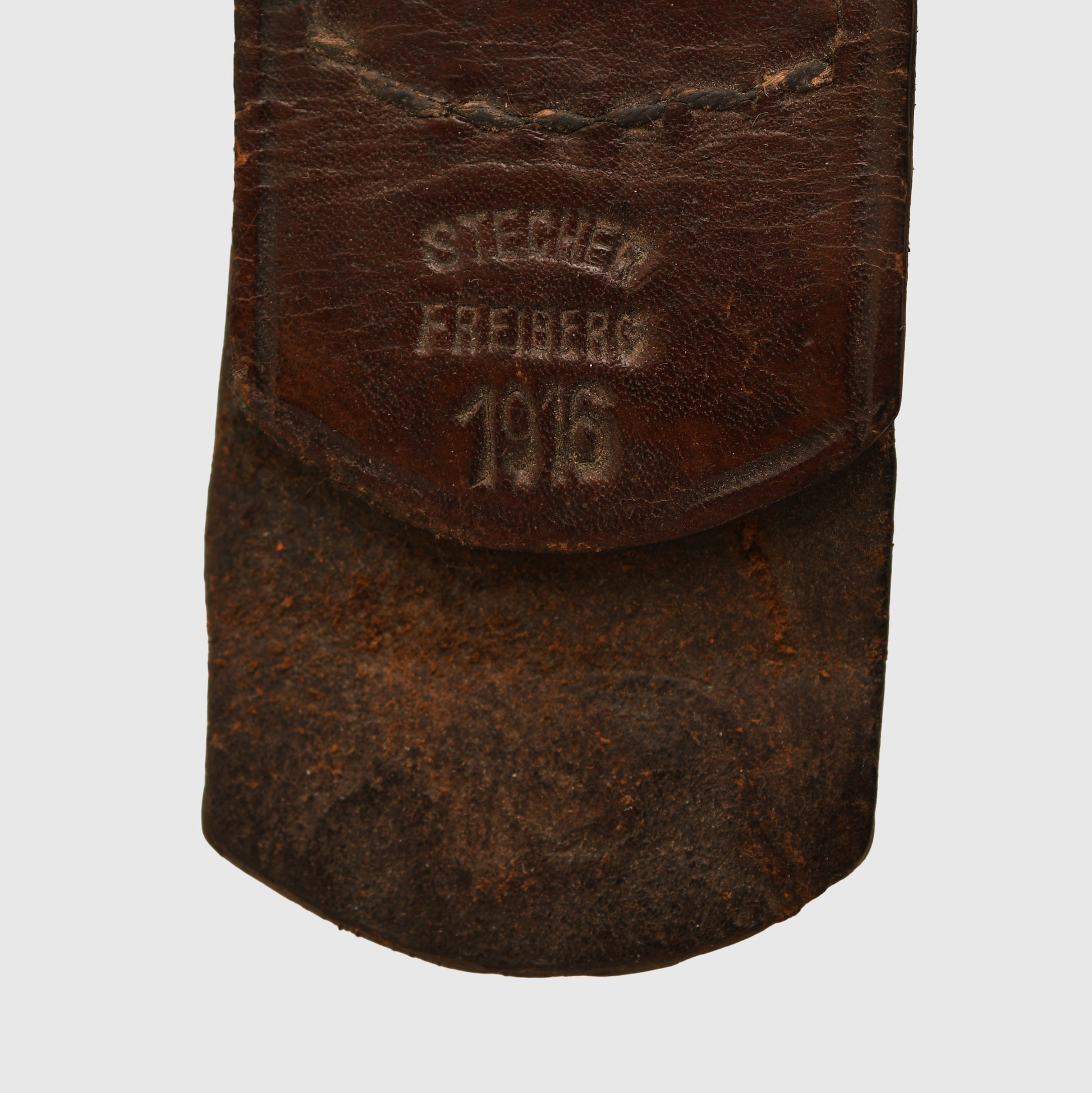 A very good all steel, field grey, one-piece enlisted man’s belt buckle. Complete with its original leather tab, marked to the Prussian Guard Corps and dated 1915. The buckle also features the ‘B.A.G.’ Guards Depot marking, maker’s mark, and an additional 1916 date. Excellent original finish throughout.