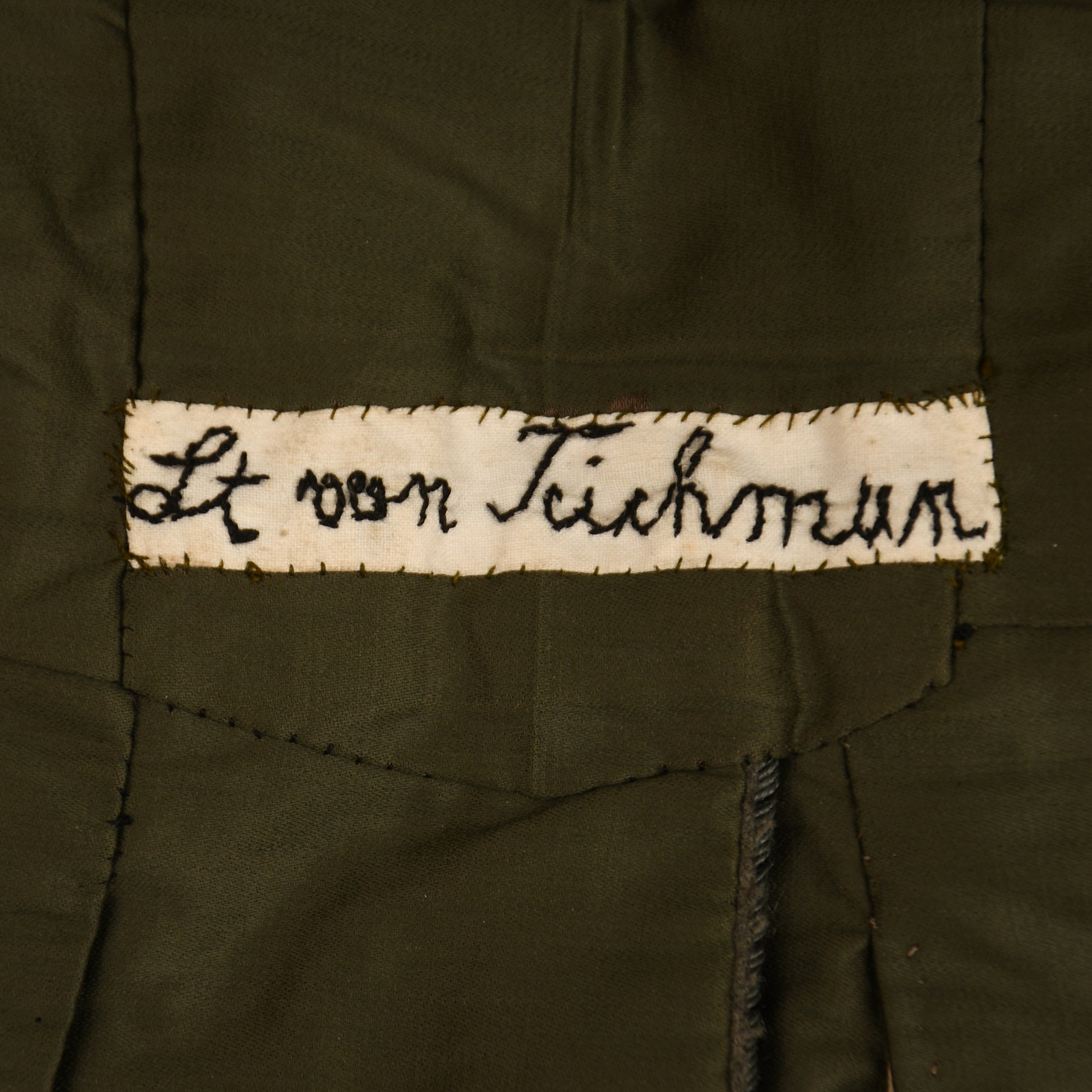 The tunic is adorned with intricate field grey and black lacework across the chest and cuffs, and all original closure olives remain present. The lower left breast features loops for the mounting of an Iron Cross. The shoulder boards are those of a Prussian Lieutenant and are fitted with the regimental number 4. The interior of the tunic contains a name label identifying the original owner as Lieutenant Von Tichman. The two lower pockets are neatly edged in matching field grey and black lace.