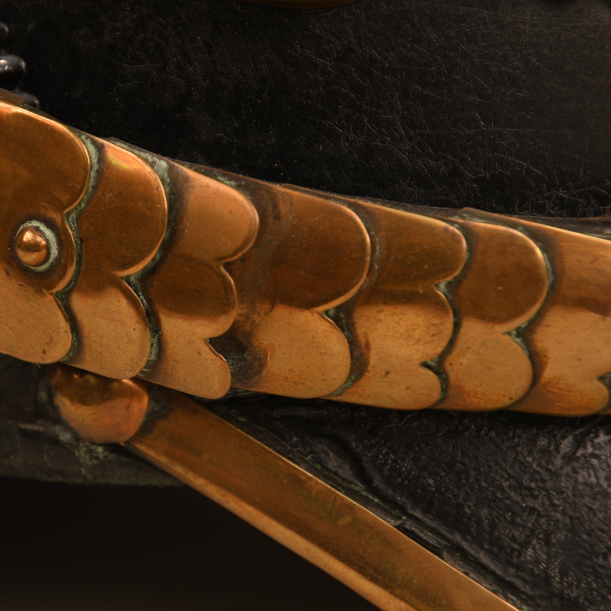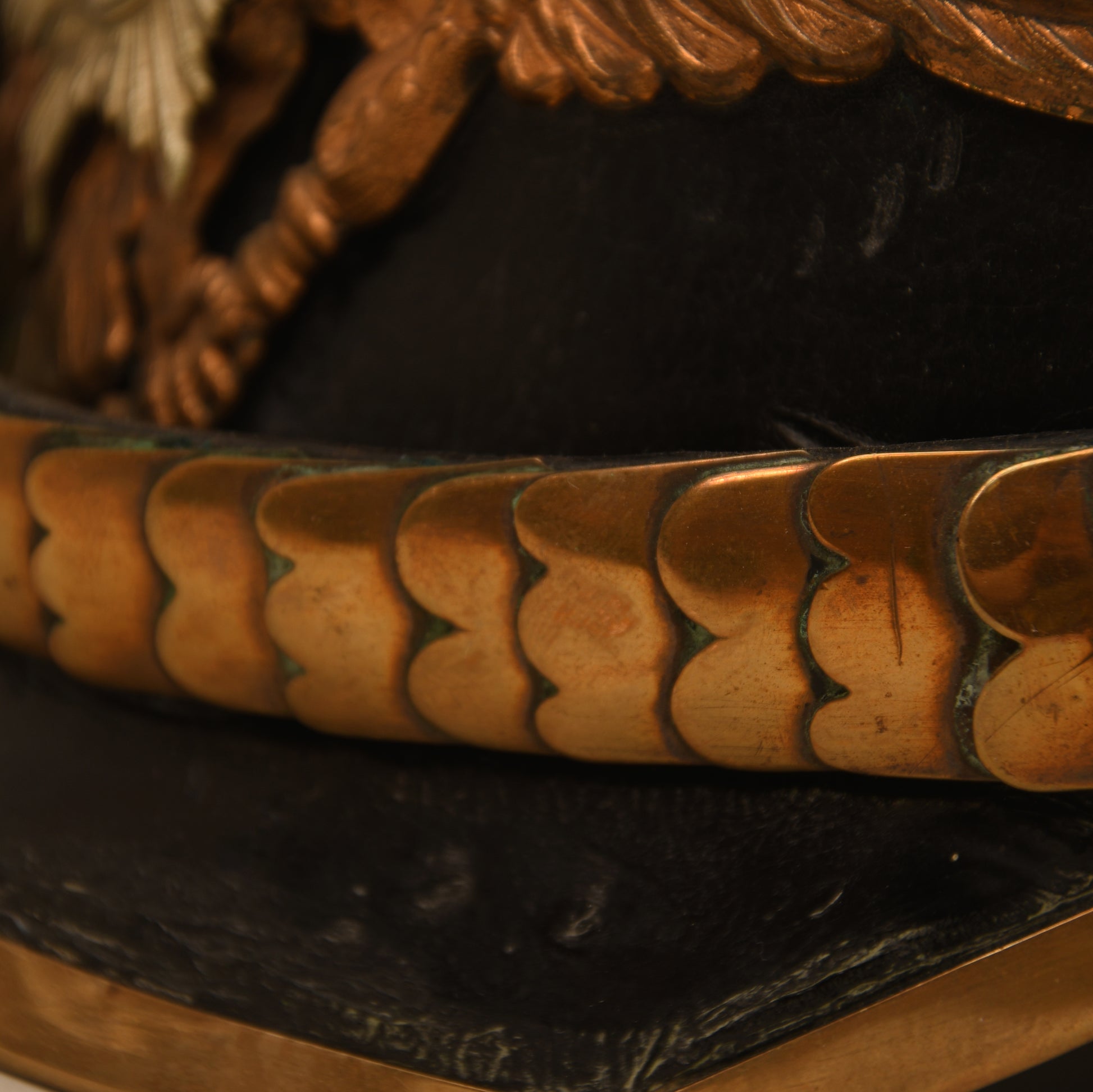 A rare enlisted man’s leather pickelhaube for the Lieb Gendarmerie. Fine quality leather skull, size approximately 55, with all fittings matching in colour. Complete with clip-over chin scales, square-cut front peak, and both cockades. The interior liner remains in virtually unworn condition and is marked LG 15 (Land Lothringen) to the skull. A scarce helmet in excellent condition.