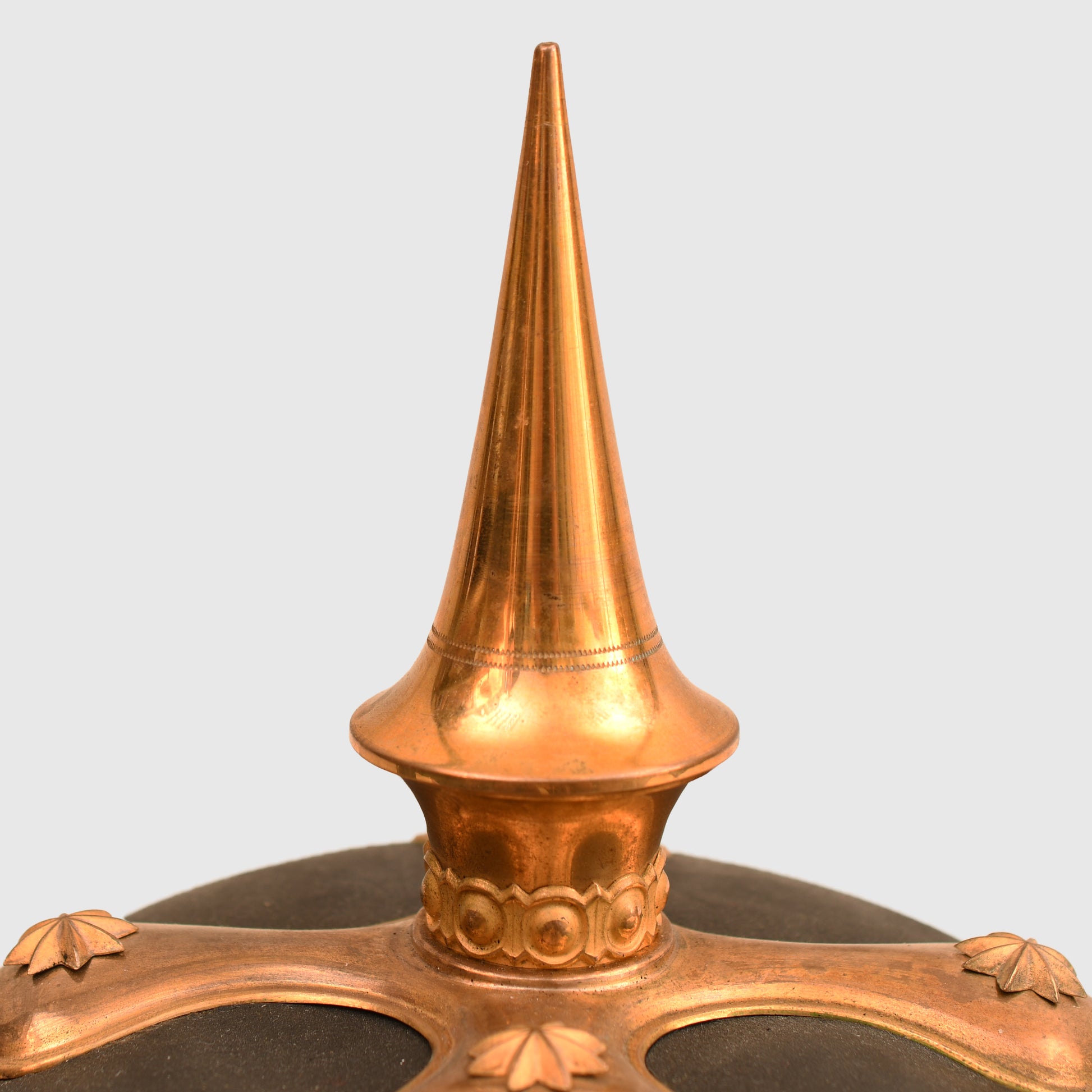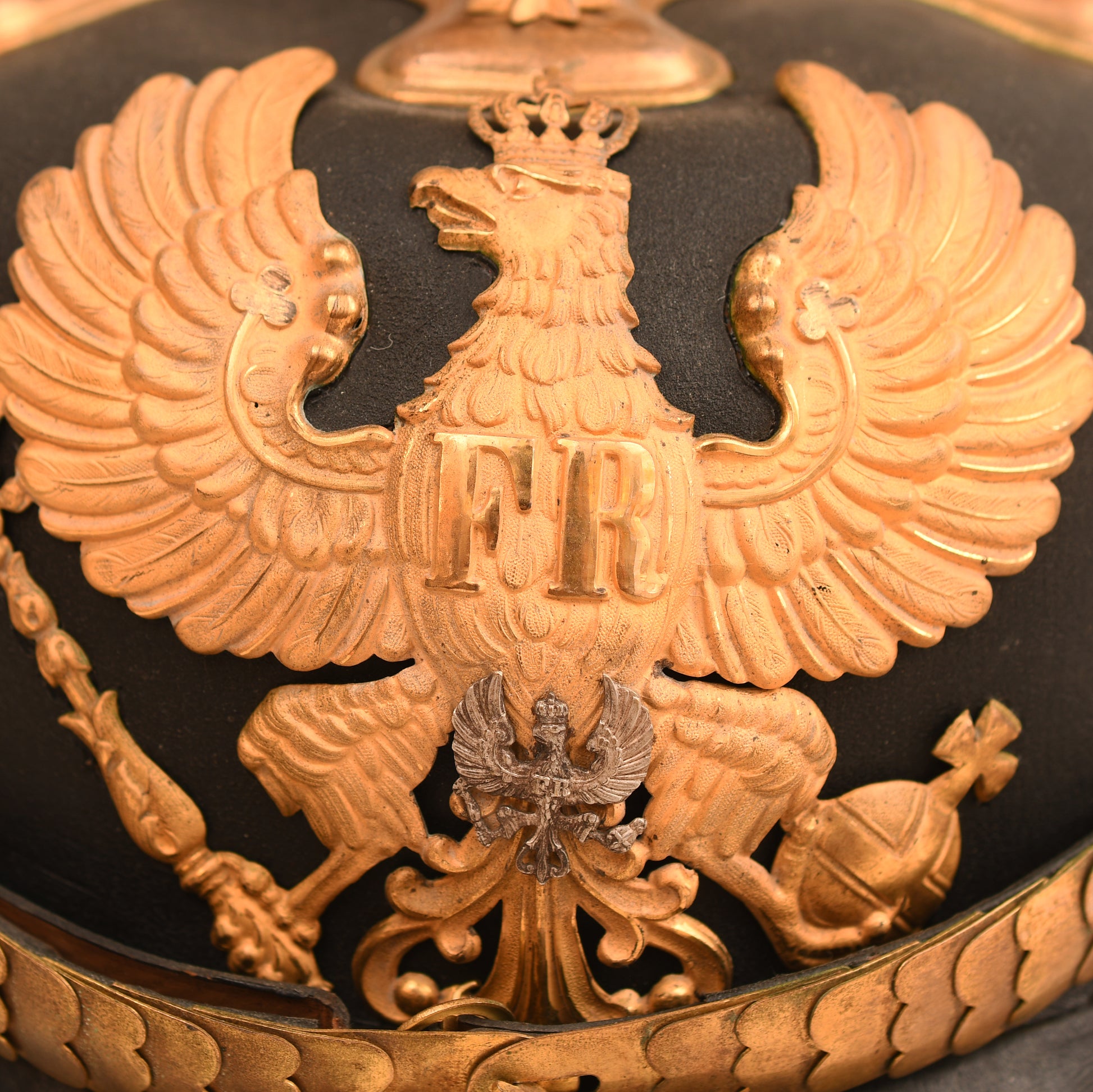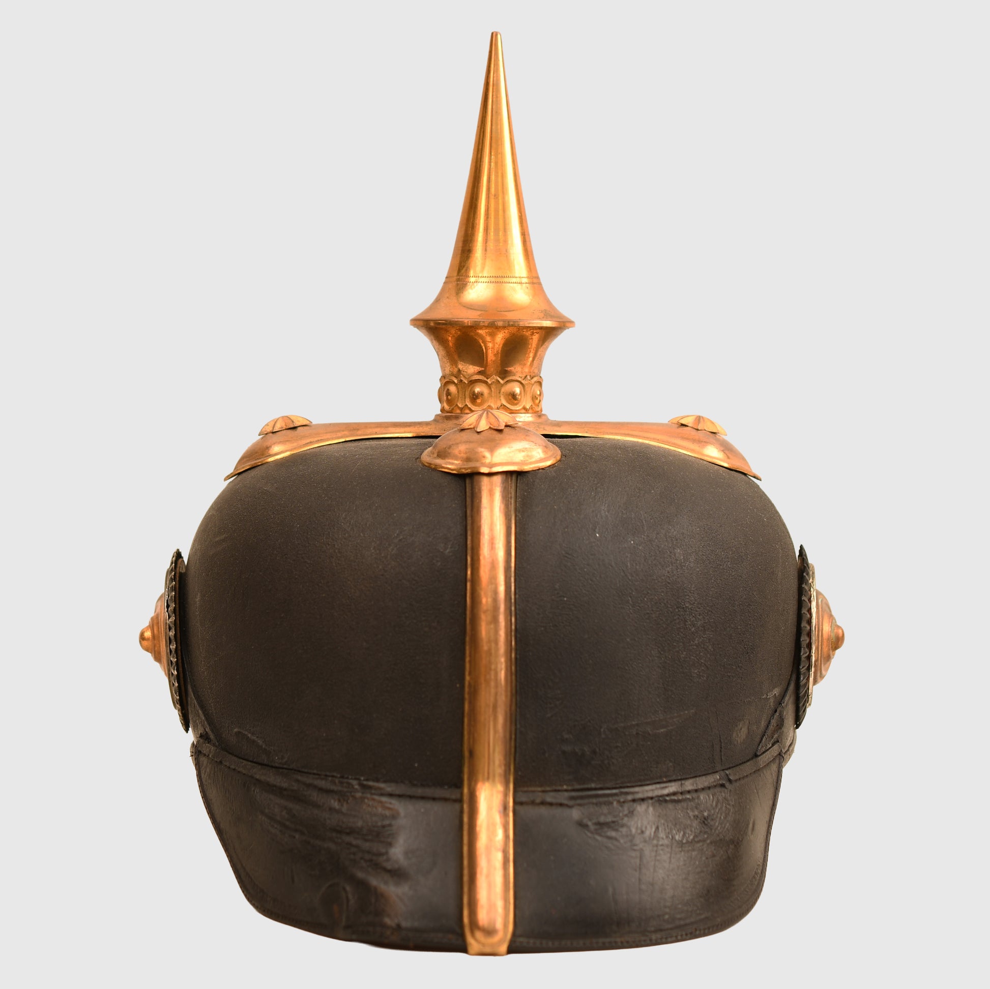 An exceptional all-leather Prussian officers pickelhaube in magnificent condition. The main body has naturally aged to a soft satin patina, typical of high-quality leather examples, with front and rear peaks securely attached, both showing natural congealing of the leather.