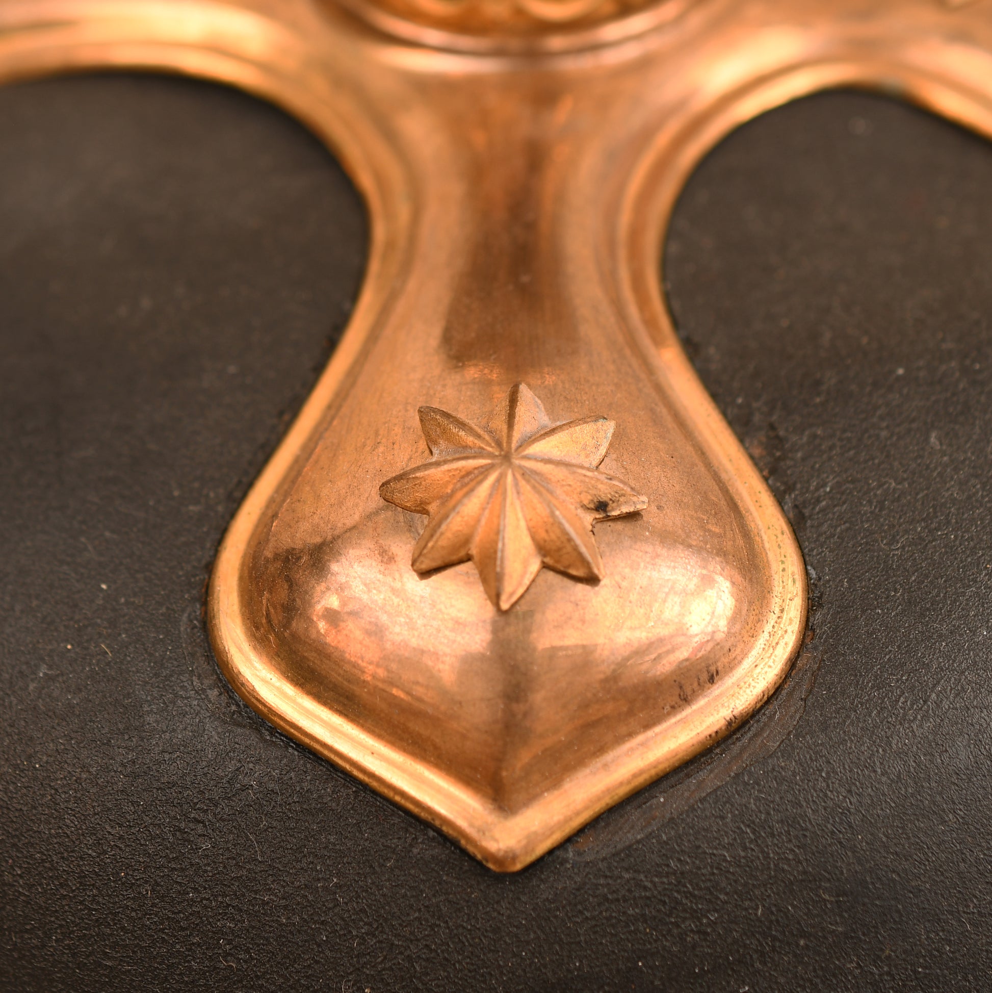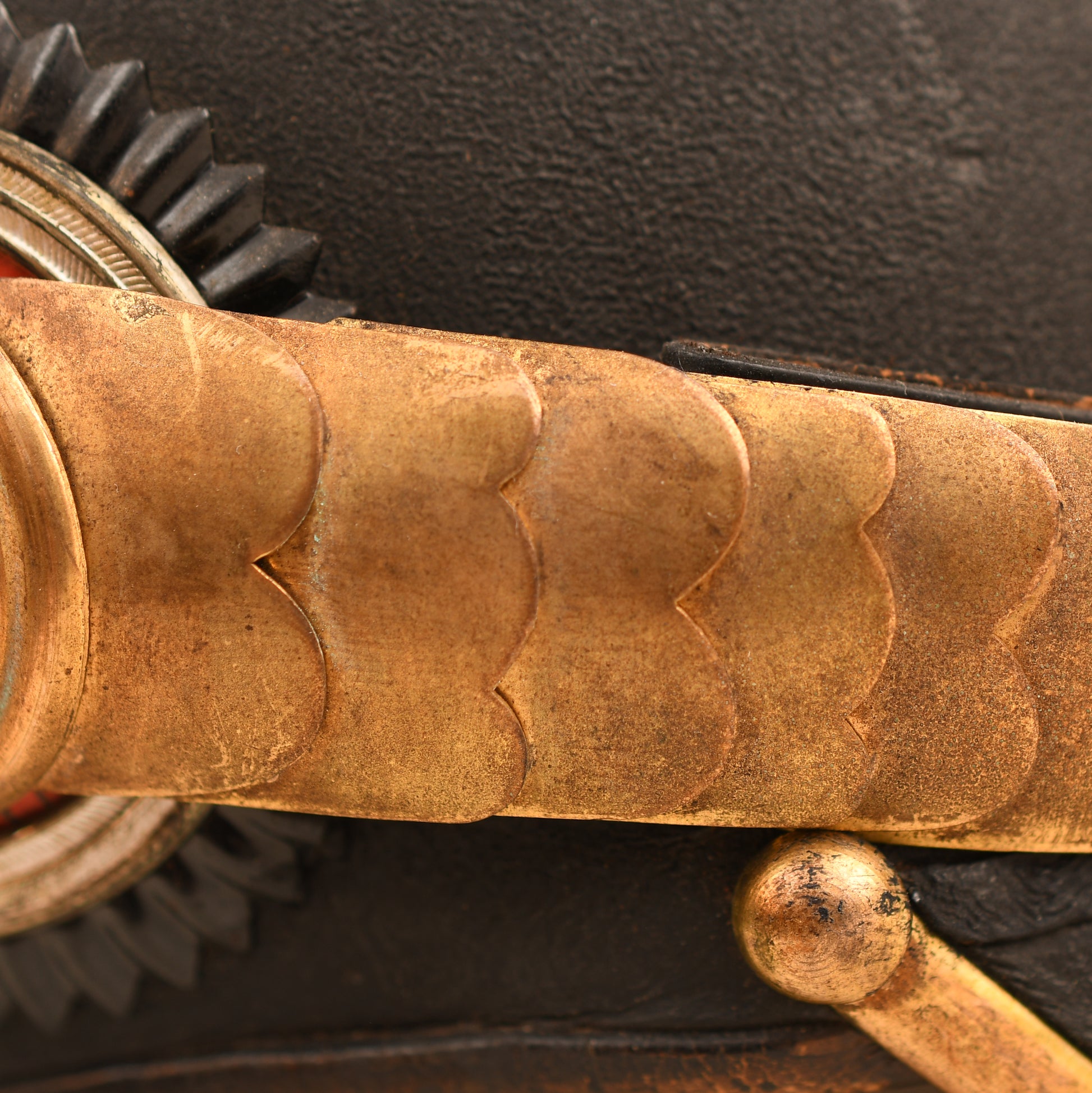 The gilt fittings—including the removable spike, spike base, cruciform, stars, back strap, Prussian front plate, domed chin scales, and front square-edged peak trim—remain excellent. The helmet is fitted with its correct officer-quality national and state cockades.