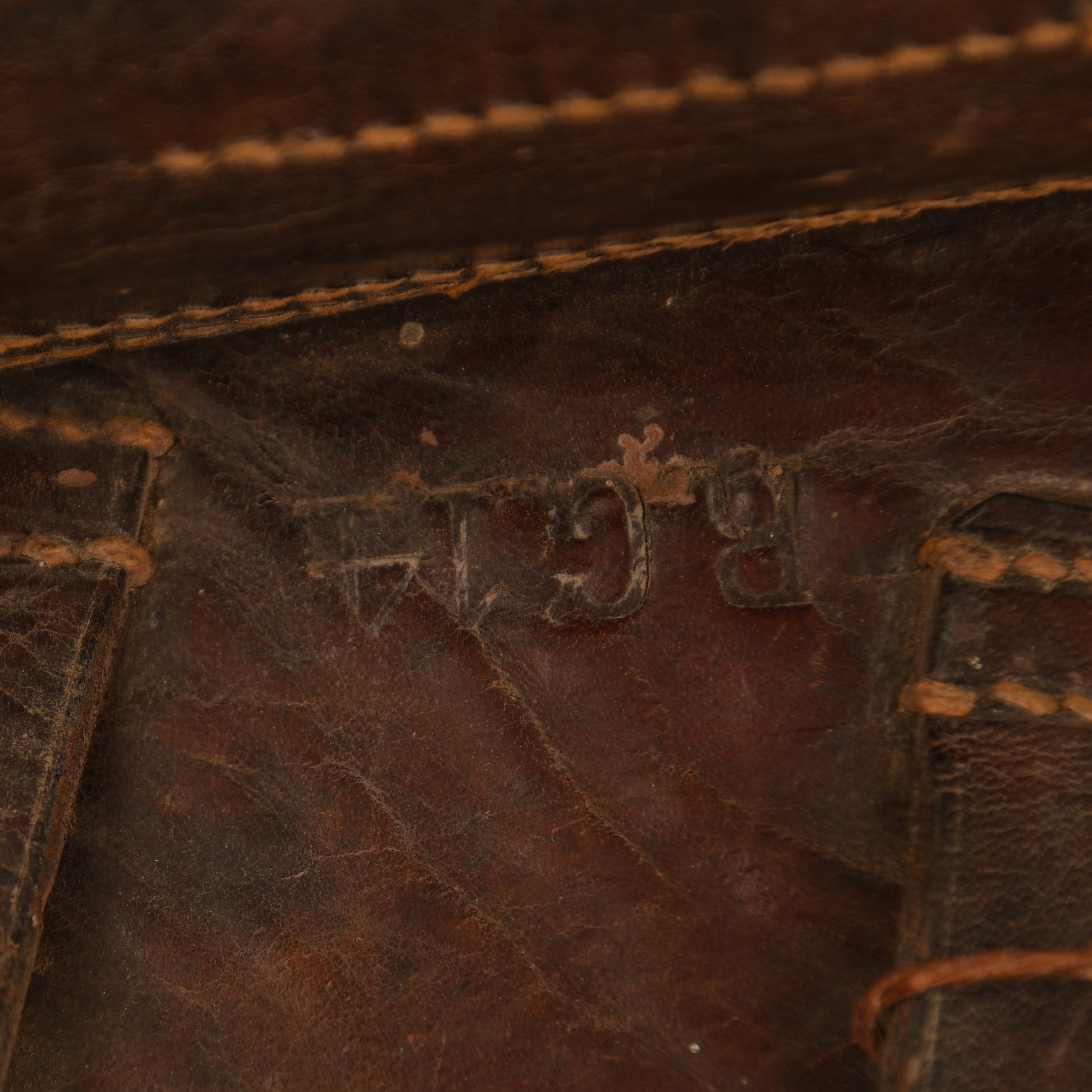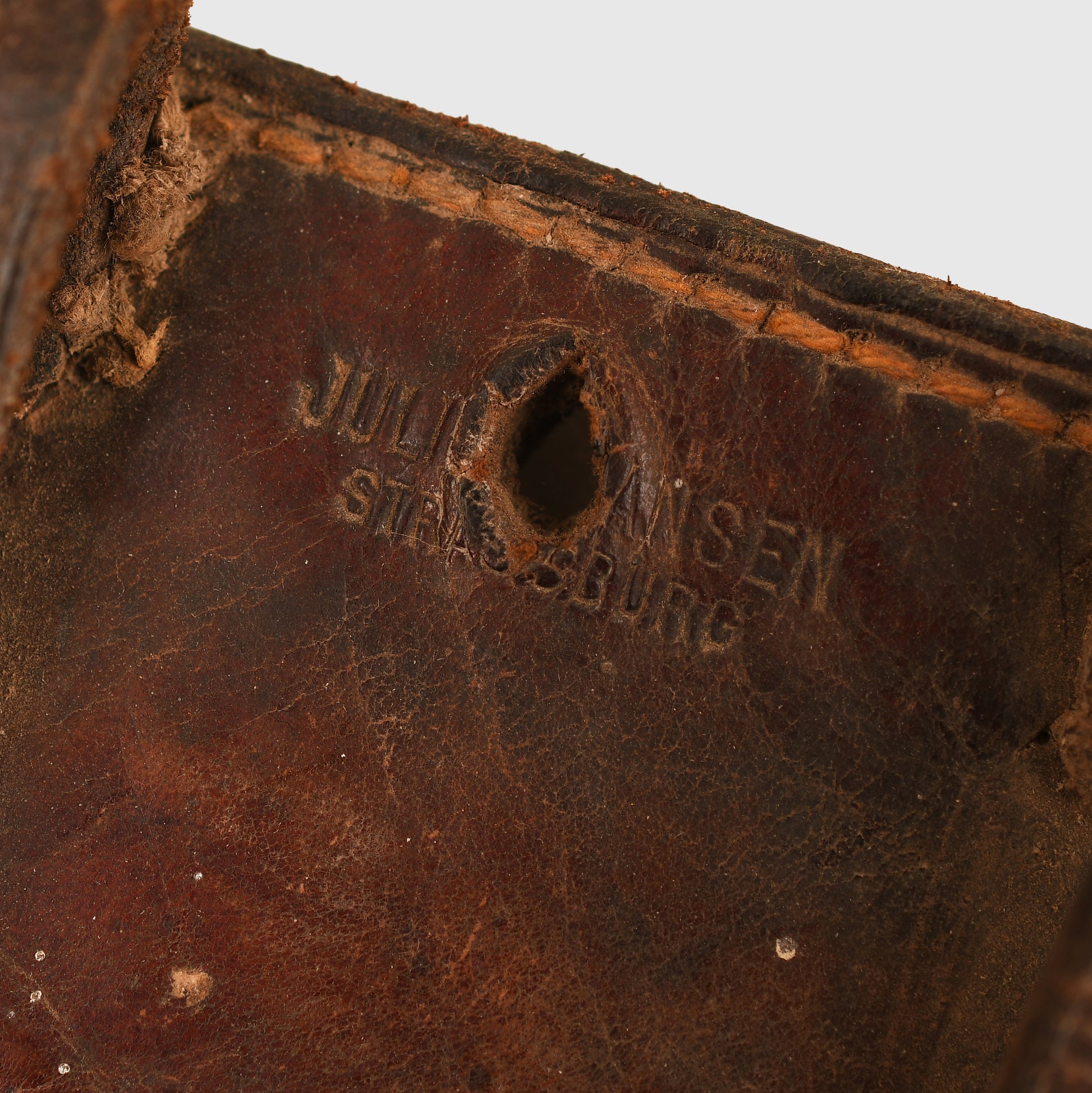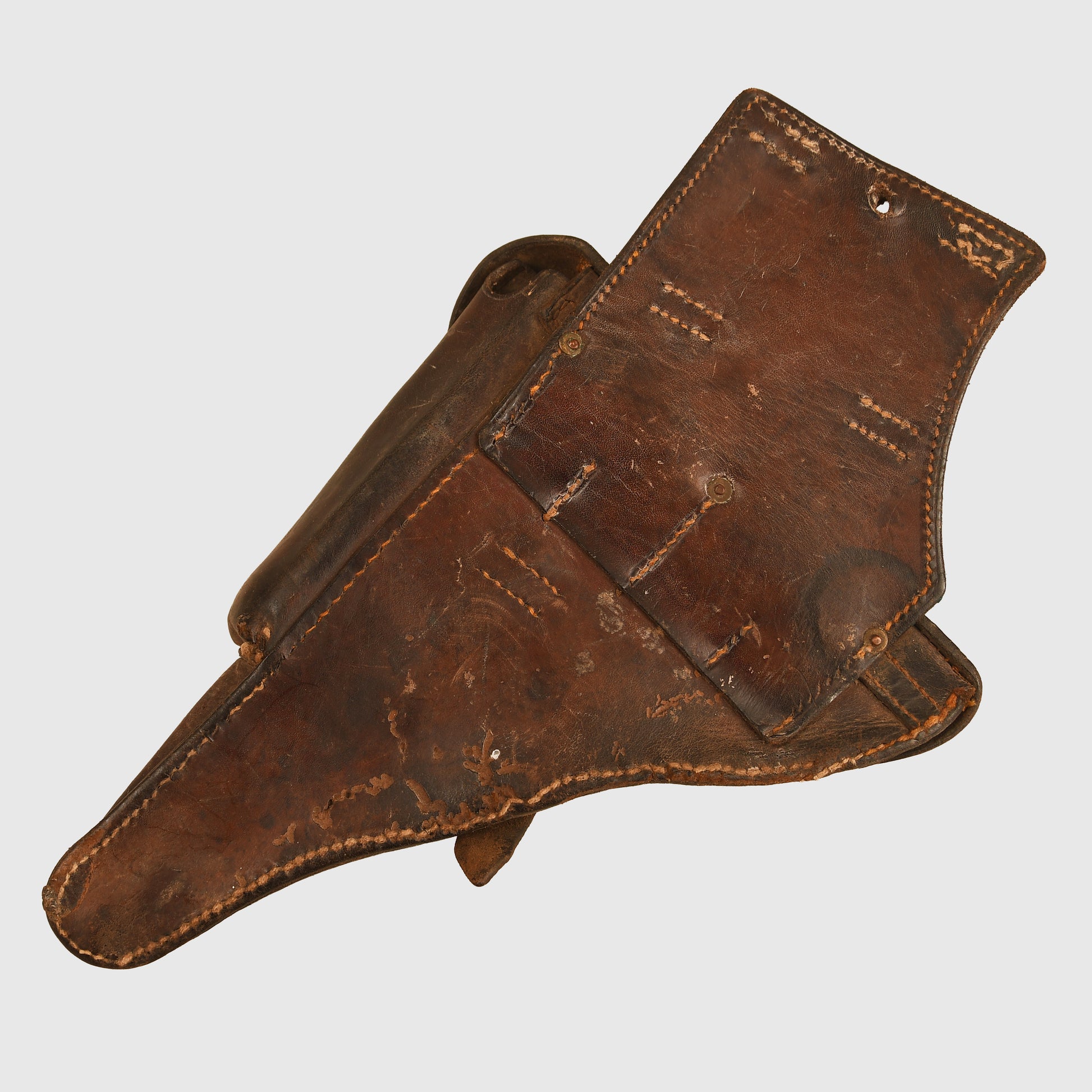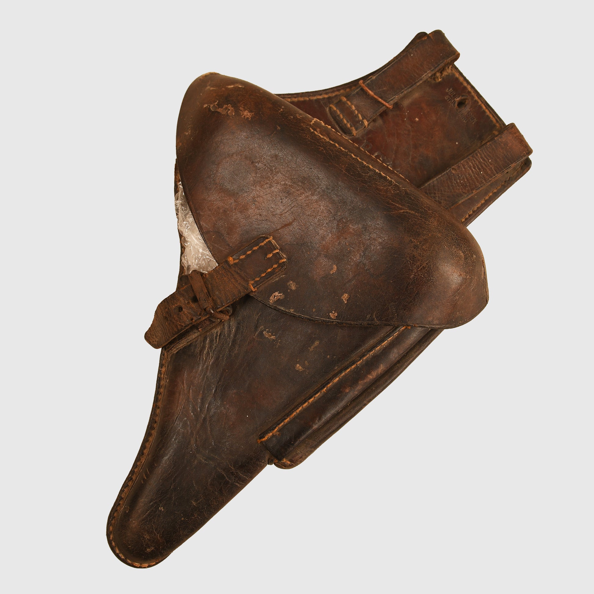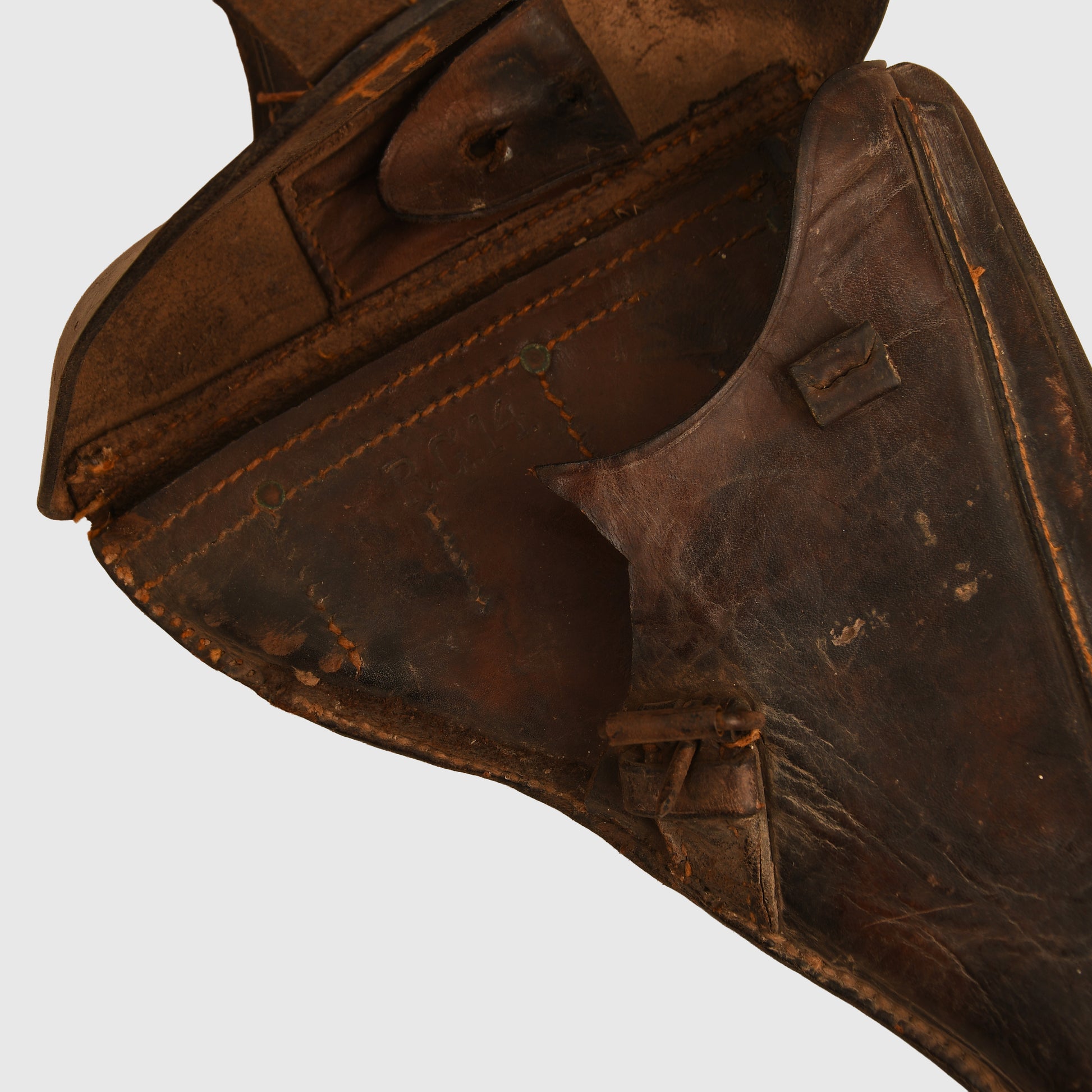 A very rare holster designed for the Reich Gendarmerie, modeled on the standard Luger P08 holster but with an added rear suspension system, both stitched and riveted to the main body. It features a forward-facing belt loop system intended for mounted troops. The stitching is strong and intact, with both belt loops present. The maker’s name, marked in Strasbourg, has a puncture through it. The back strap is marked ‘R.G.14’ and the interior of the holster carries the same unit marking. A small section of the holster appears to have been cut away, possibly to accommodate a different pistol. Complete with its original closing strap, this is an exceptionally rare Luger accessory, issued to the occupation police of Alsace-Lorraine between 1870 and 1918.