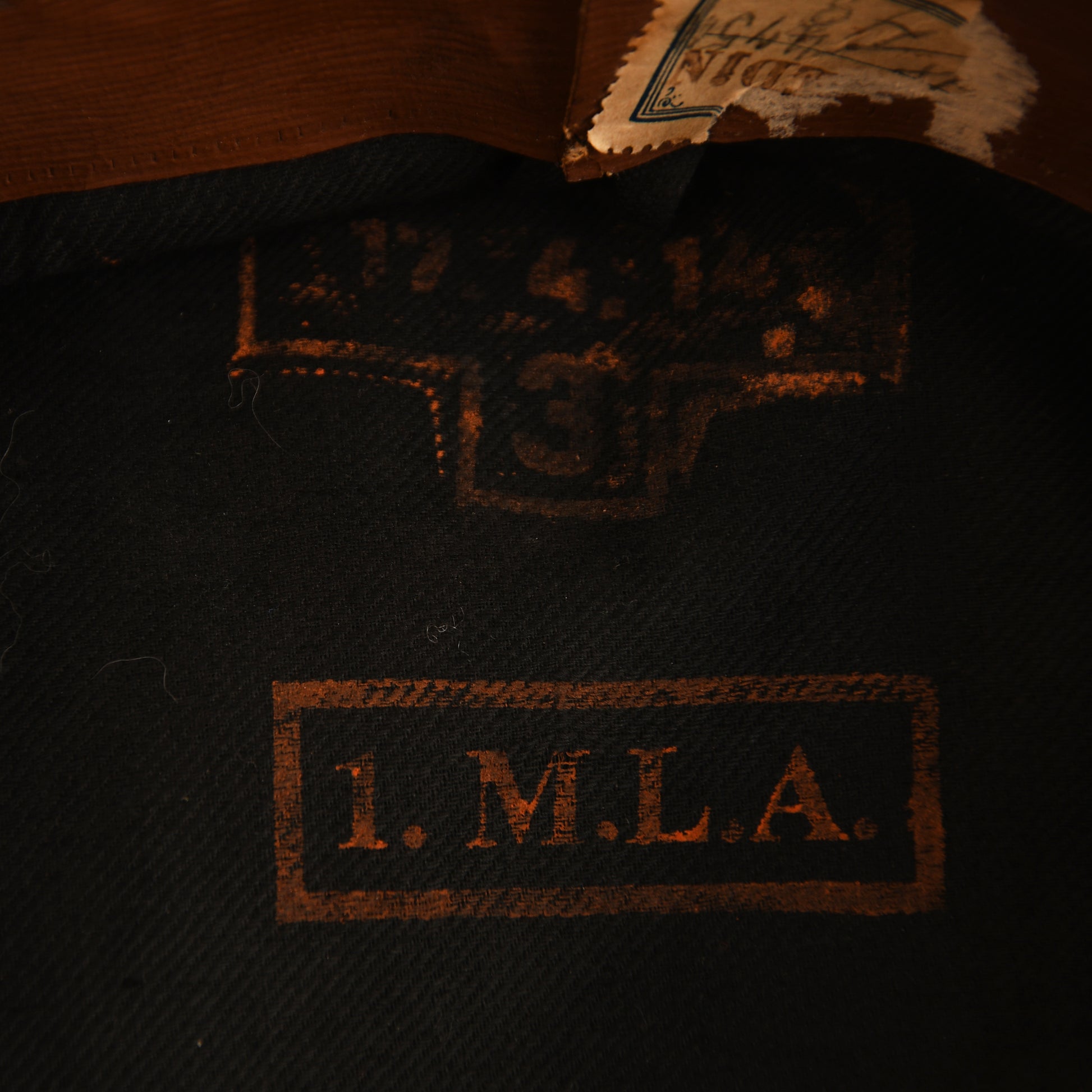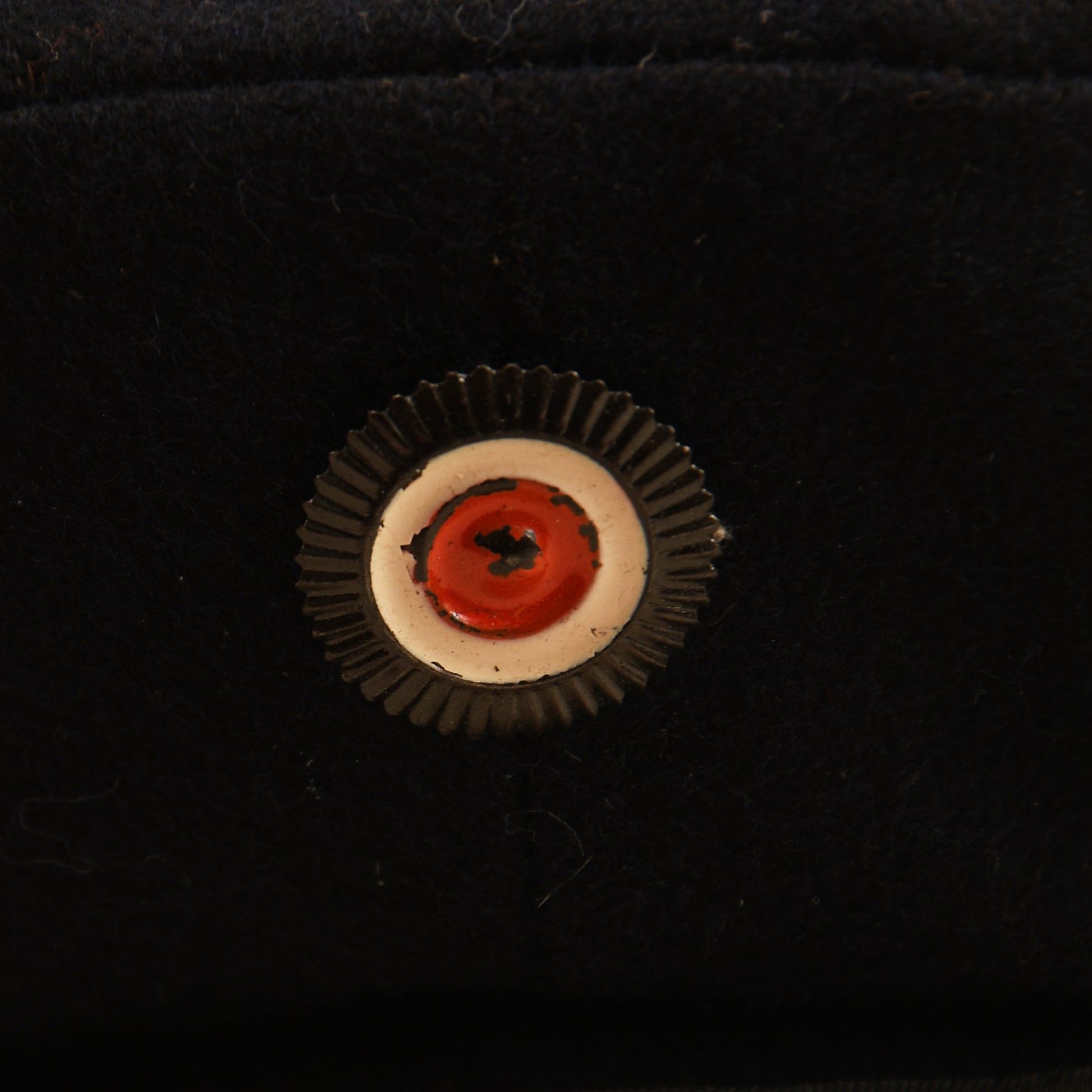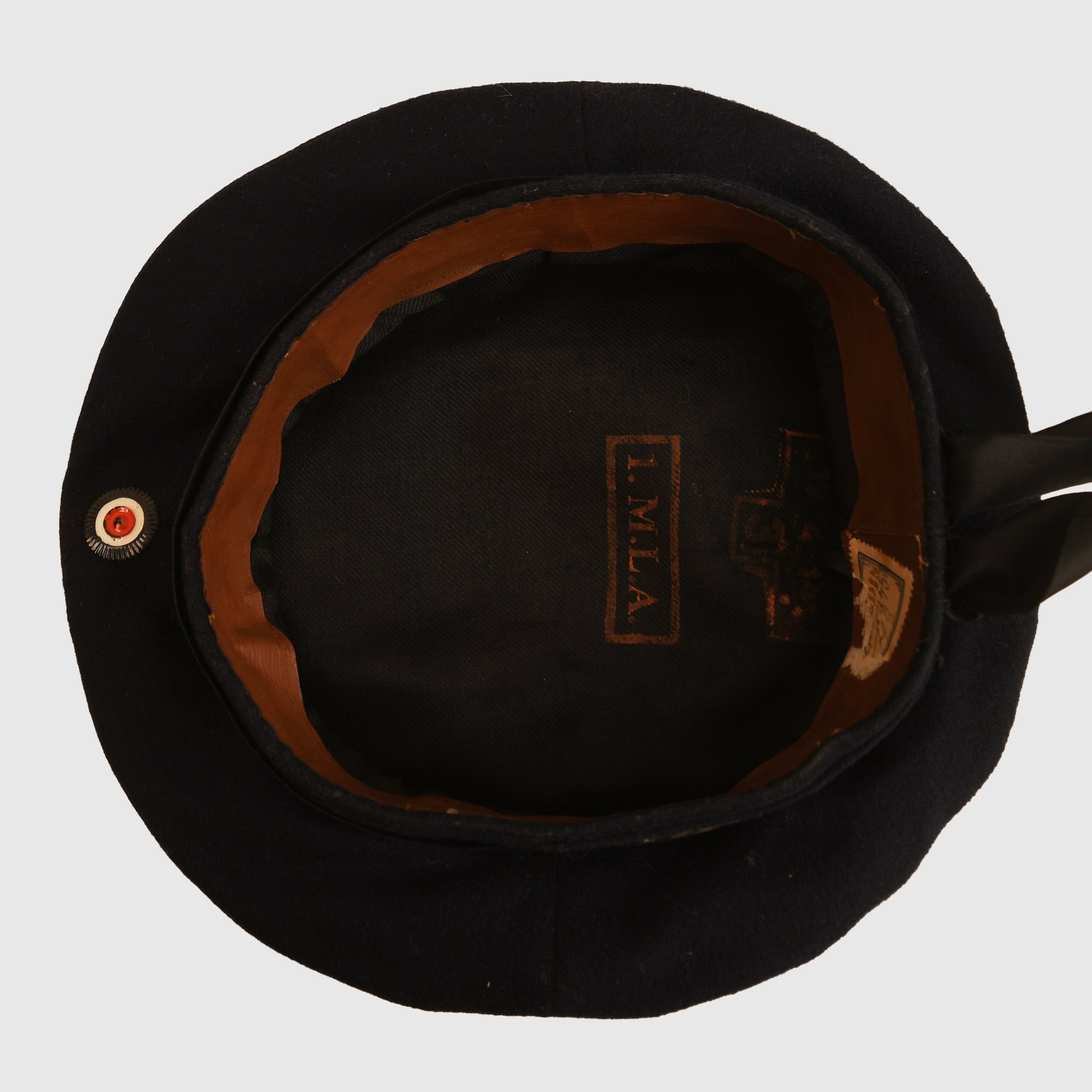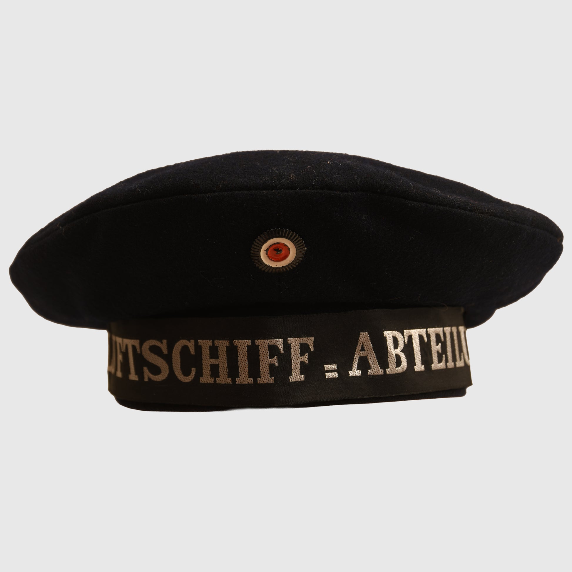 An exceptionally rare First World War Reich Marine deck cap, worn by members of the Zeppelin airship units. Constructed in dark blue cloth and in excellent condition throughout, free from moth or damage. Small size, approximately 53. The cap is fitted with its original and highly desirable tally embroidered ‘II. Marine Luftschiffer Abteilung. II’ in Roman numerals, with full-length tails still present. To the interior, it retains its complete leather sweatband, the faint remains of a paper label, and is clearly marked ‘B.A. (possibly R)’ for Reich Marine, dated 17th April 1914, with an additional block stamp ‘1.M.L.A.’ (1st Marine Luftschiffer Abteilung). Finished with its single Reich Marine national cockade. A very scarce and fine example of Zeppelin unit headgear.