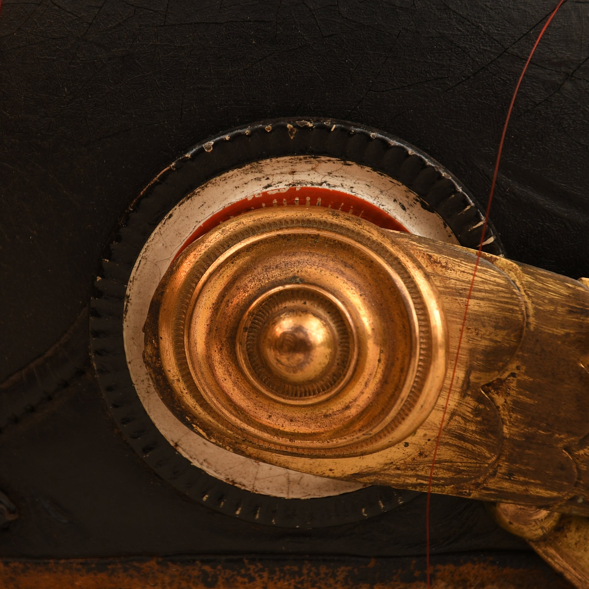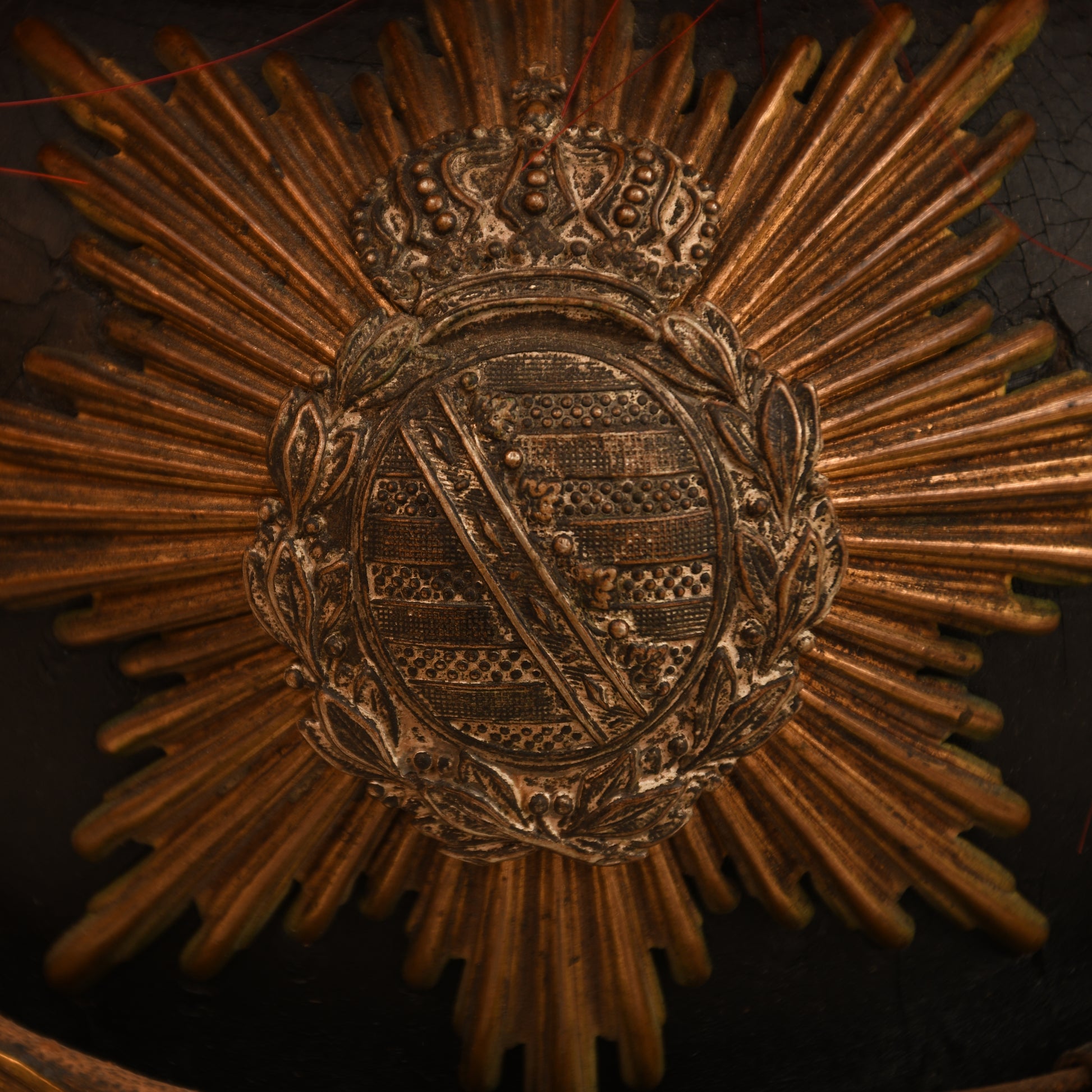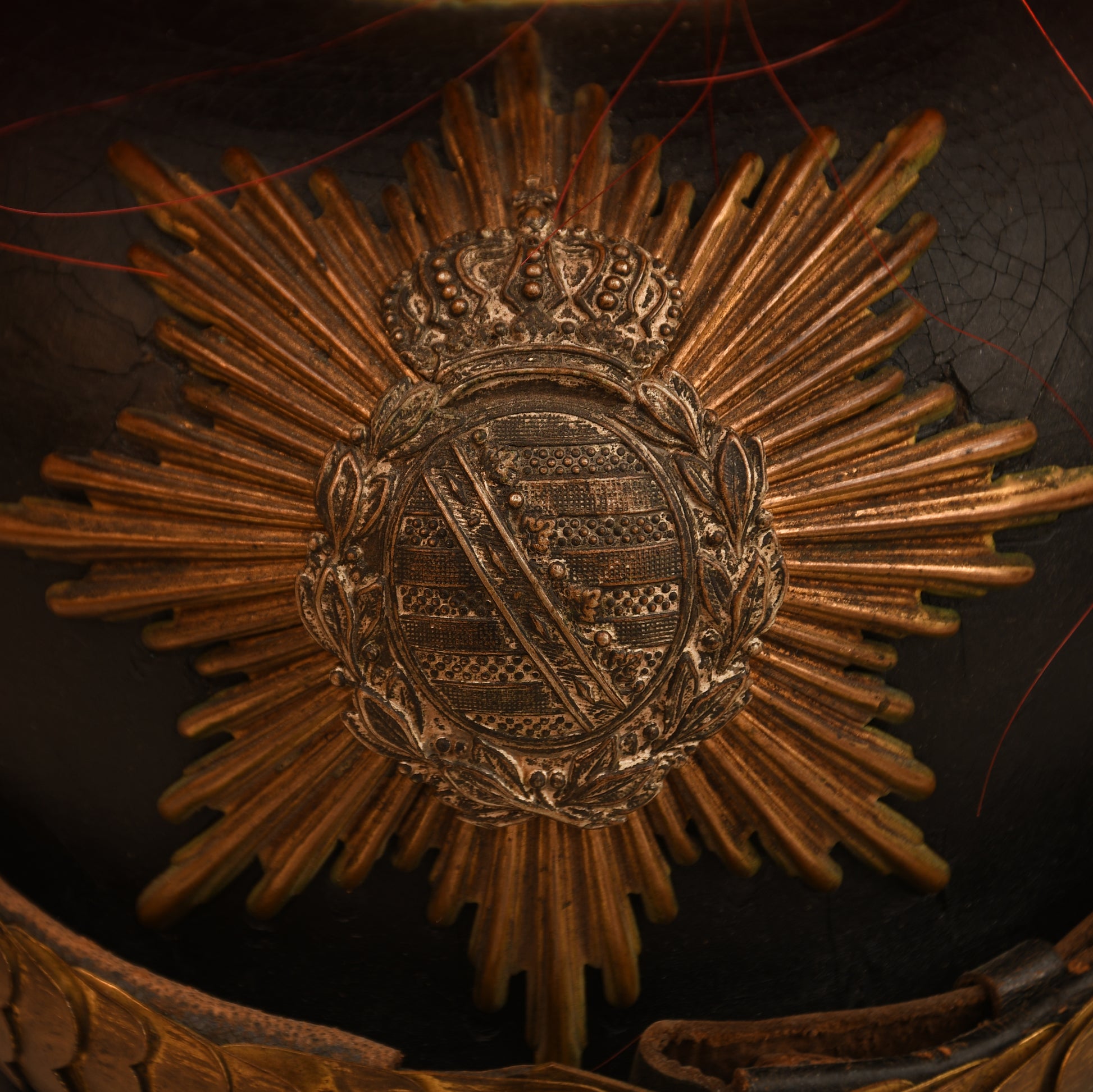 All-leather skull showing slight overall crazing, with both front and rear peaks securely attached. Subdued gilt finish throughout. Fitted with Saxon non-serrated national and state cockades, domed plume holder fittings, and domed artillery chin scales. Includes original red parade plume.