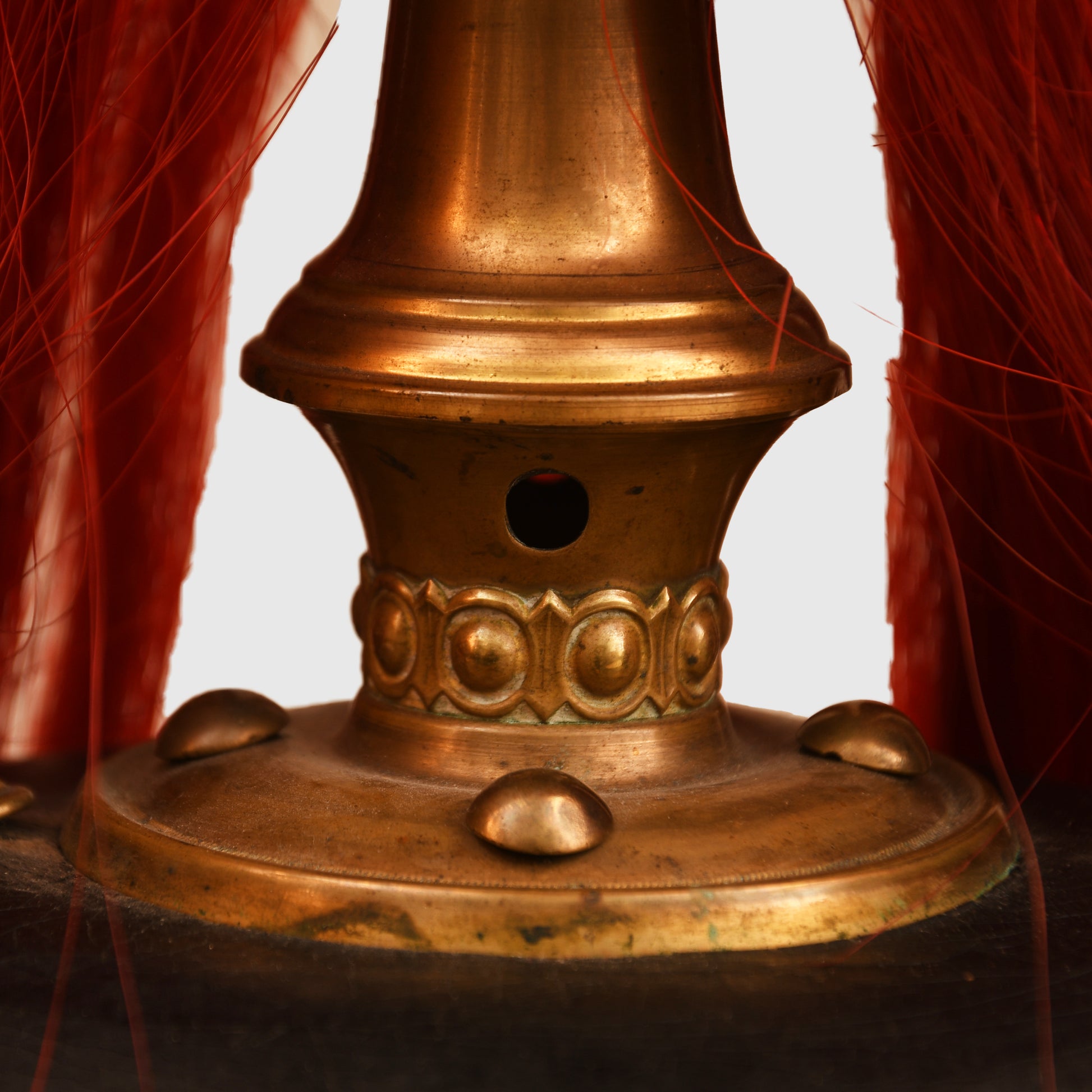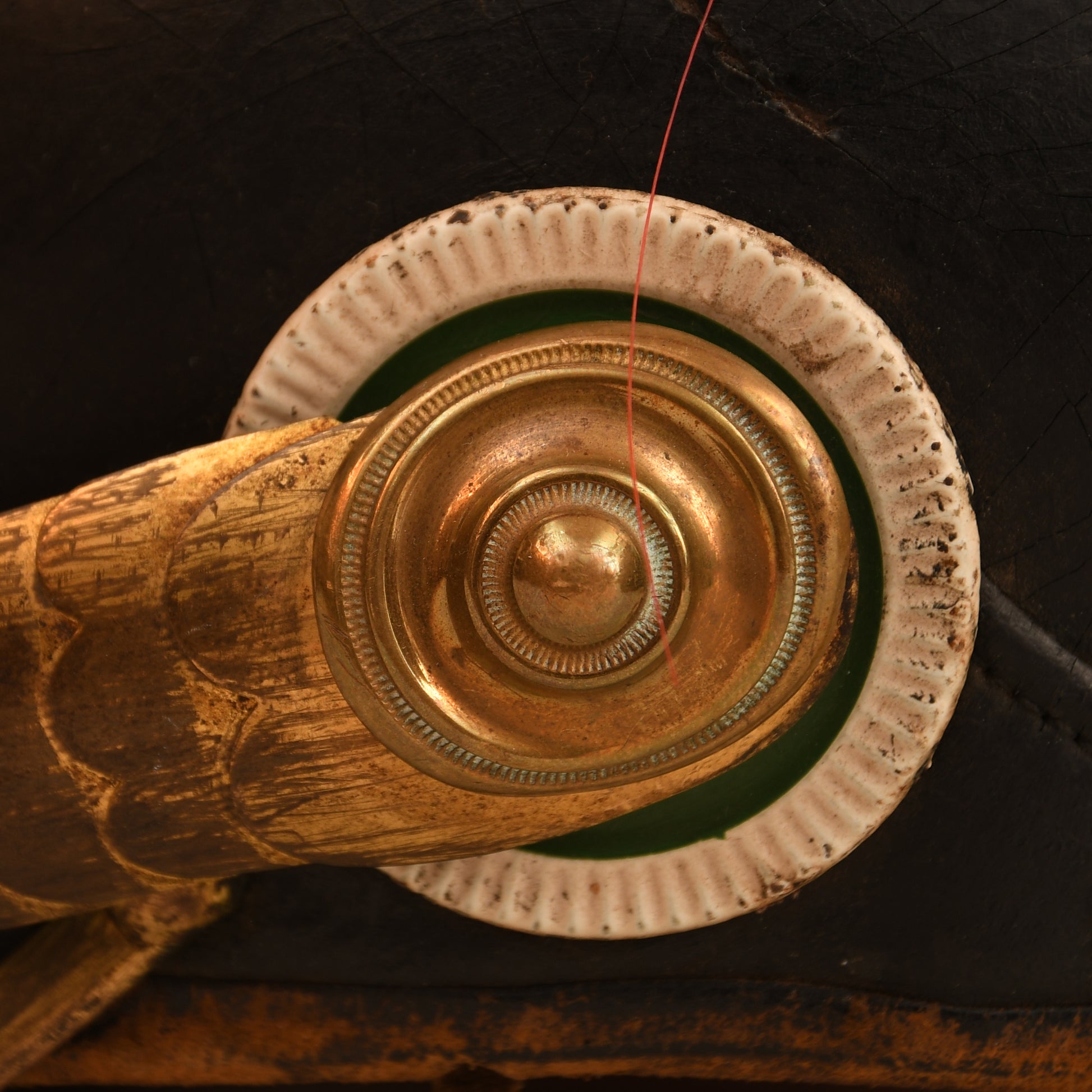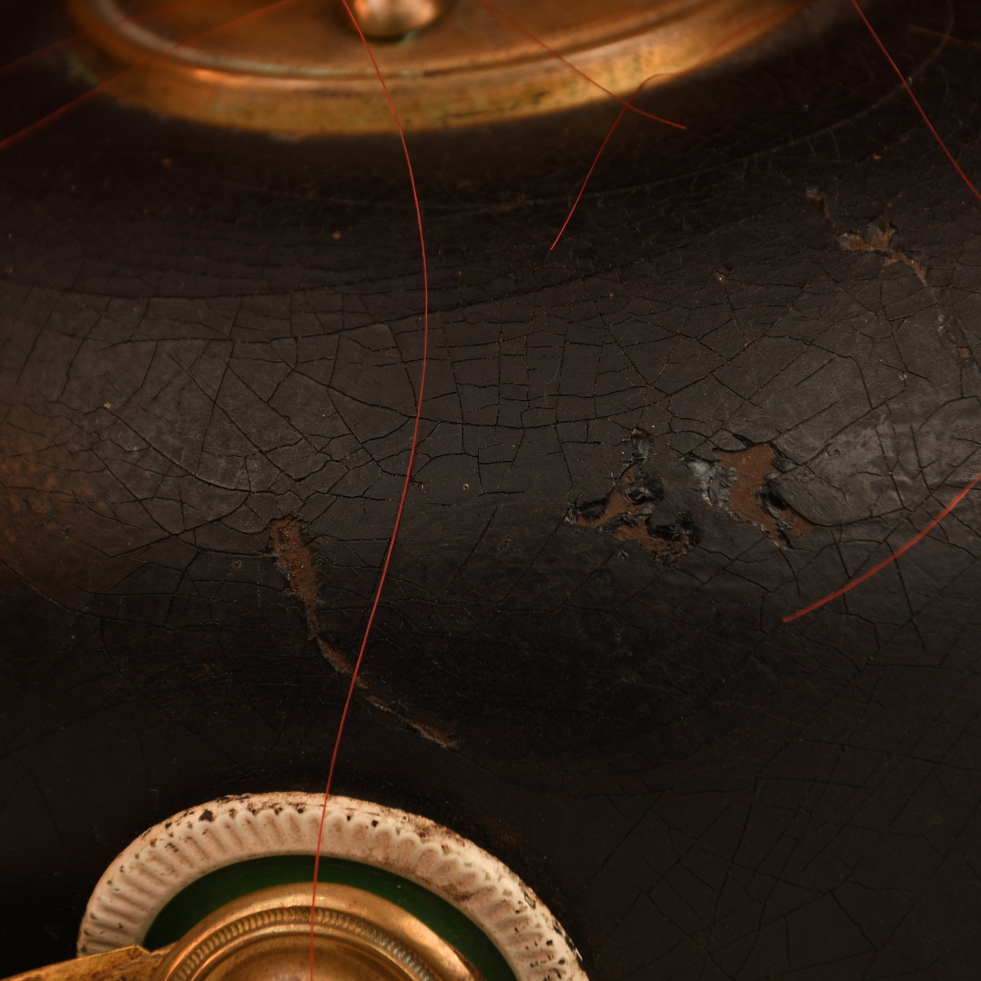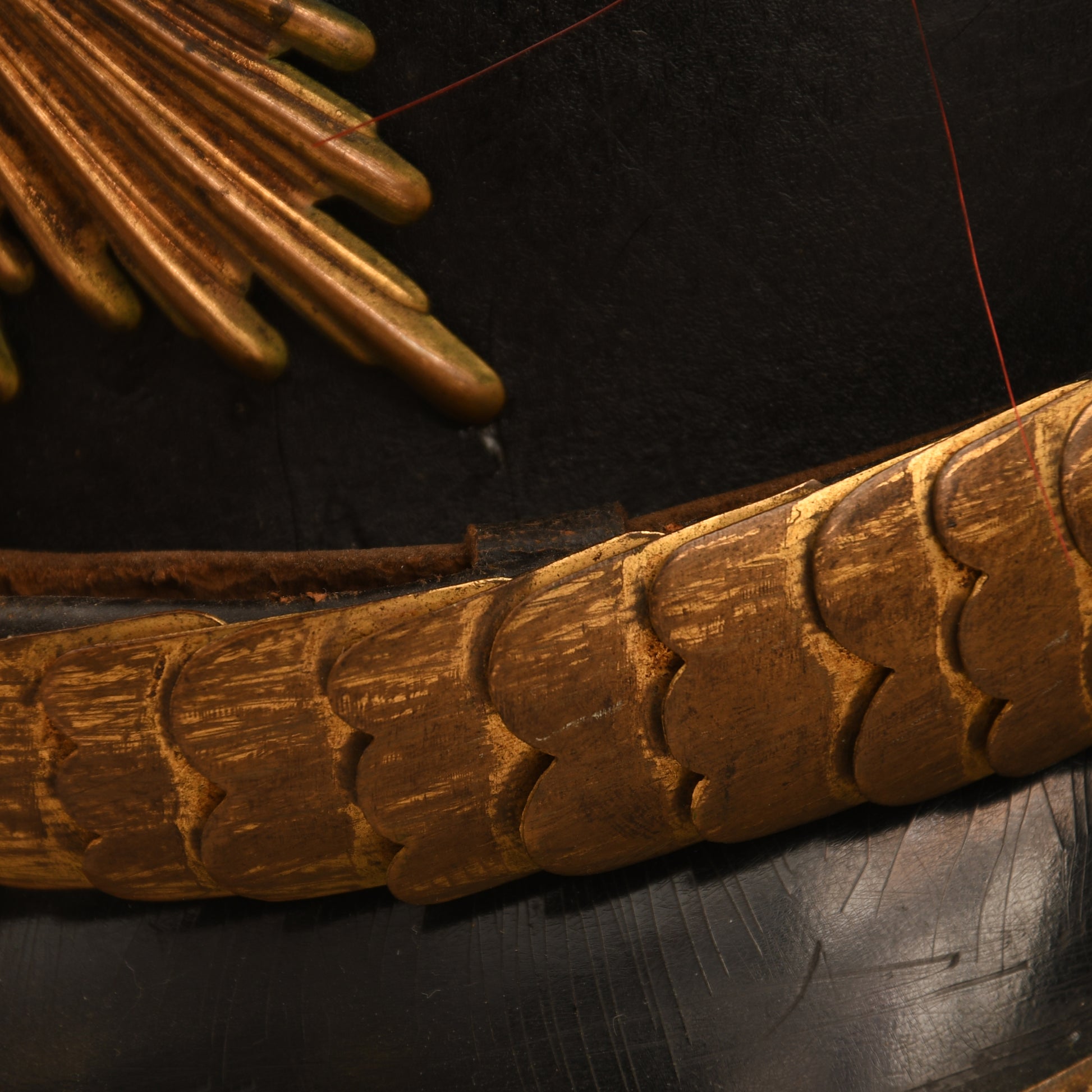 All-leather skull showing slight overall crazing, with both front and rear peaks securely attached. Subdued gilt finish throughout. Fitted with Saxon non-serrated national and state cockades, domed plume holder fittings, and domed artillery chin scales. Includes original red parade plume.