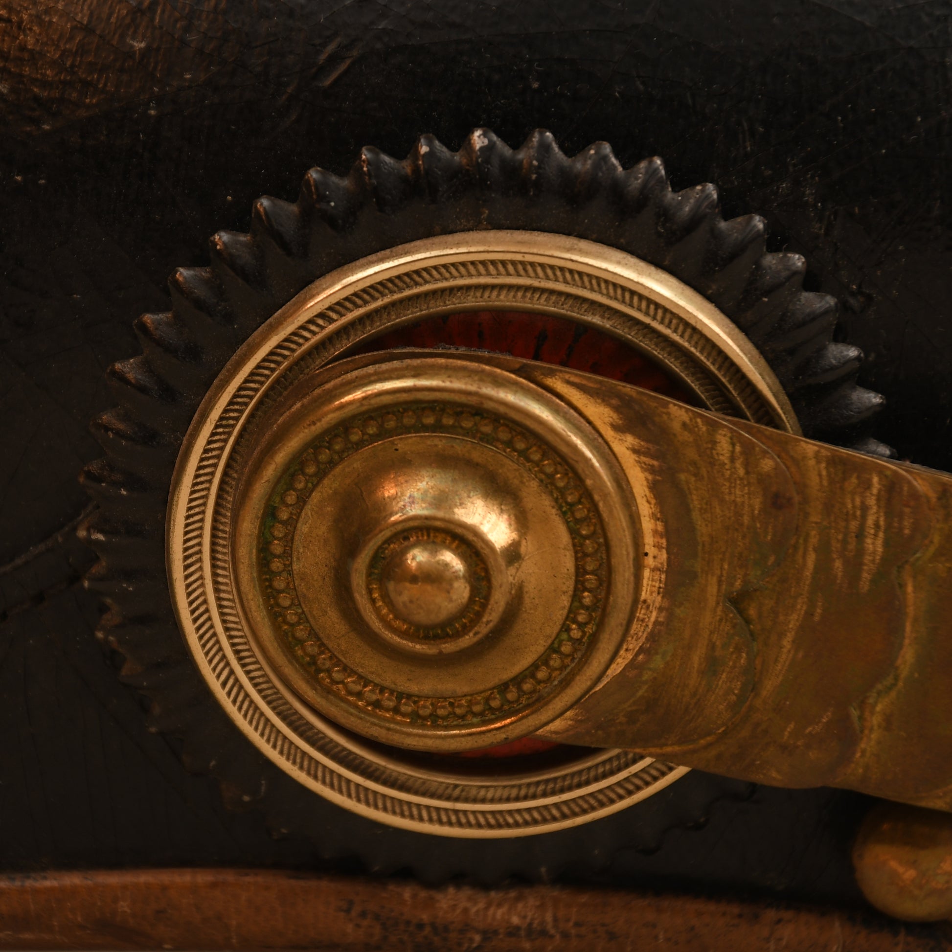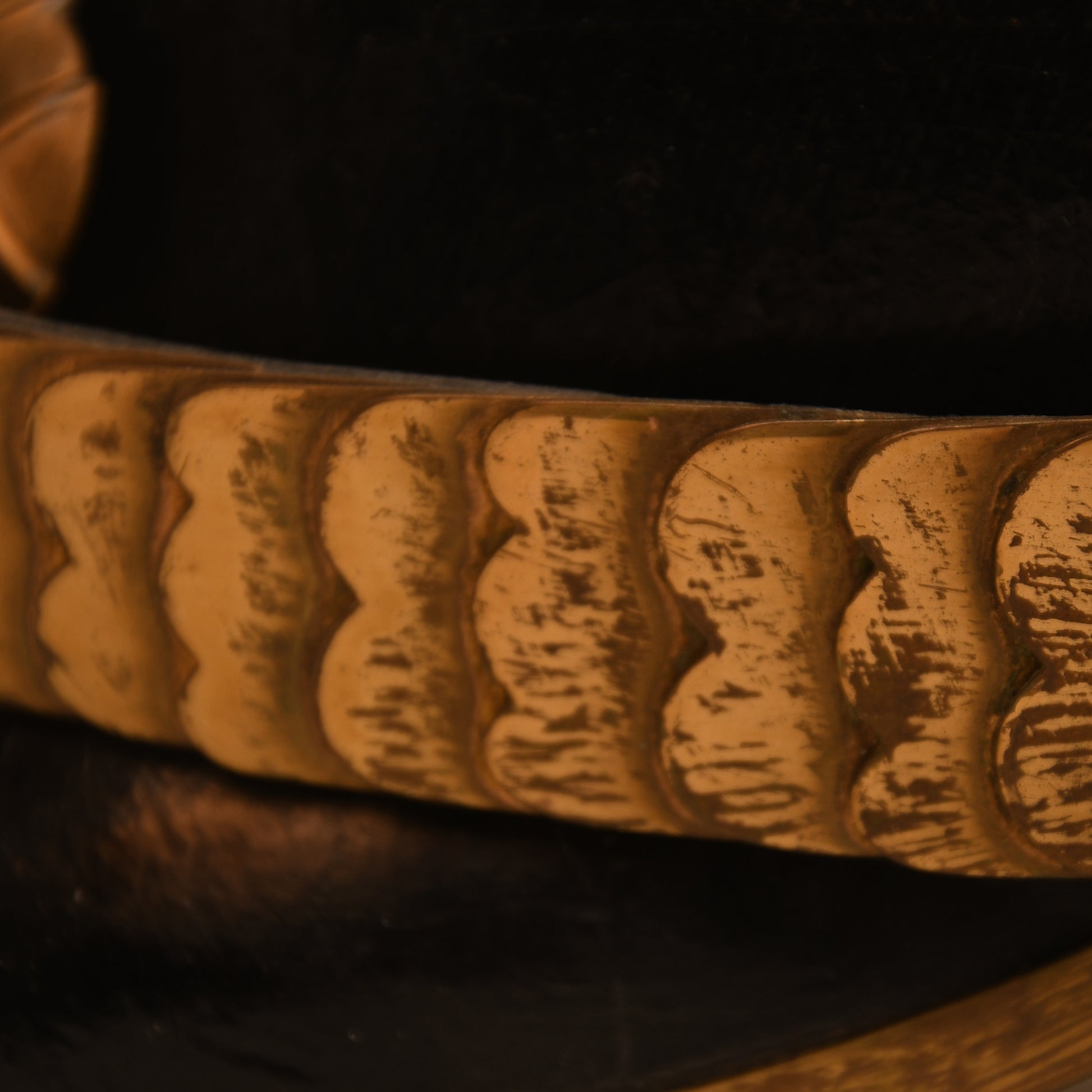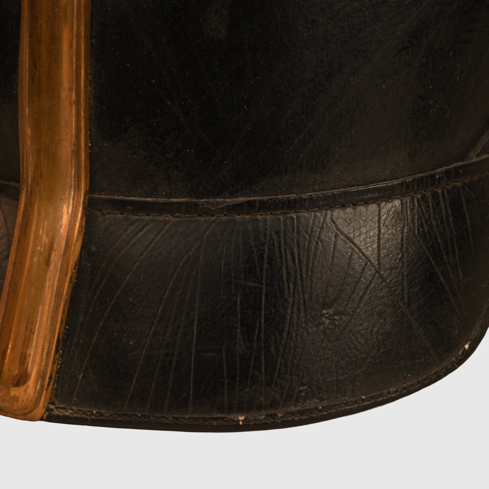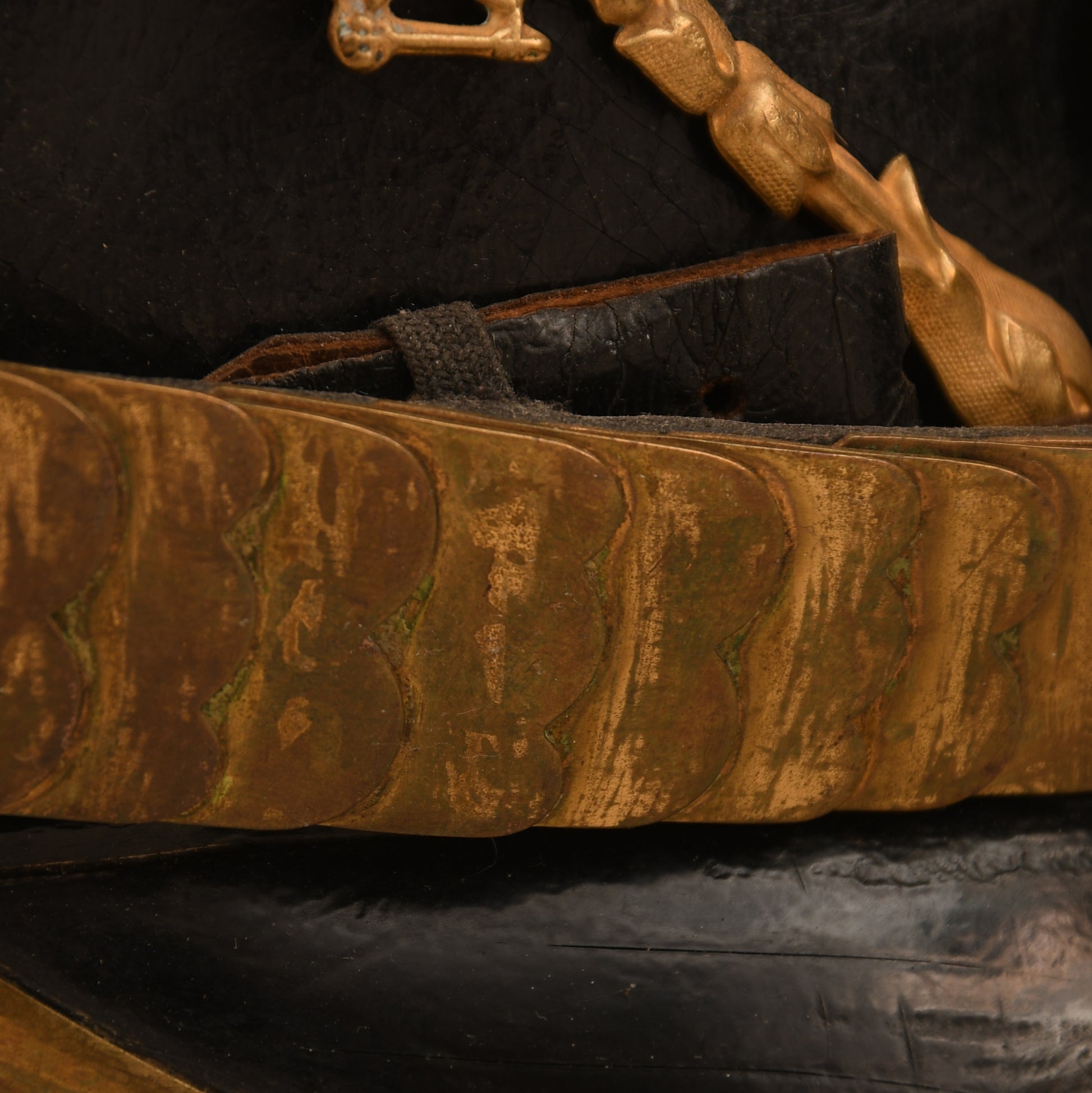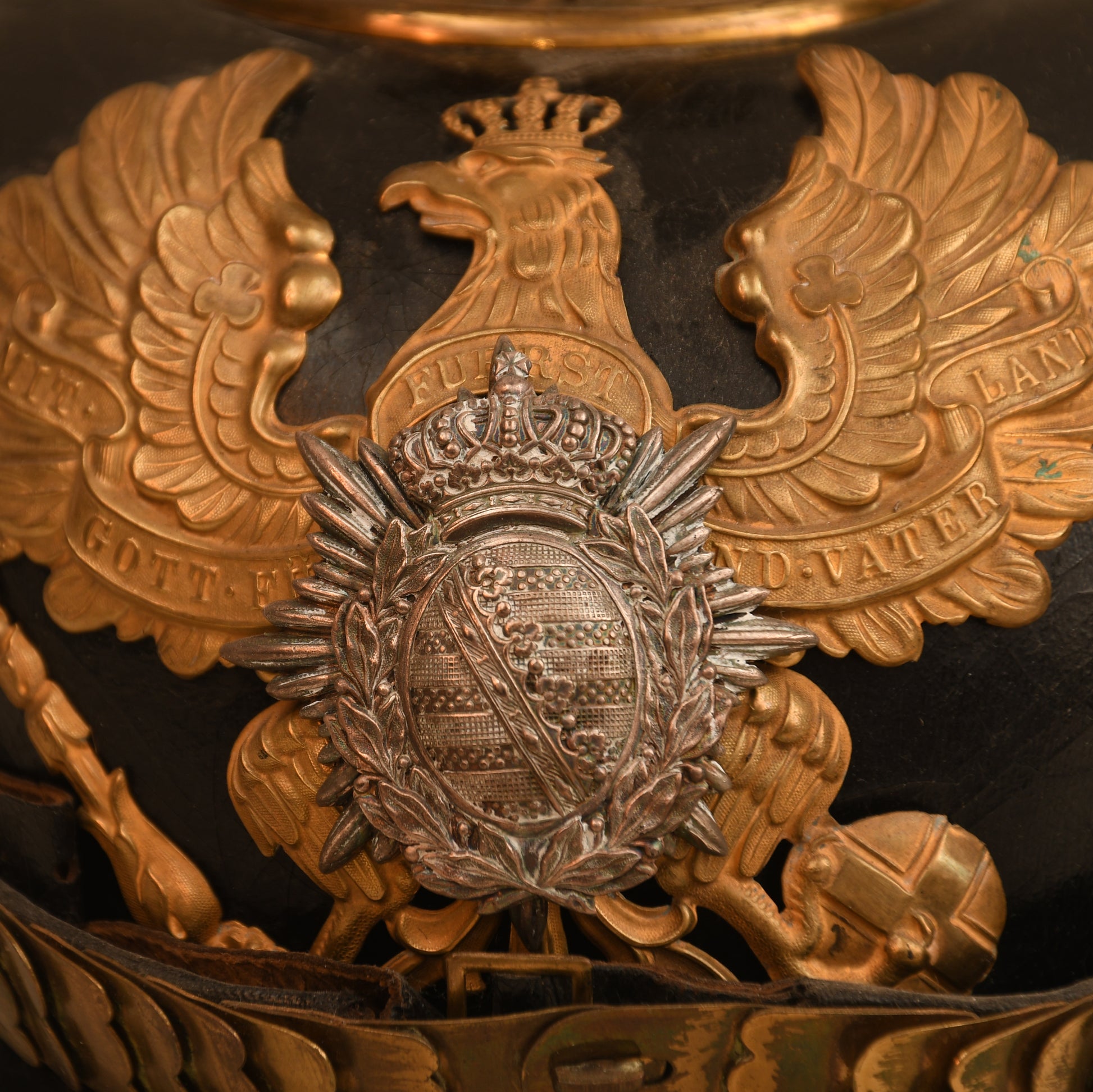 A very good example of a Saxon Weimar officers pickelhaube for the 94th Infantry Regiment, complete with its original carrying case. The leather skull shows light overall crazing, with both front and rear peaks firmly attached. The fittings retain a high degree of original gilt finish throughout, though the crown from the orb on the front plate is missing. The helmet features the rare Saxon Weimar overlay plate, which fits over the standard Prussian eagle plate and bears the distinctive inscription ‘FUERST’ on the eagle’s neck in place of ‘KOENIG’—a feature unique to only a few regiments.