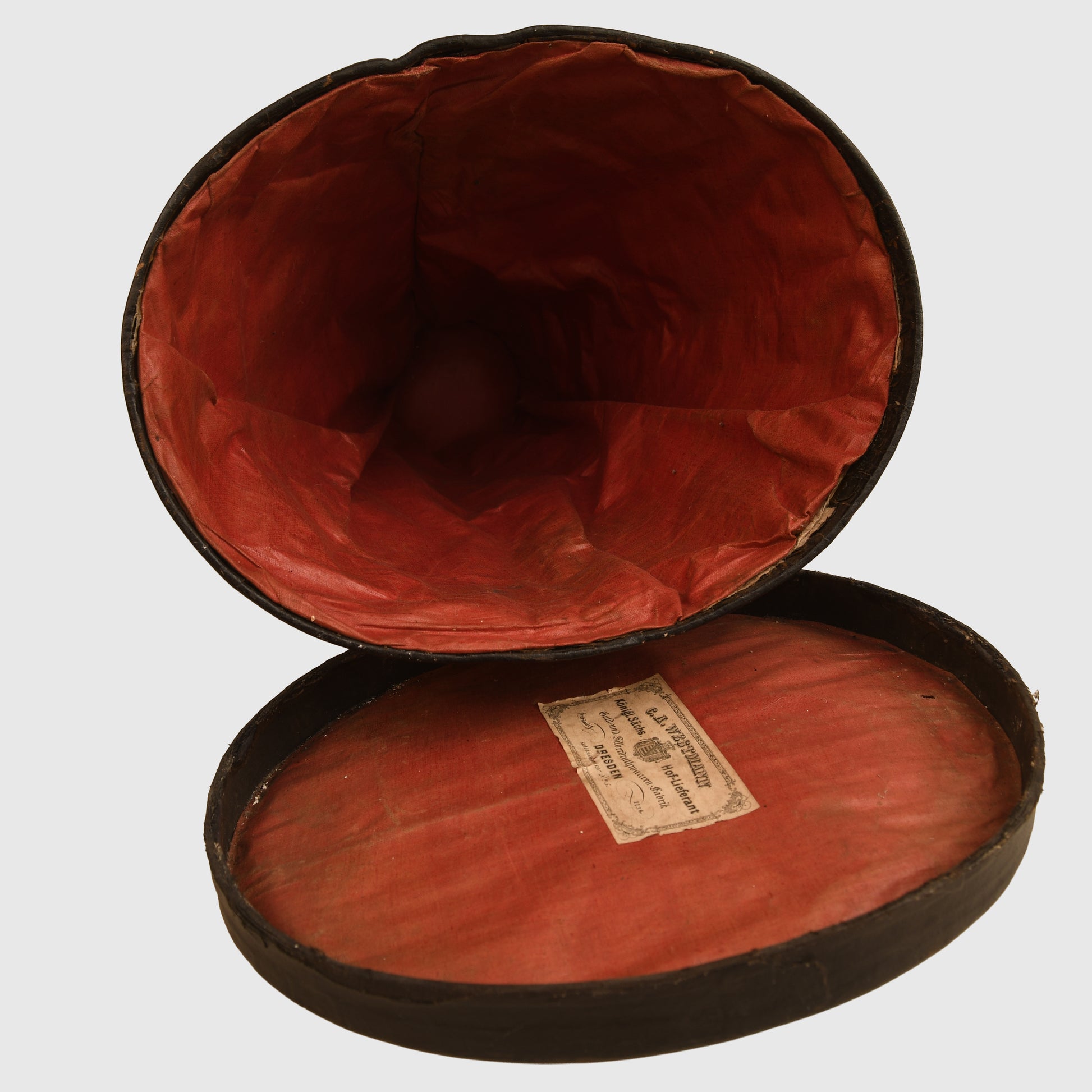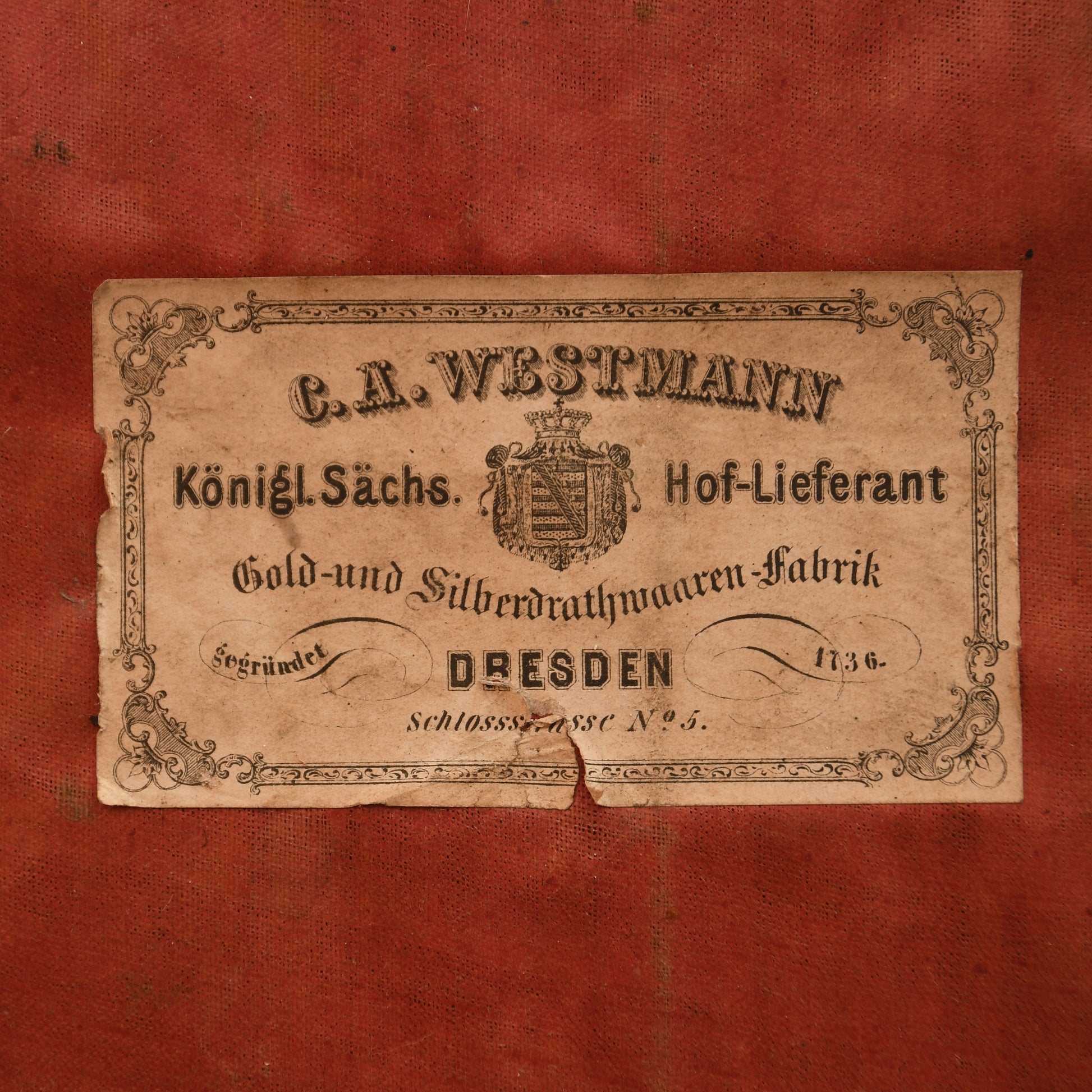 Both the national and Saxon Weimar (green and black) officers cockades are present. The interior retains its complete leather liner with some wear but no damage, and its original silk lining. Four minor kinks are present in the front peak trim. No extra holes are visible, confirming the plate is original to this helmet. The fitted carrying case is included, though the name and carrying straps are missing; inside is a printed paper label reading ‘C.A. Westmann, Dresden’.