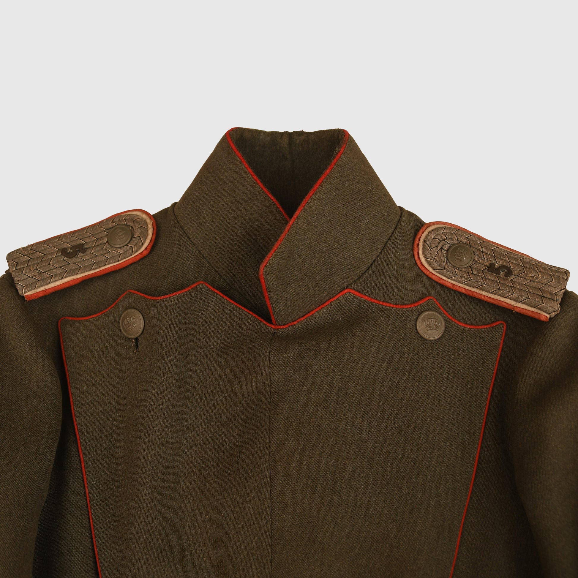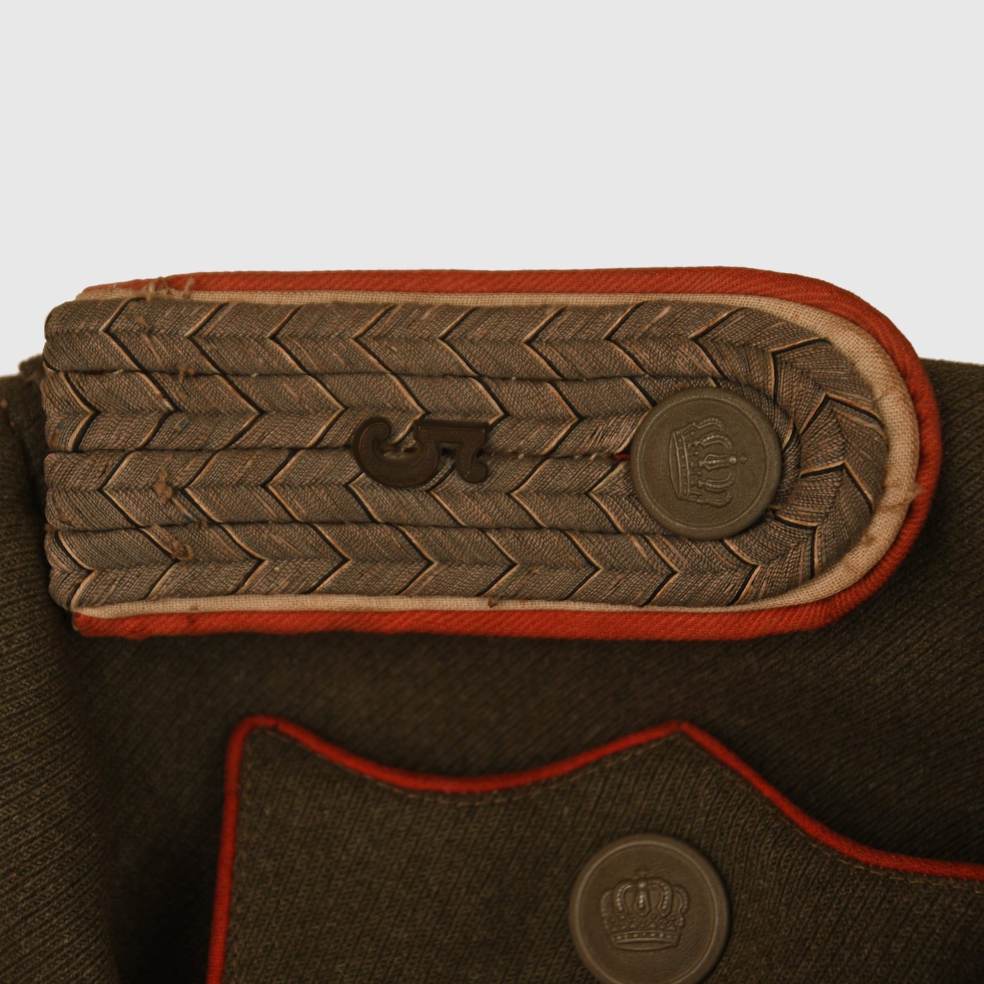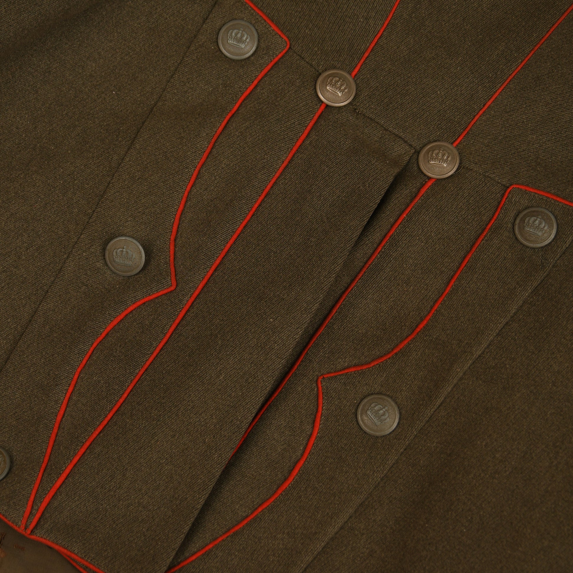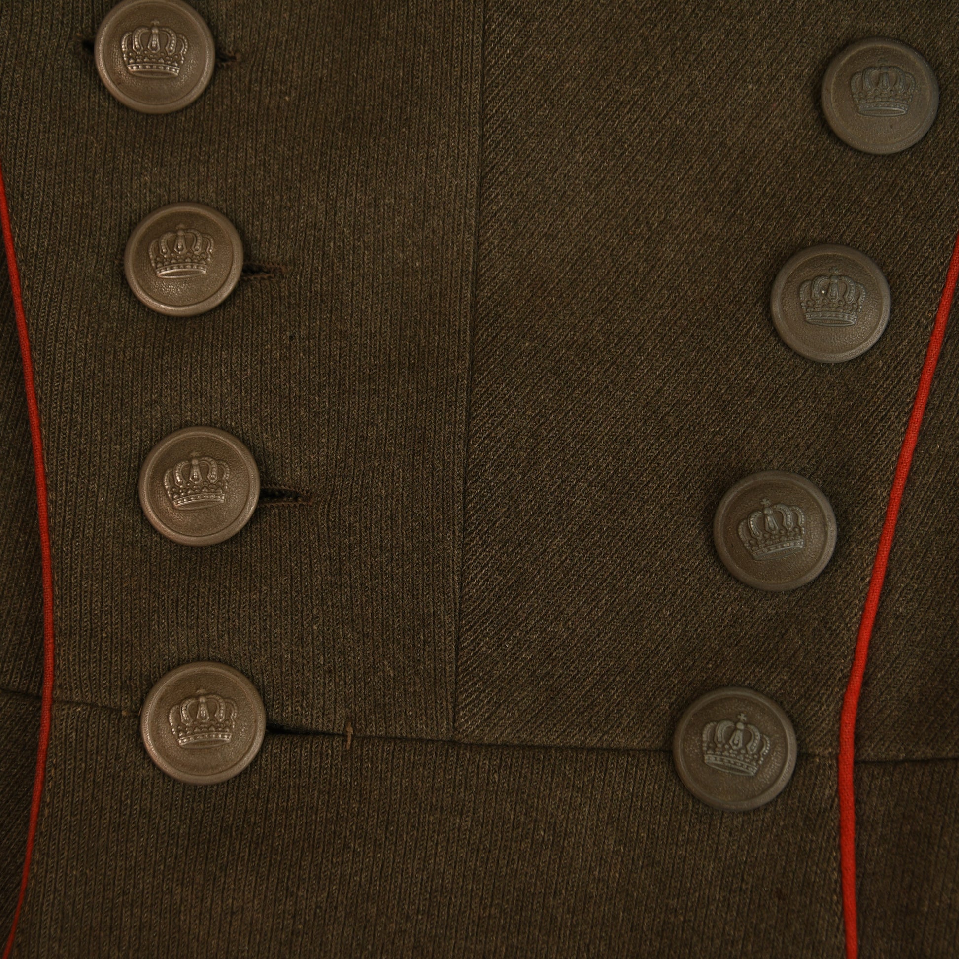 The tunic features the traditional red piping throughout, maintaining the distinct identity of the Uhlan cavalry. The shoulder boards are the slip-on style for the rank of Lieutenant, piped in red and white and featuring the regimental number 5 at the centre of each. All buttons are of correct officer quality. For gallantry awards, two loops are present on the lower left breast for the mounting of an Iron Cross. The interior lining is entirely complete and remains in an undamaged state.