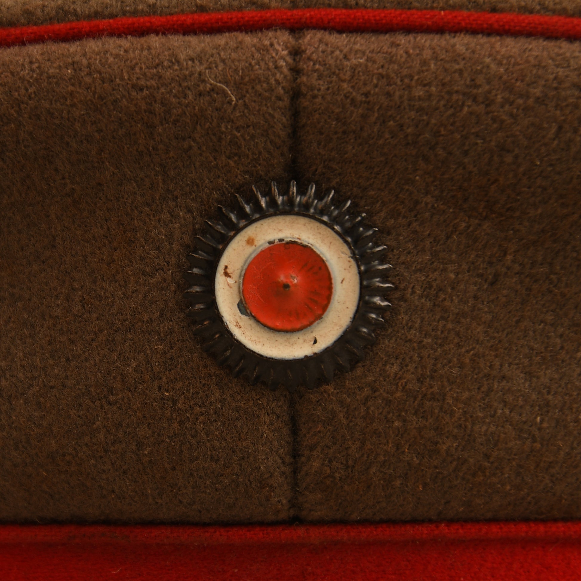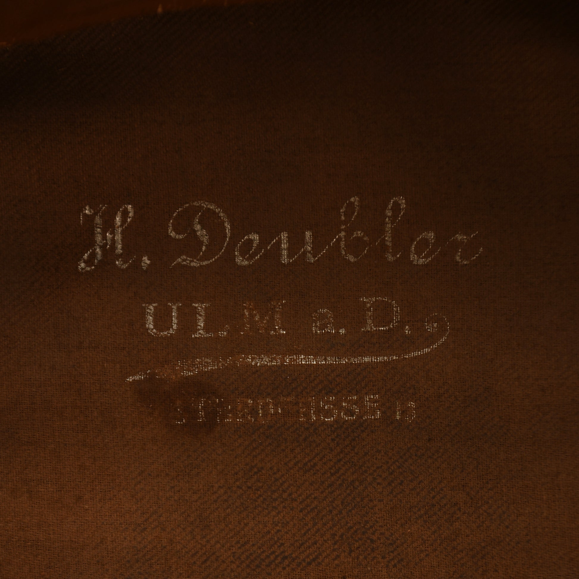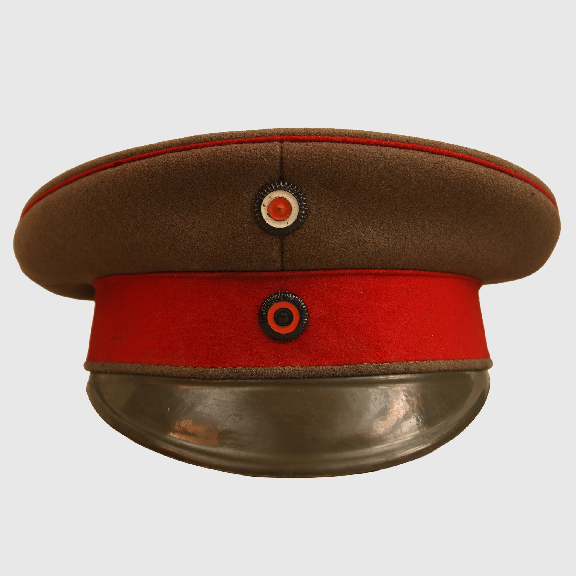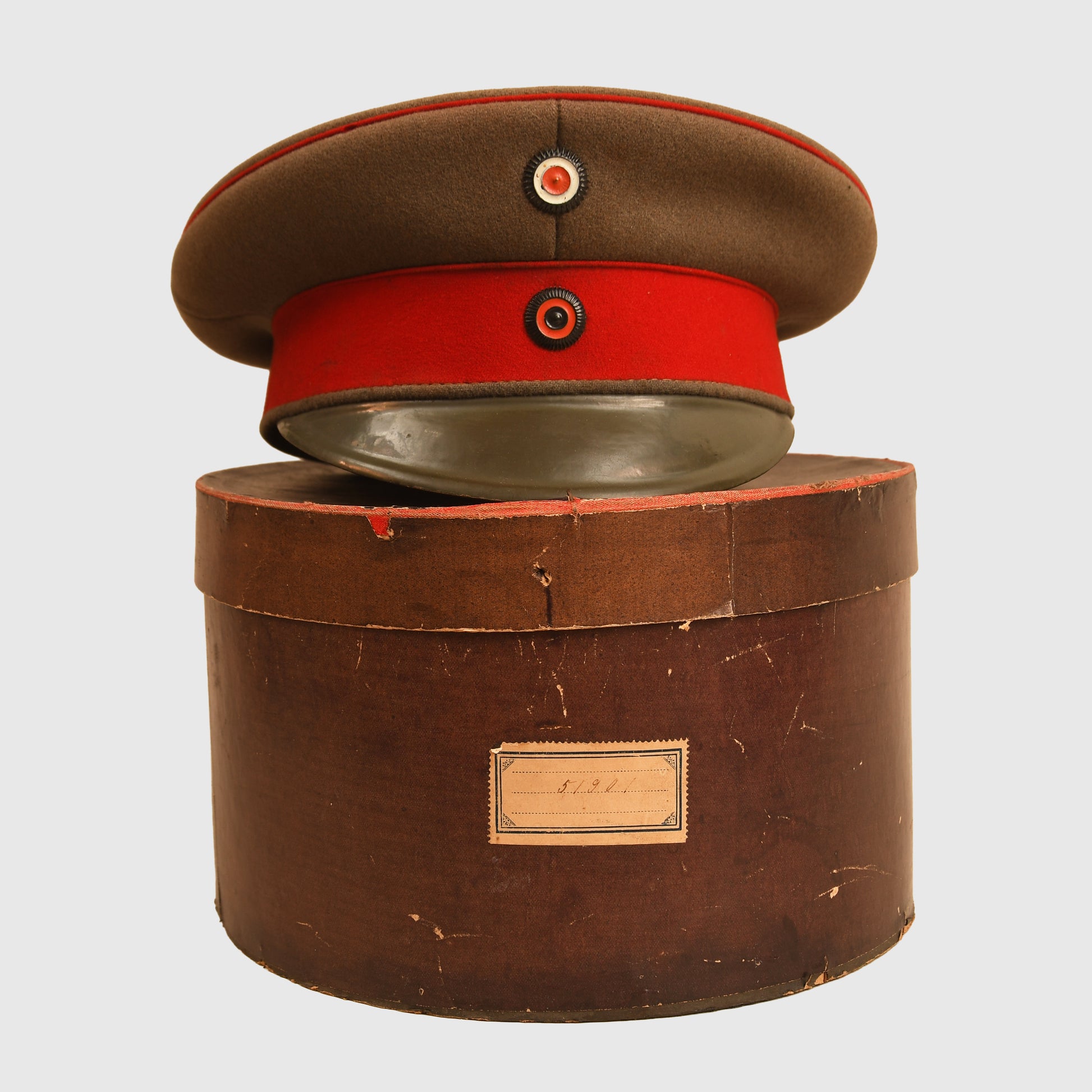 A very fine large-size Wurttemberg NCO visor cap, approximately size 58–59, complete with its original carrying case. Constructed in field grey cloth, the cap remains in excellent condition with no moth holes and only one small area of light moth tracking to the crown. The red piping around the crown and central band is intact and vibrant, complemented by both the national and Wurttemberg cockades. The peak is in field grey-green. To the interior, the brushed cotton lining is clearly silver-blocked with an ‘Ulm’ maker’s mark, while the ersatz-style sweatband bears the punch-holed name ‘Stuhlinger’. A very scarce example, enhanced by the survival of its original box.