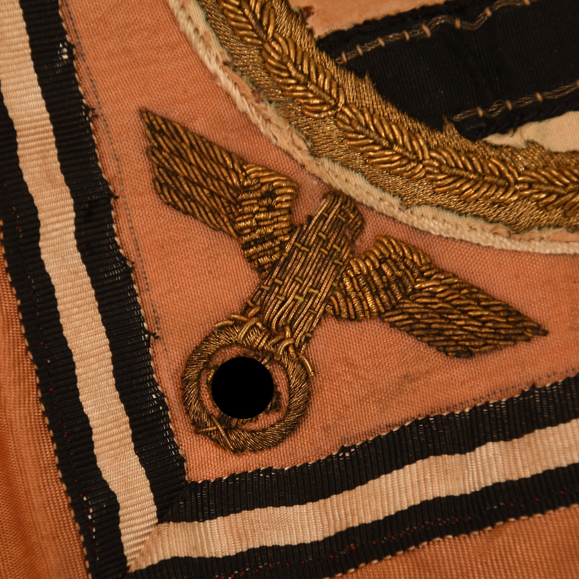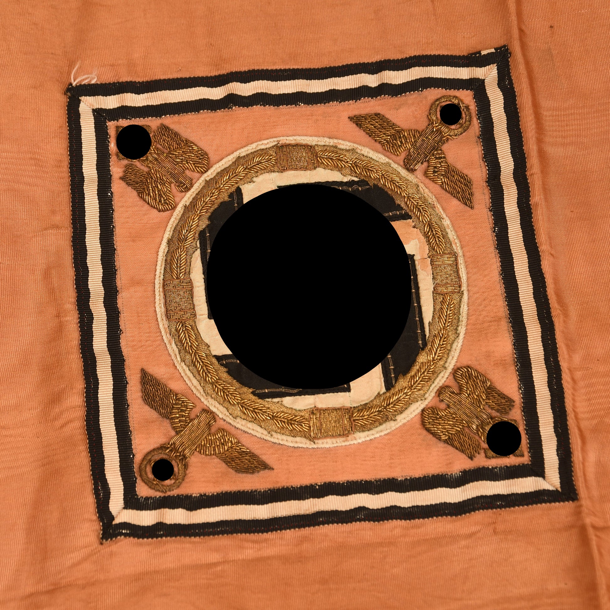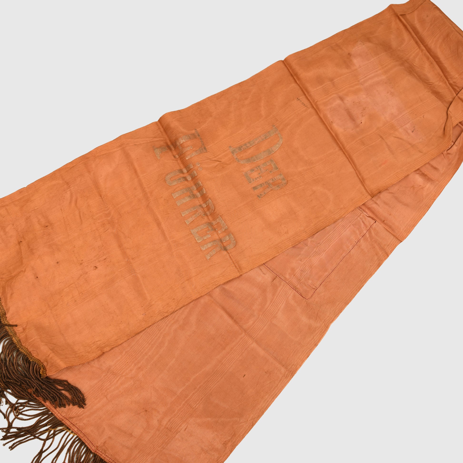 The ribbon is constructed from watered red silk, which shows some expected age-related fading. The designation Der Fuhrer is clearly visible, applied in gilt lettering onto the silk. Both ends of the ribbon are finished with their original gold fringe. The centerpiece features a high-quality hand-embroidered representation of the Fuhrer Standard, measuring 7 x 7 cm. The embroidery is executed to an exceptional standard, using gilt wire and bordered by black and white silk ribbon. There is some light staining visible within the white areas of the central motif.