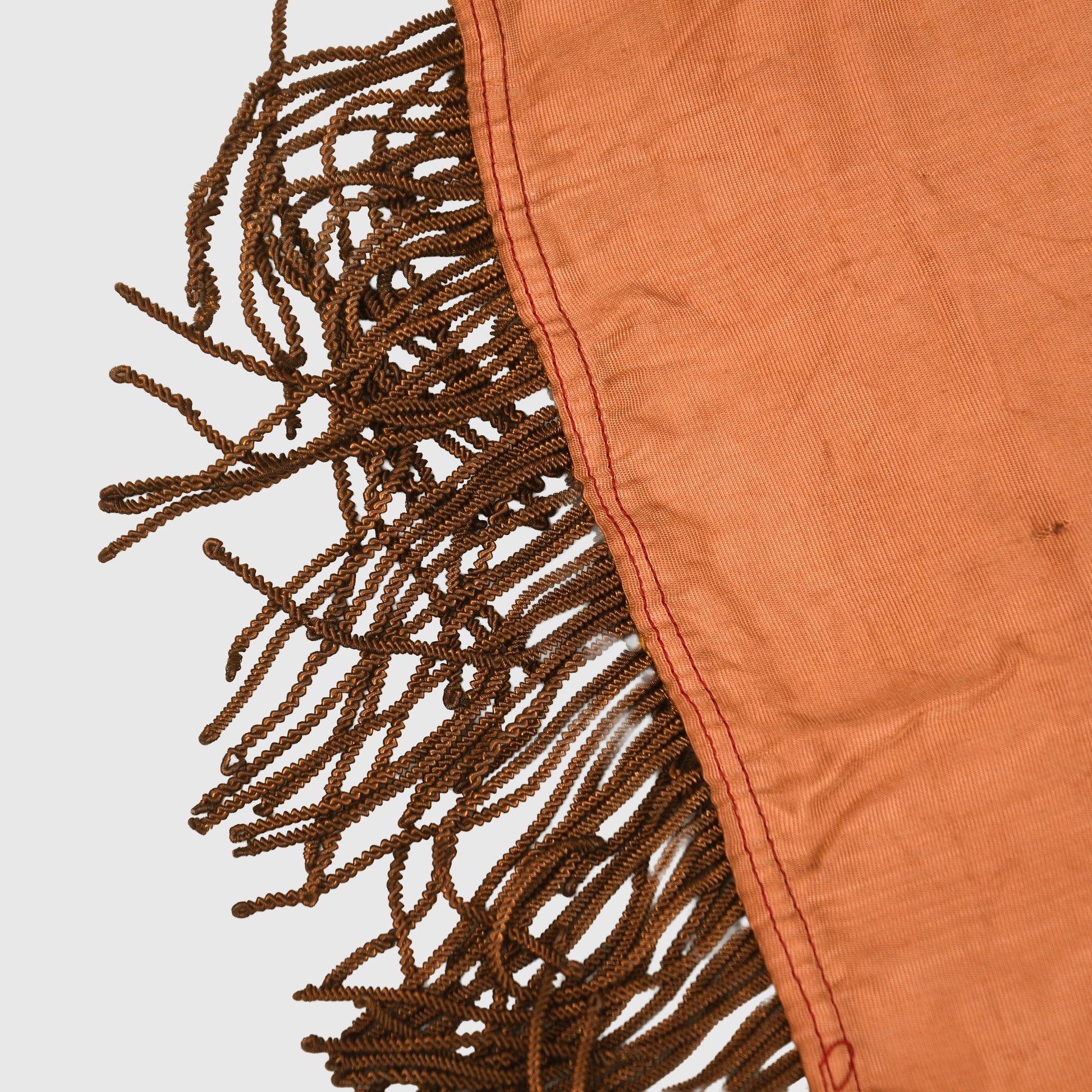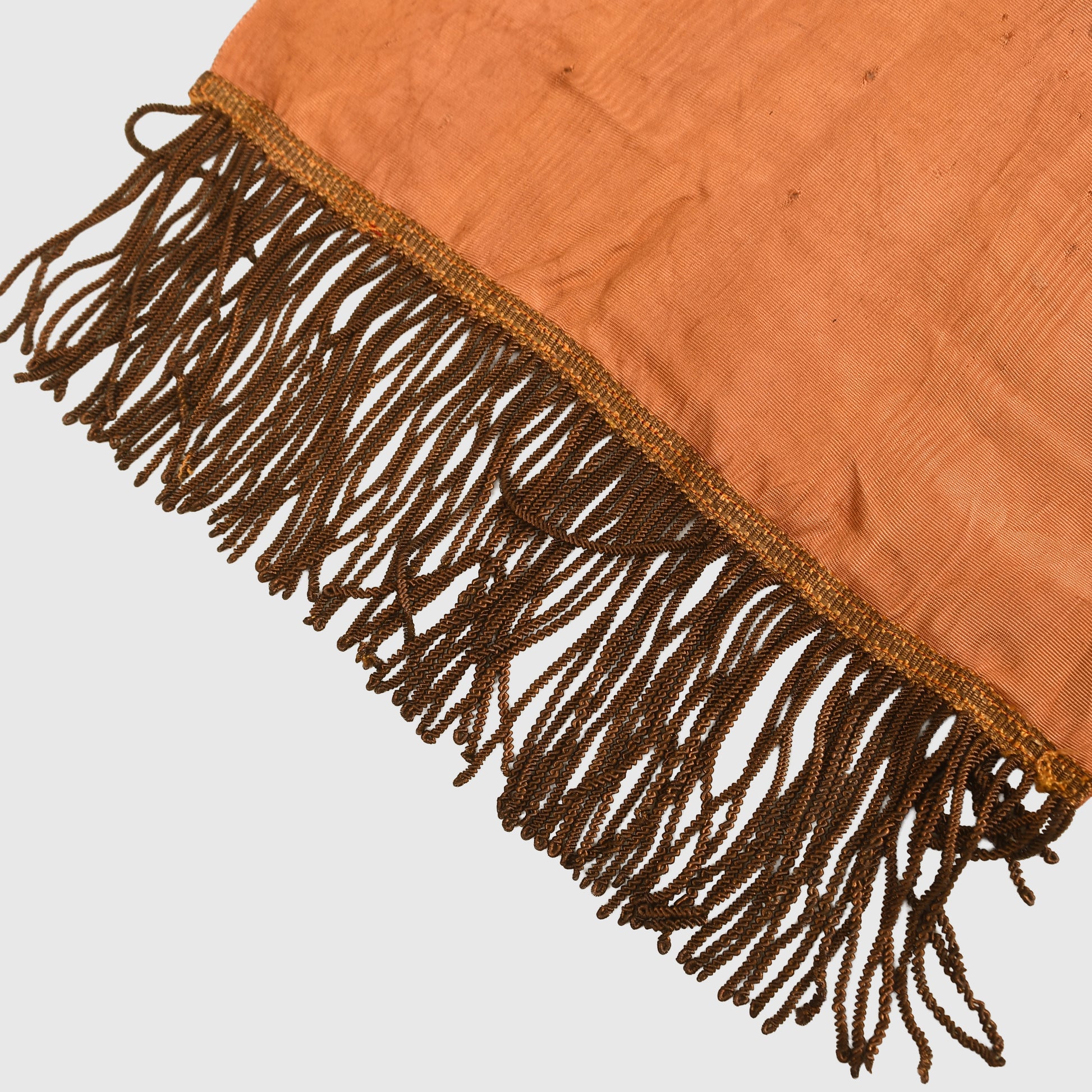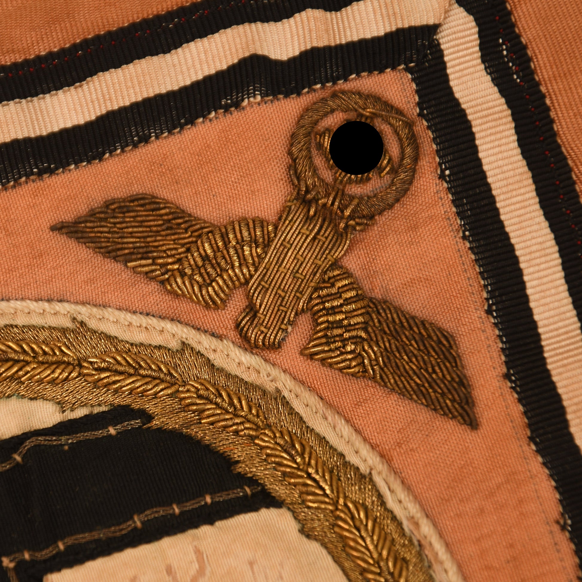 The ribbon is constructed from watered red silk, which shows some expected age-related fading. The designation Der Fuhrer is clearly visible, applied in gilt lettering onto the silk. Both ends of the ribbon are finished with their original gold fringe. The centerpiece features a high-quality hand-embroidered representation of the Fuhrer Standard, measuring 7 x 7 cm. The embroidery is executed to an exceptional standard, using gilt wire and bordered by black and white silk ribbon. There is some light staining visible within the white areas of the central motif.