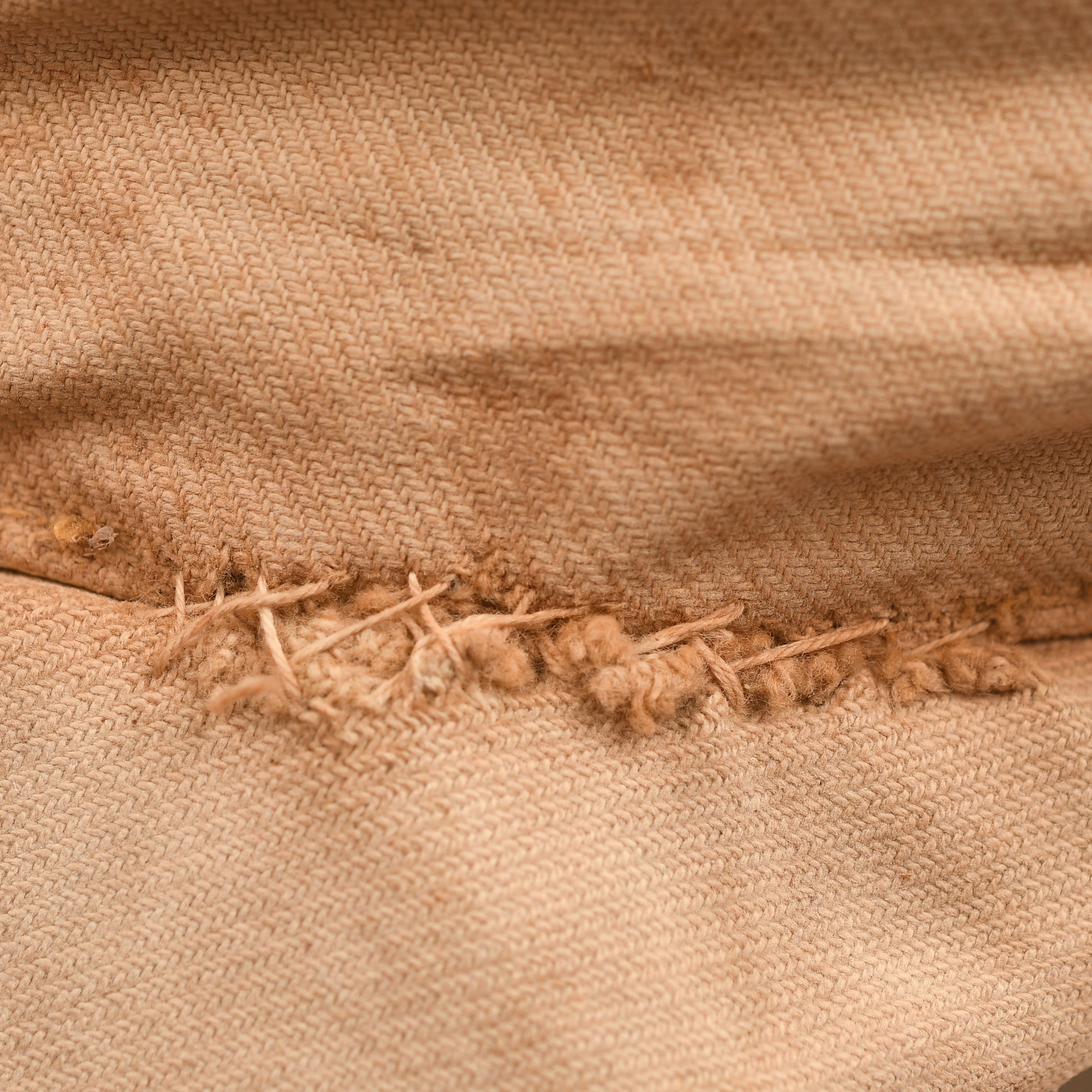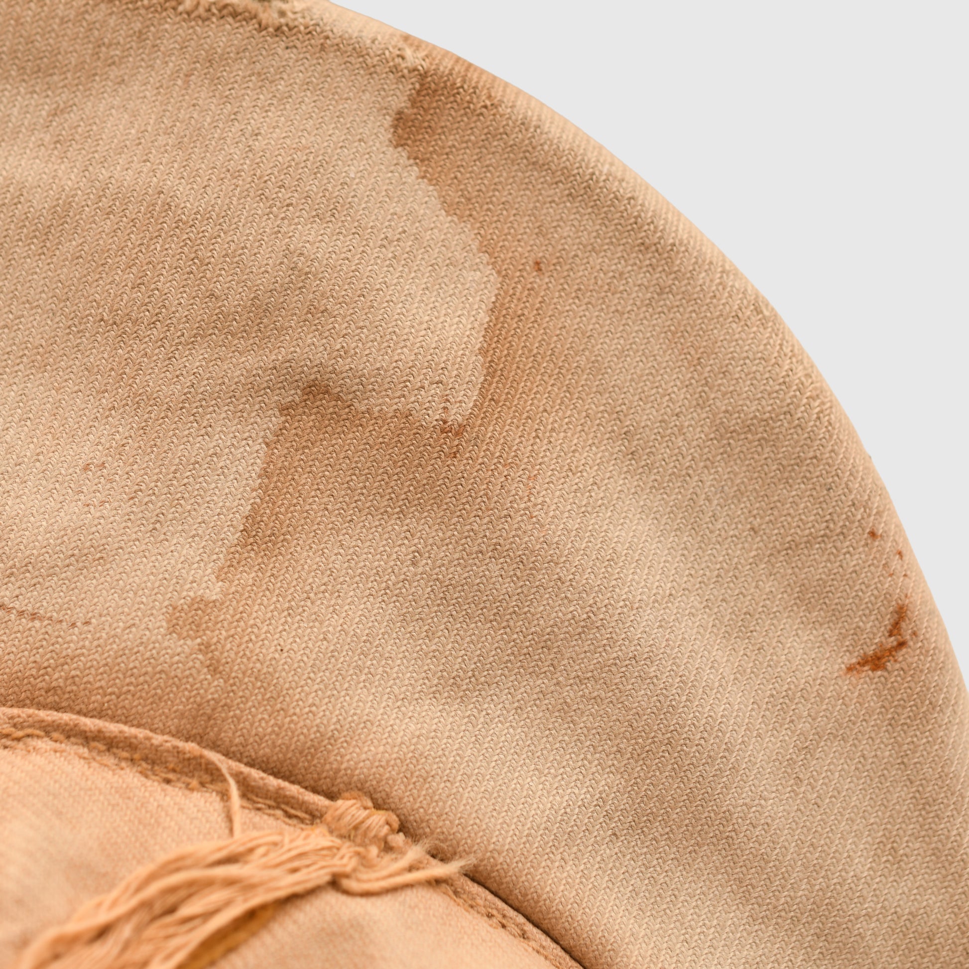A superb, medium-sized, bleached to white, M40 visored field cap with lemon yellow soutache (waffenfarbe) for a Signals unit. Stiff, heavyweight, tan coloured material with much age, nicks and tears. The cap holds form when upturned, as we often see with these well-worn examples. The cap has its untouched, first pattern tropical bevo eagle and matching roundel. The yellow Russia braid (soutache) is stitched through the lining, as often seen with these caps, the lower sections of the thread are frayed, pulling back the soutache, revealing the original dark shades of the olive drab material colour from when it's been protected from sun bleaching. The red interior lining shows the expected wear and the usual sweat stains to the front brow area. The soldier has stitched into the lining what appears to be a Z or N, likely an initial for easy identification. The thread used for this matches various field repairs. The maker mark is clear to the rare maker of Erich Bergmann and is dated 1941. Interestingly, this is the 4th example of Erich Bergmann with Yellow, Signals waffenfarbe we have obtained here in the UK, 3 of which have all come from the County of Surrey. One can assume a British unit captured a Signals unit during the Africa Campaign, and all the troops took souvenirs home.