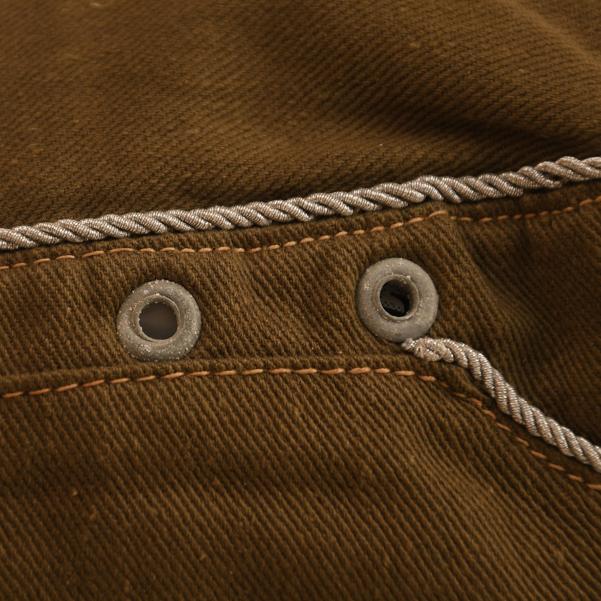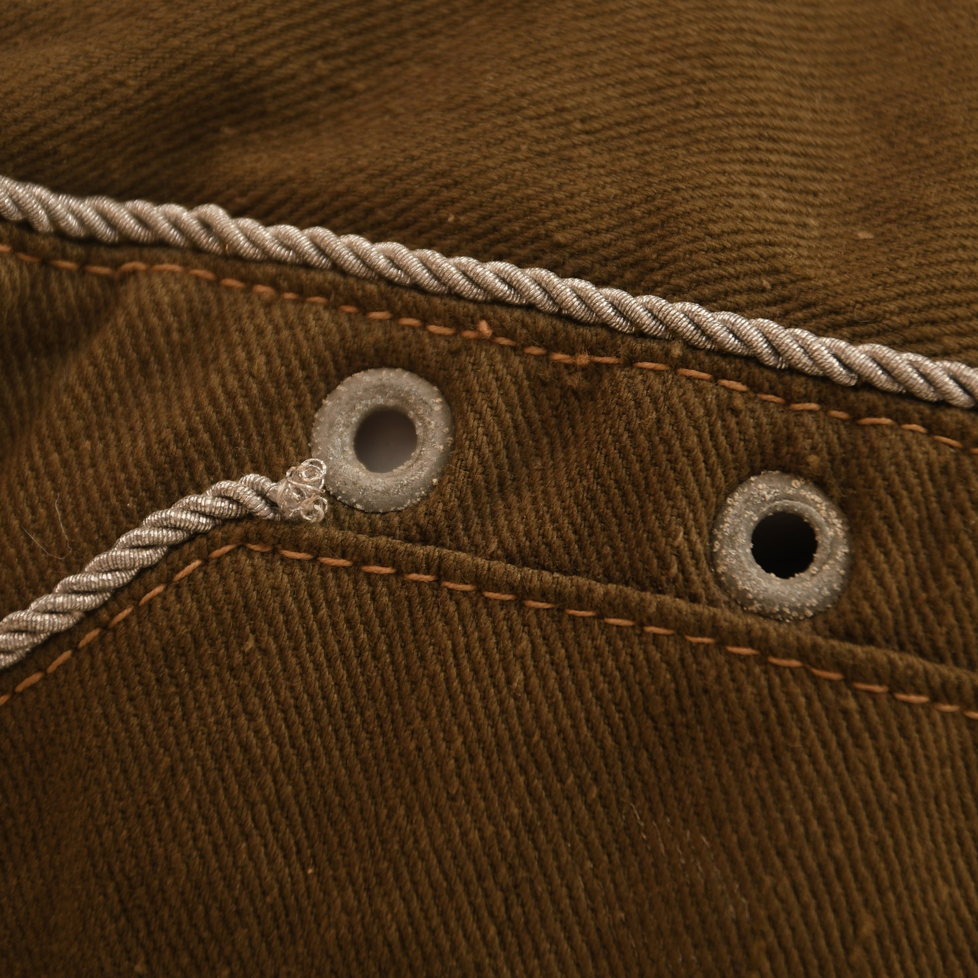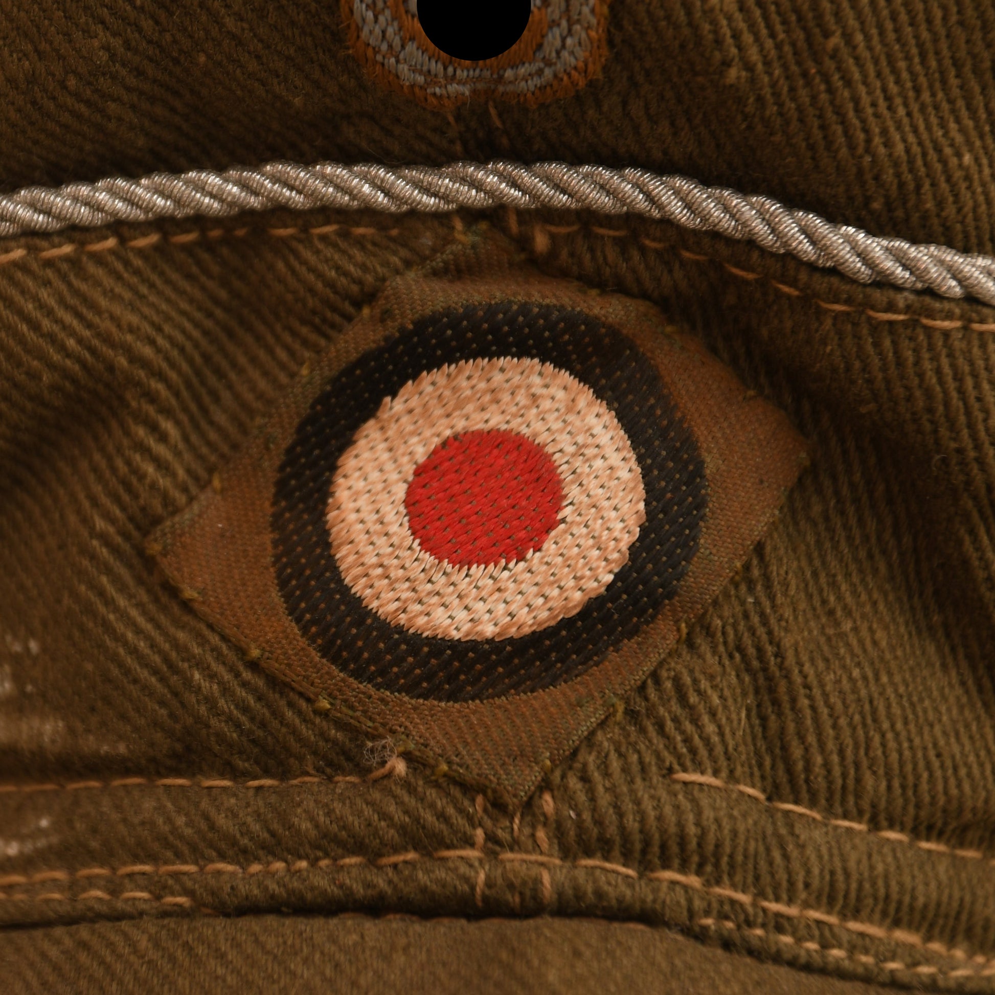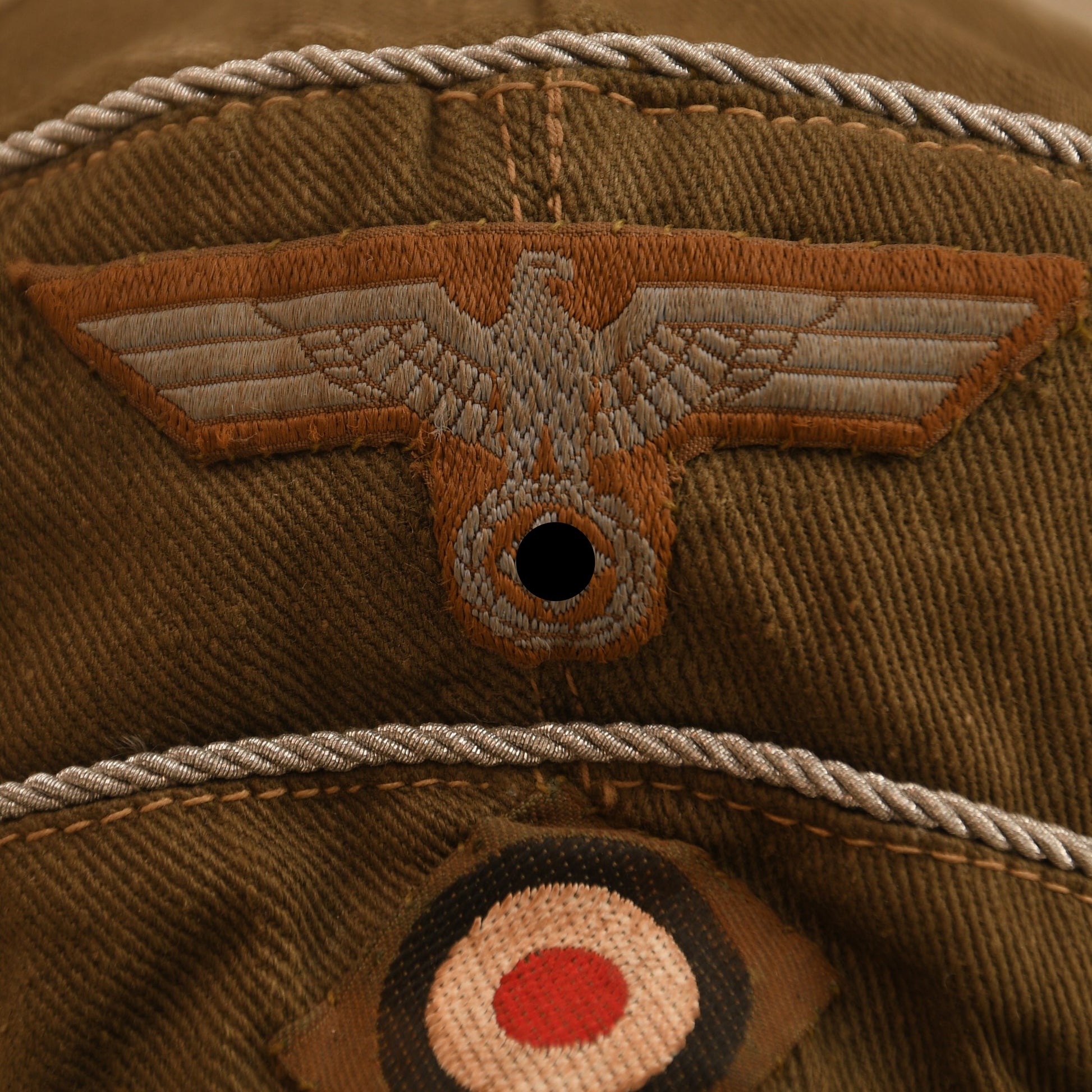 A fine example, size 56, of a 2nd pattern tropical visored field cap, issued to an officer of the Afrikakorps. The cap retains its untouched Bevo woven blue-on-tan eagle and cockade, complemented by the field adaptation of corded officer-style piping to the crown and front scallop. The zinc eyelets show minor paint lift, but otherwise the cap is undamaged.
