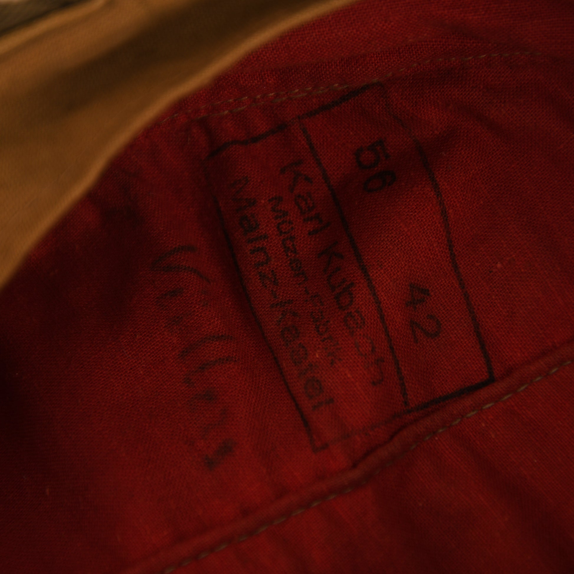 The interior shows light wear consistent with service, with the original owner’s name applied. In addition to the size stamping, the cap bears the model number ‘42’ and the maker’s mark ‘Karl Kubach, Mainz’. A distinctive feature of Kubach-produced caps is the combination leatherette and canvas sweatband. A rare and well-preserved example of Afrikakorps tropical headgear.