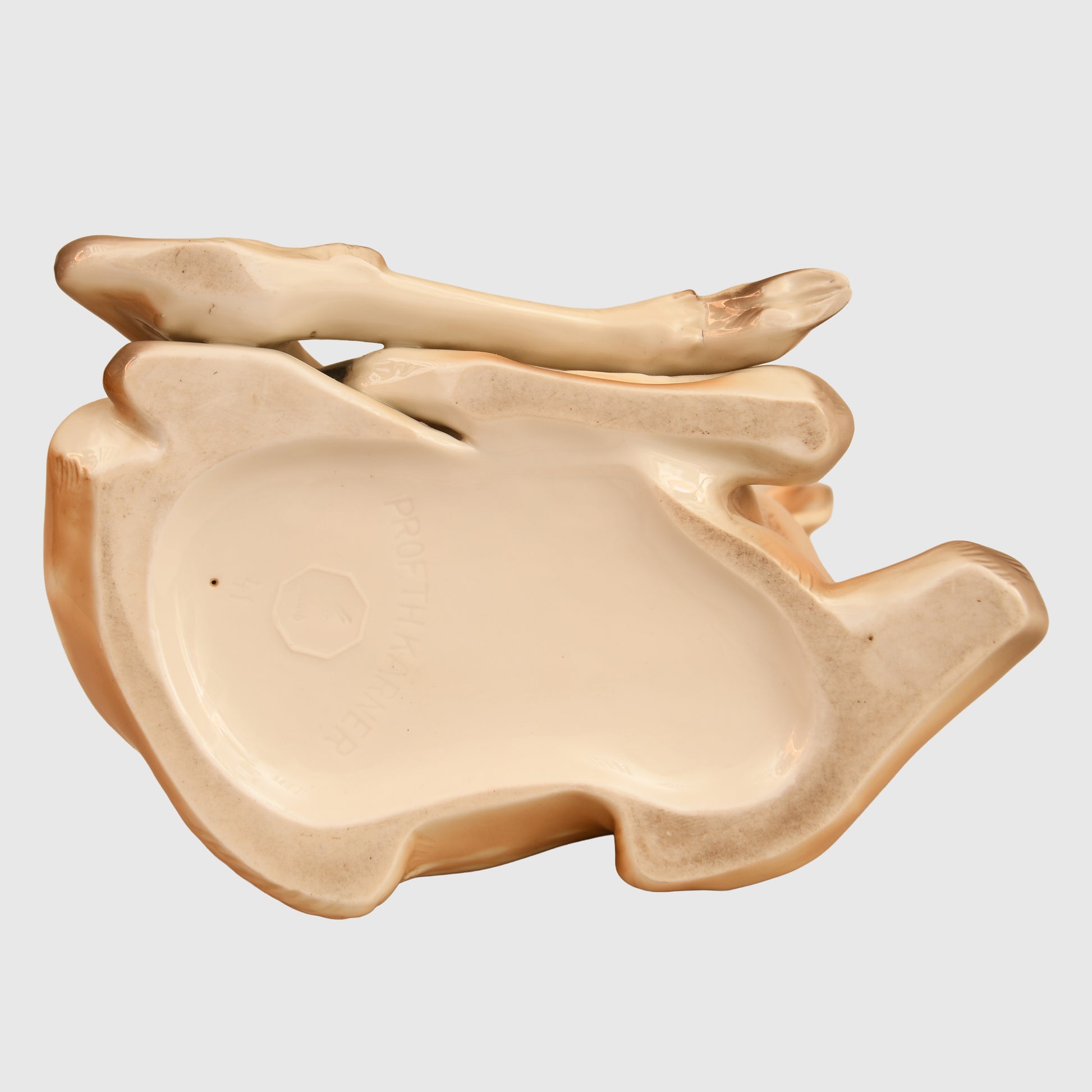 A superb, undamaged example of the coloured Allach laying fawn. This piece is in pristine condition with vibrant, original colours. The base is marked with the designer’s name, Professor T.H. Karner, and Model No. 41, with the SS runes cast in white within the octagonal base. Introduced in 1936, production is believed to have been extremely limited, with only 86 painted examples reportedly made, though this figure cannot be confirmed. Measures 16 cm in height and 19 cm in width.