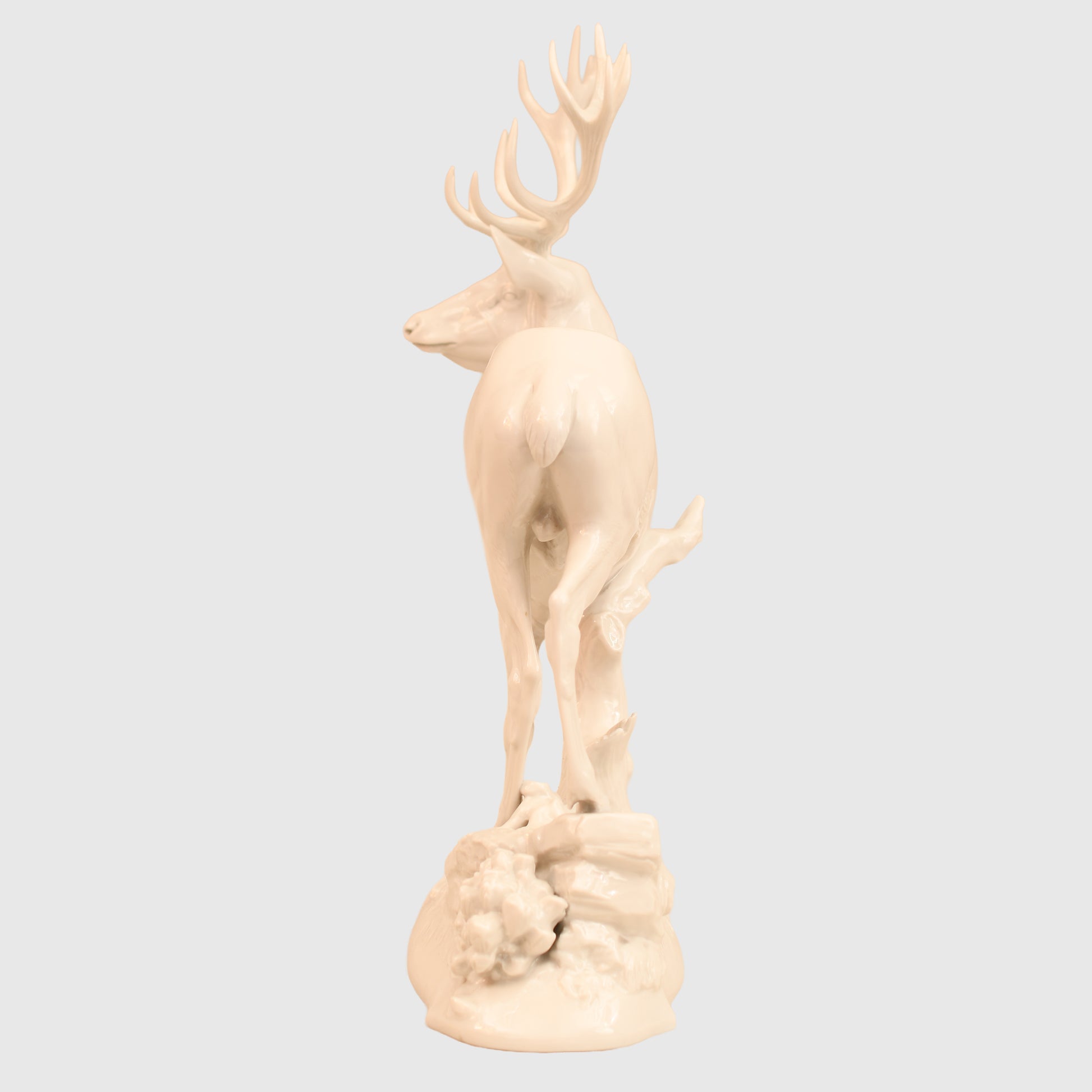 A stunning example of the Allach white porcelain mountain stag, designed by Theodor Karner and first introduced in 1936, as shown in the original Allach catalogue of that year. Production of the pure white version was extremely limited, with approximately 93 examples believed to have been produced between 1938 and 1939. The stag is beautifully sculpted with exceptional anatomical detail and an elegant, powerful stance.