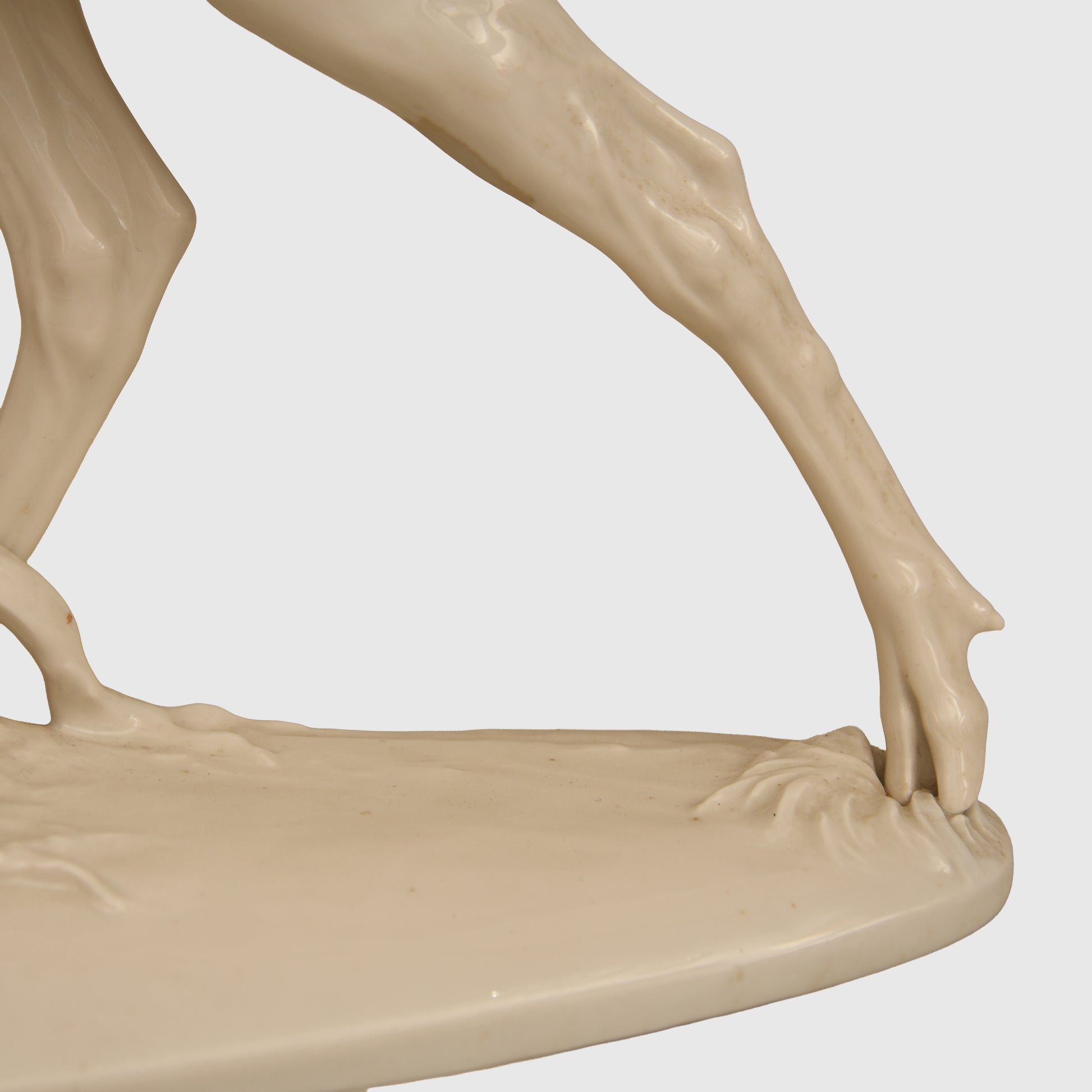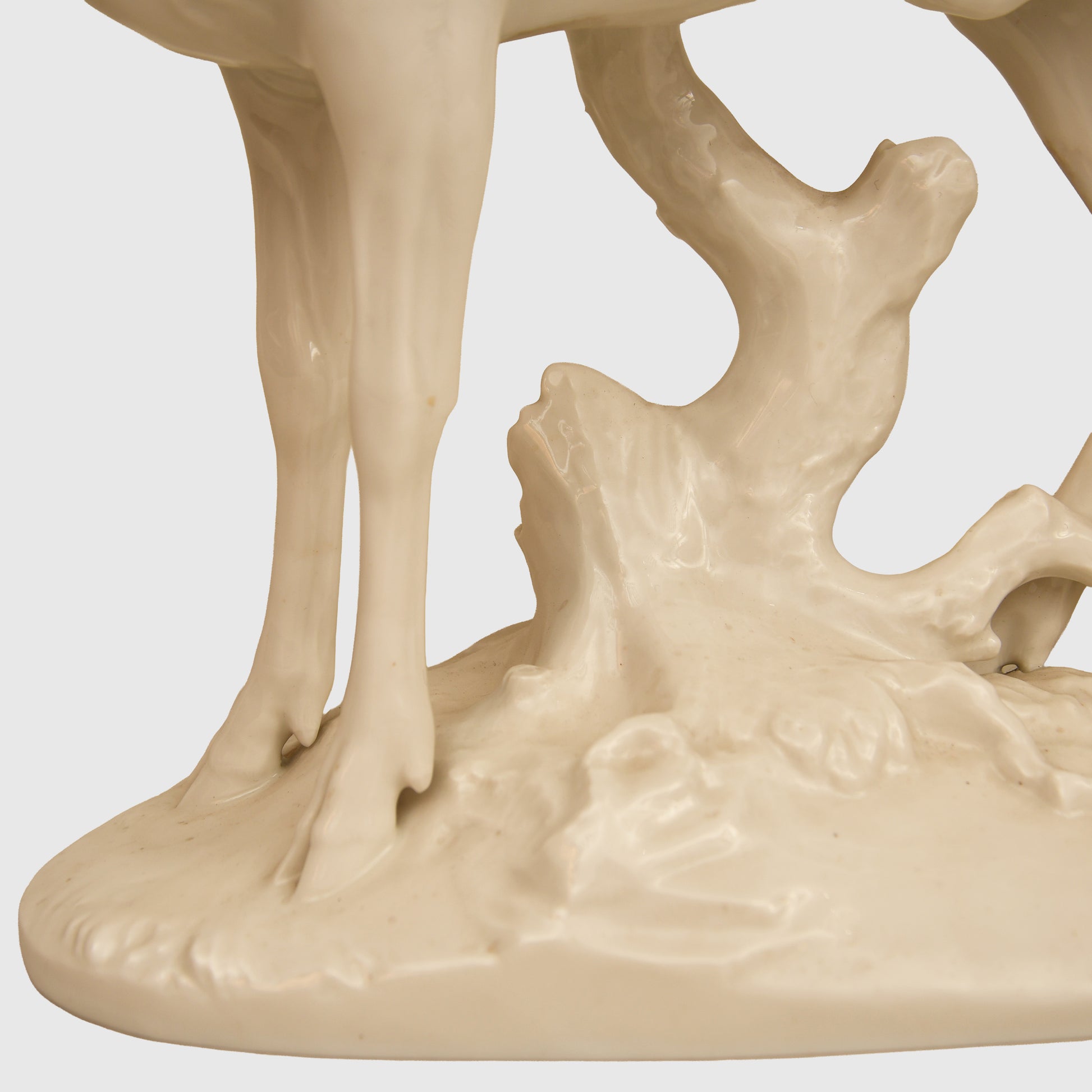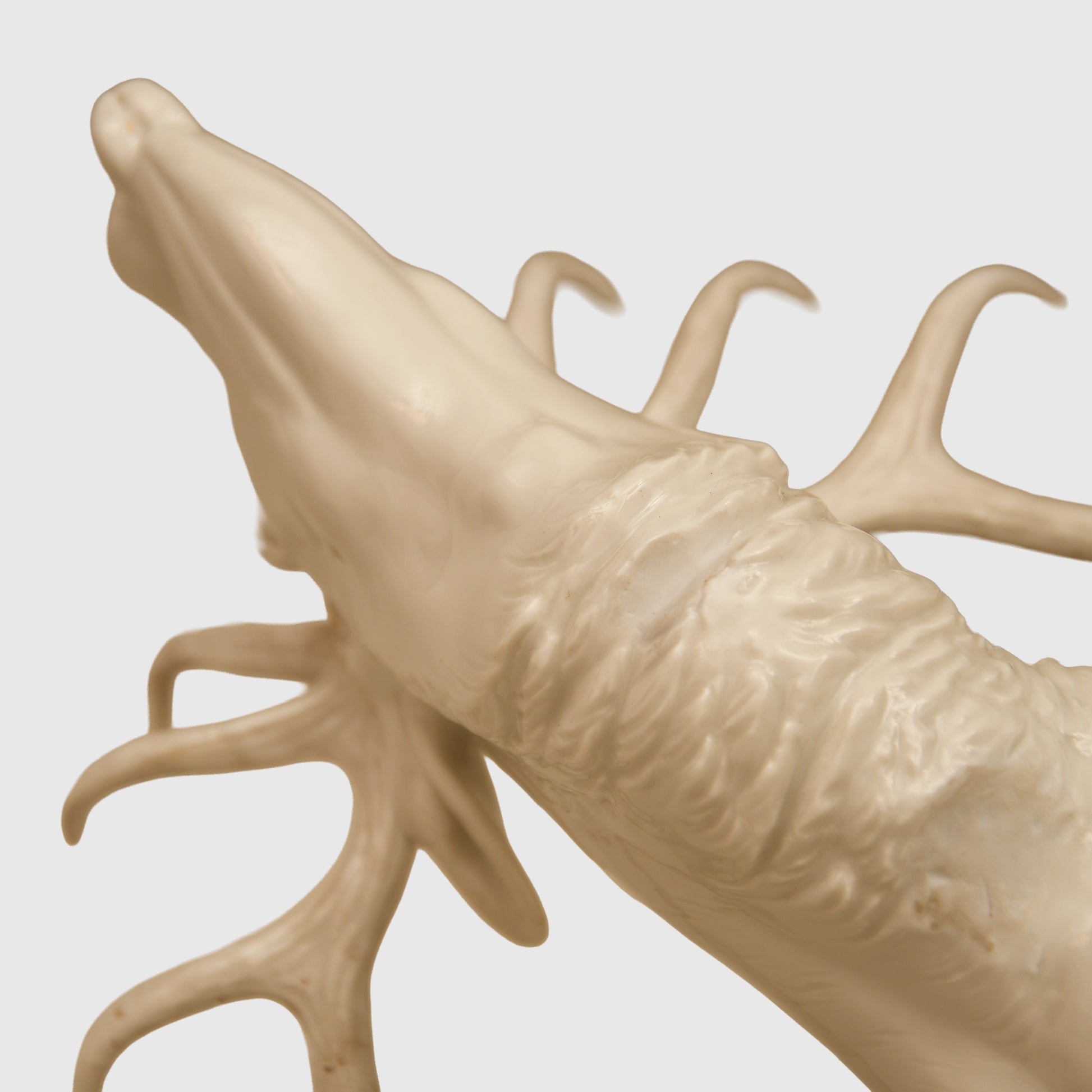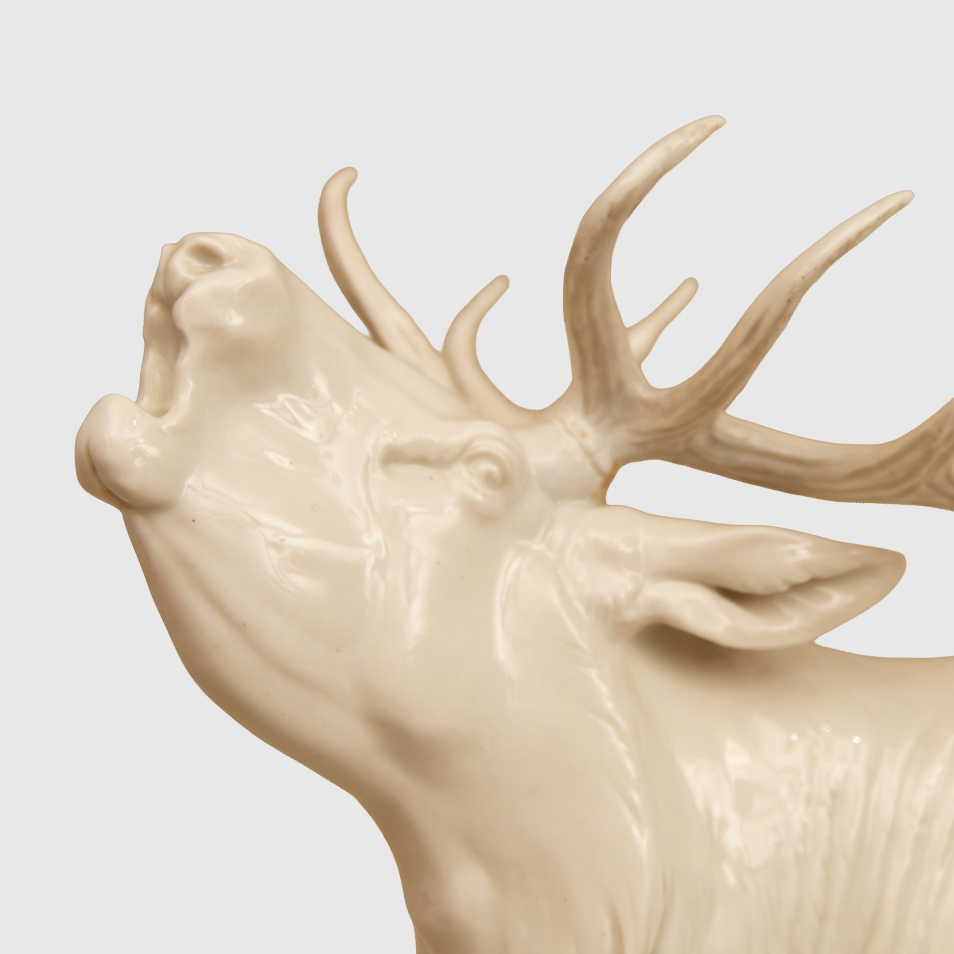 A superb and highly desirable example of Allach porcelain, this is the rare white-glazed “Rohrender” (Roaring Stag), model number 20, produced by the SS on the edges of the Dachau concentration camp. Designed by the renowned porcelain artist Theodor Karner, this model is exceptionally rare; according to Dennis Potter’s reference work on Allach porcelain, only 76 pieces were produced in white between 1938–1939.