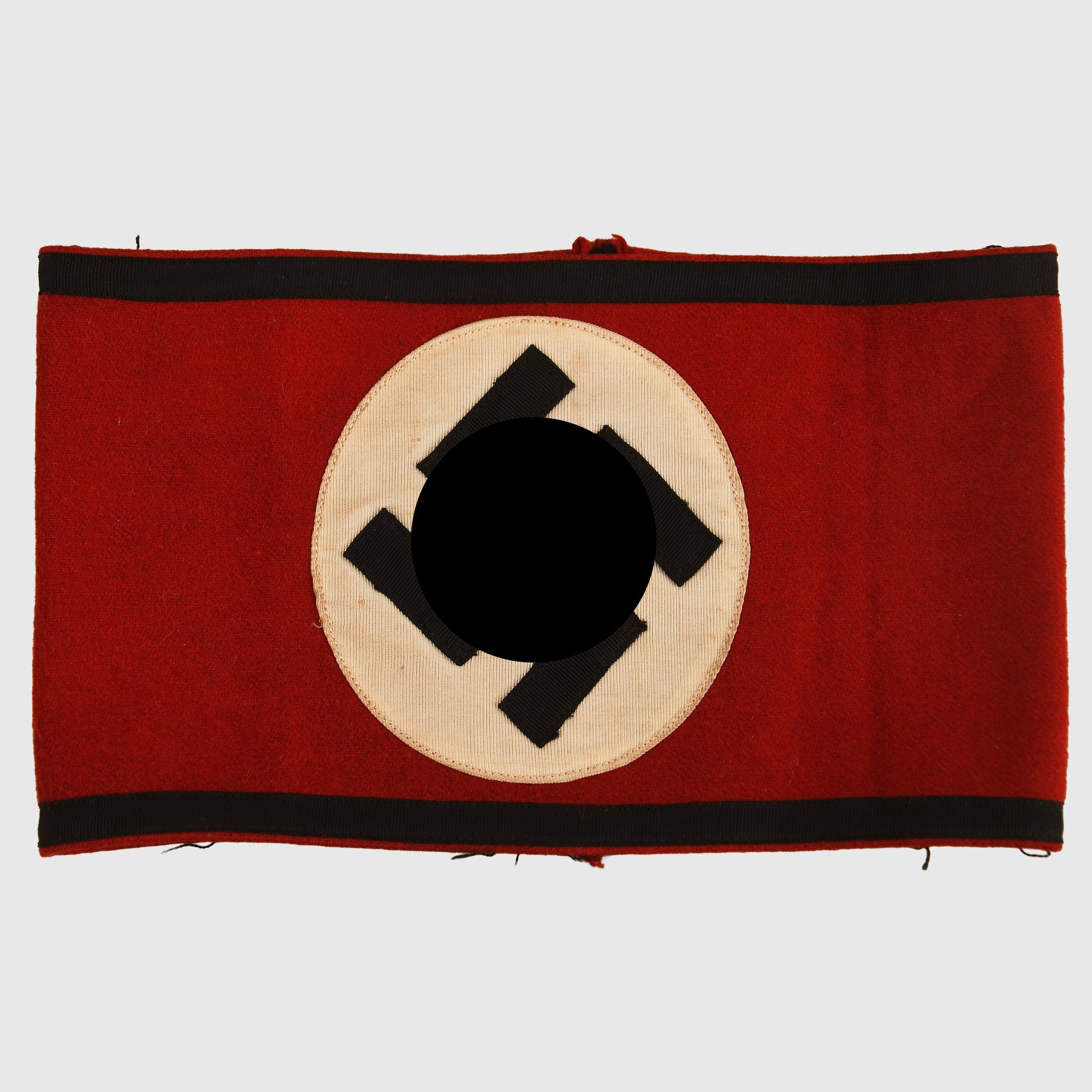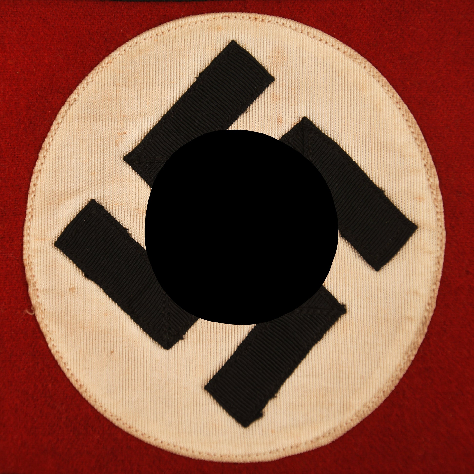 A fine example of a removed-from-tunic Allgemeine SS armband, retaining strands of cotton from its original black tunic attachment. Constructed from high-quality red cloth with two black stripes to the upper and lower edges, the central swastika is meticulously multi-stitched onto a white ribbed circlet. The armband is free of moth damage and retains its small Bevo-woven RZM label on the reverse, marked 156/37 SS.