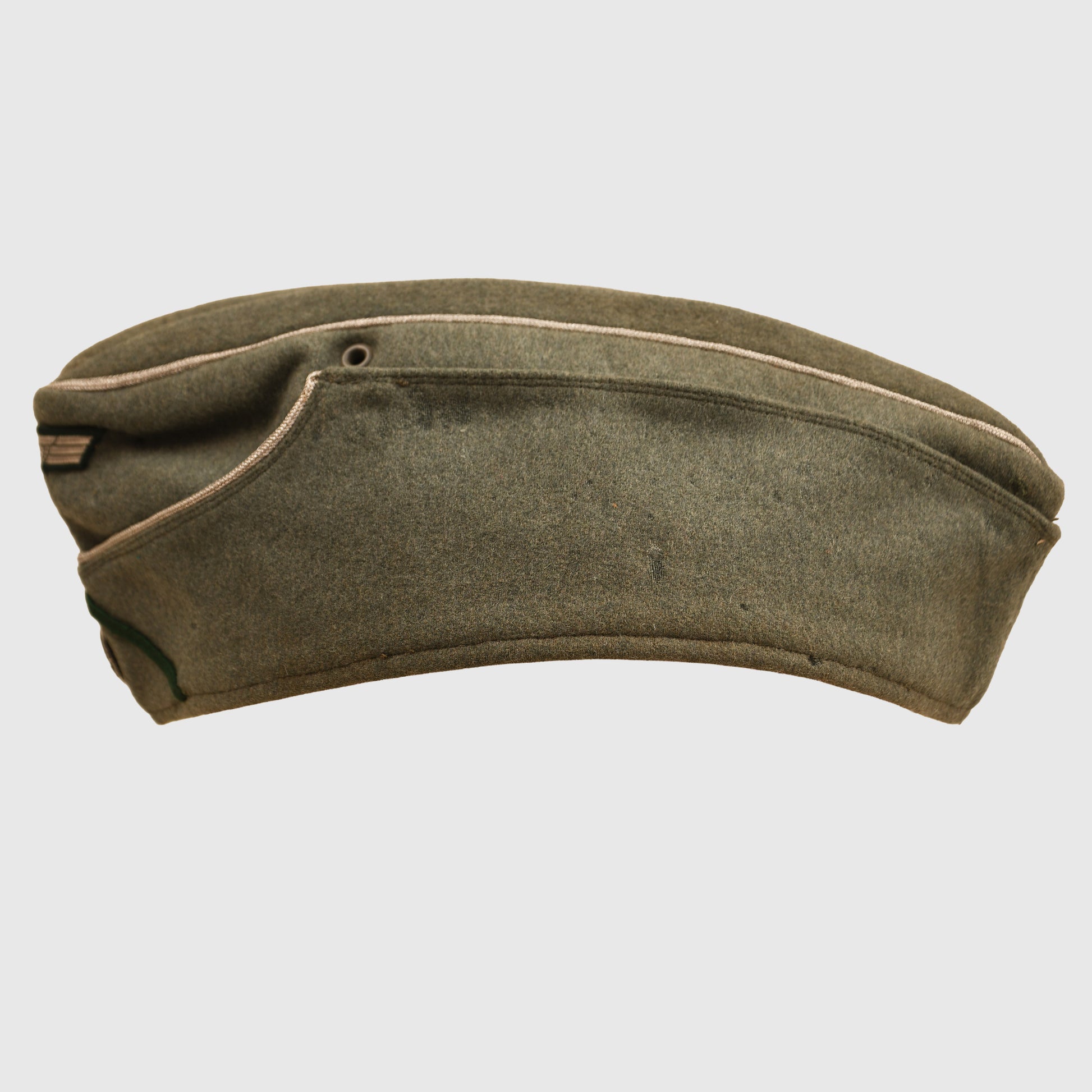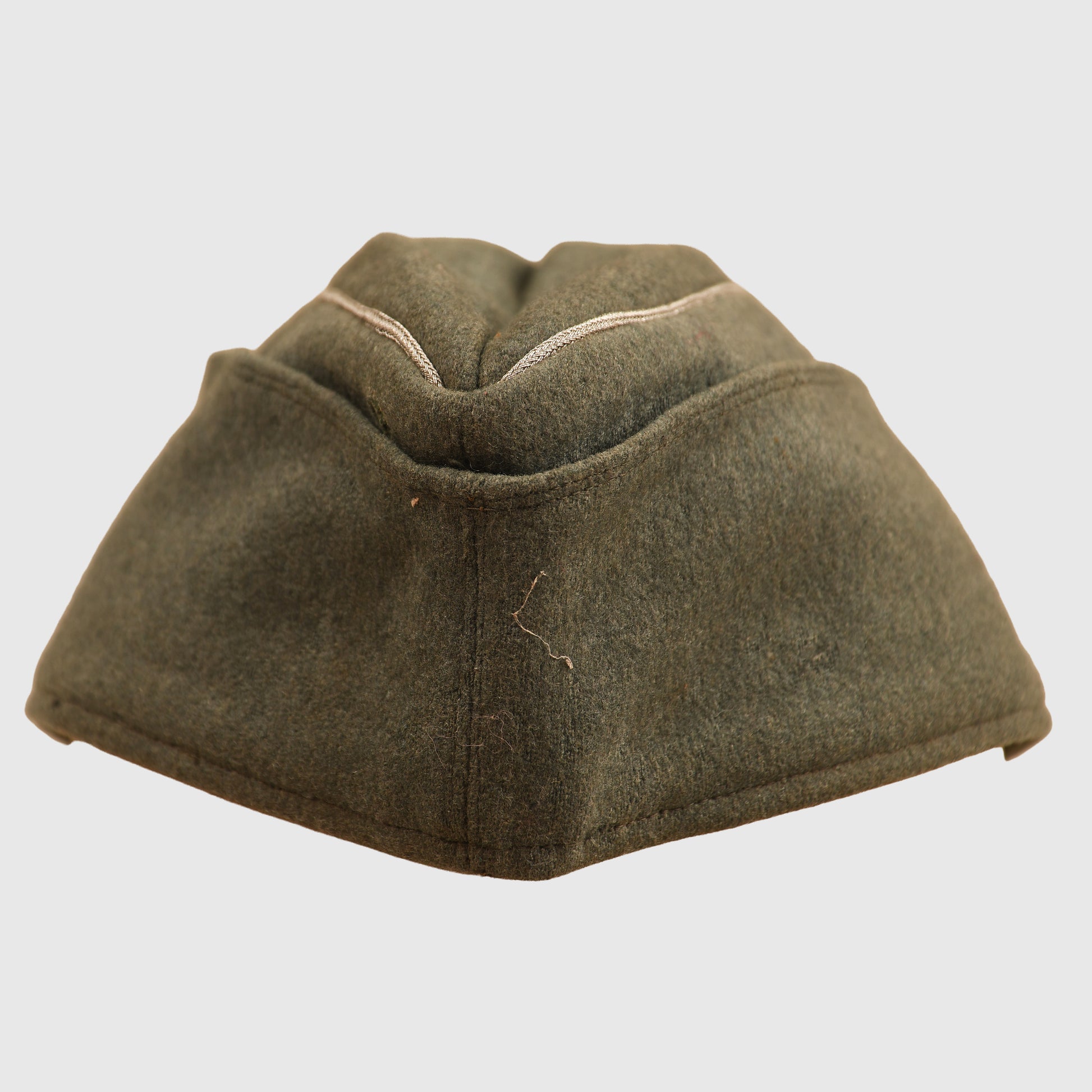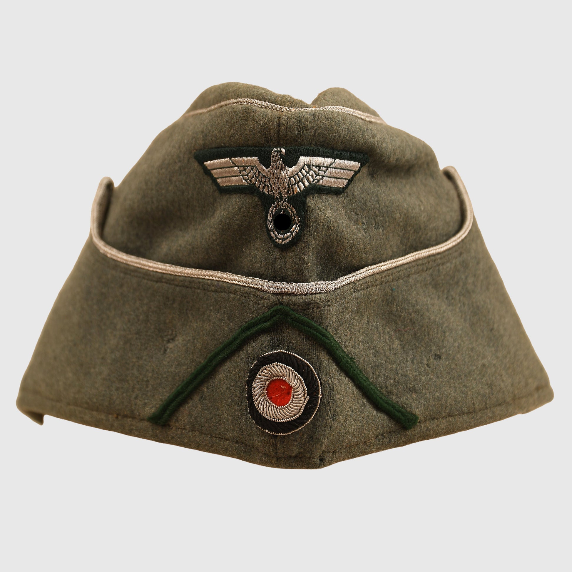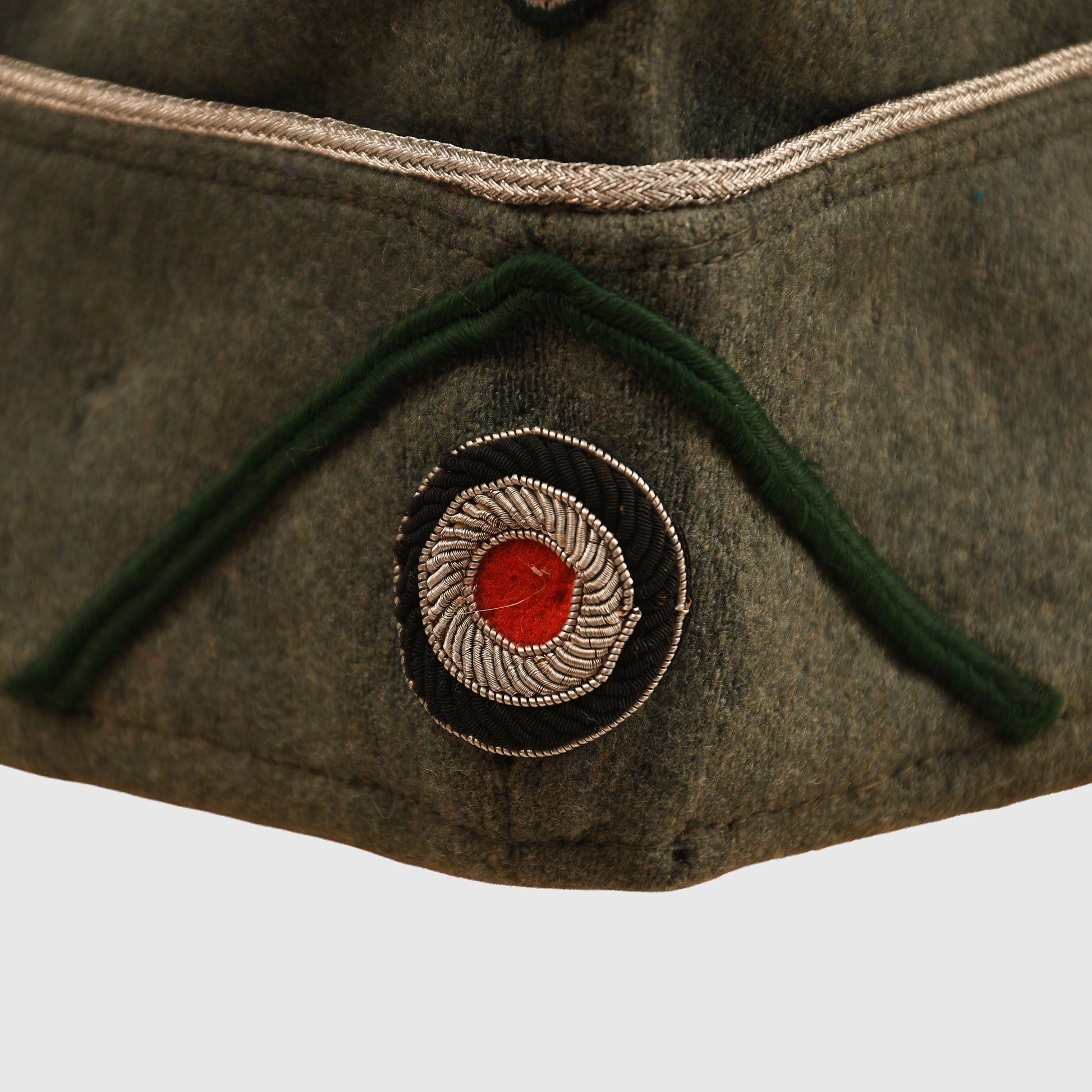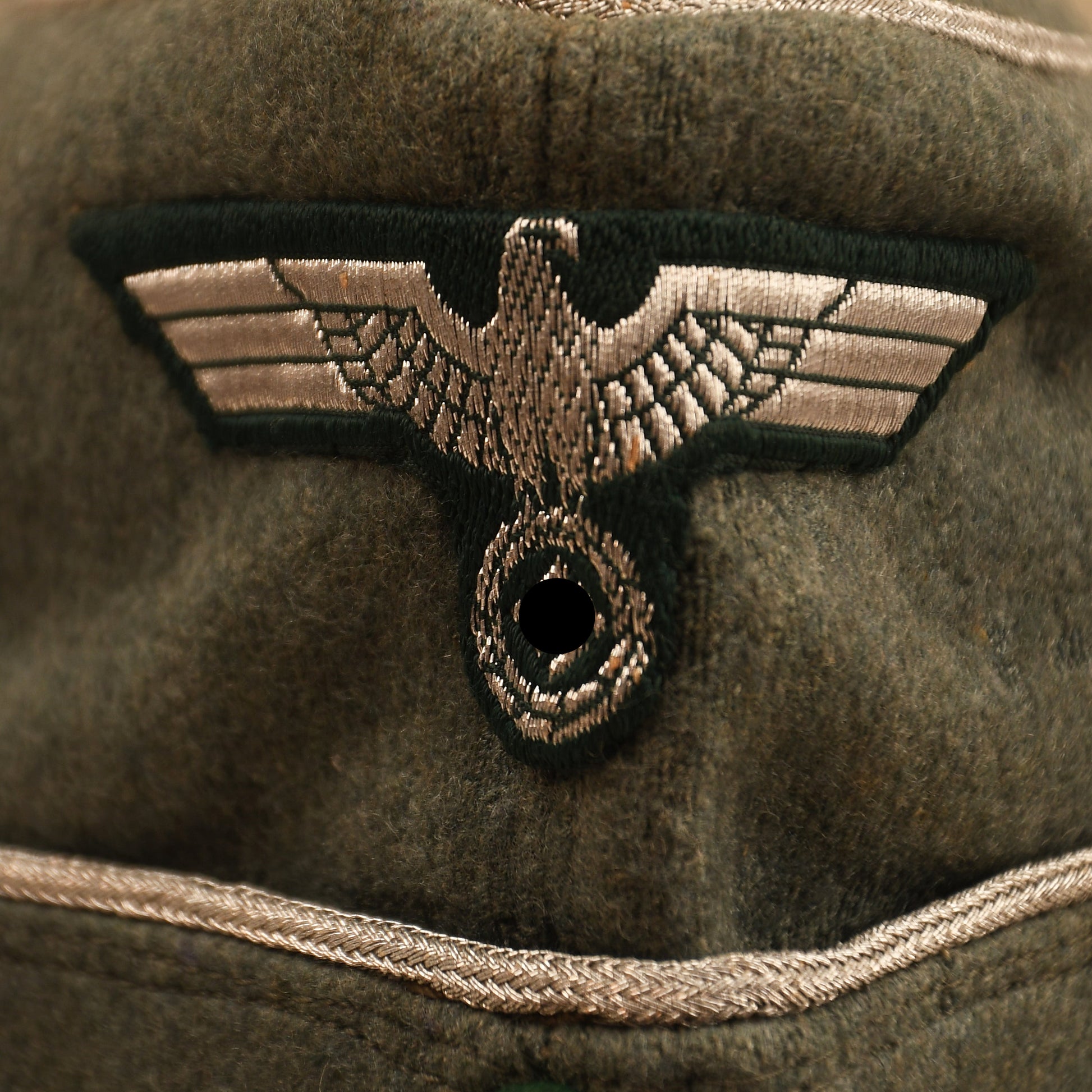 A nice worn example of an officers overseas cap, showing minor moth tracking to the nap only. Fitted in the correct officers configuration with silver waffenfarbe to the crown and front scallop. Interior features slightly worn grey brushed cotton lining stamped size ‘59’ with an additional designation ‘H12’ of unknown meaning. Soft grey ersatz half-moon forehead lining present. The cap is complete with its correct officers Bevo silver wire eagle on a dark green background, administration green waffenfarbe, and matching bullion wire cockade.