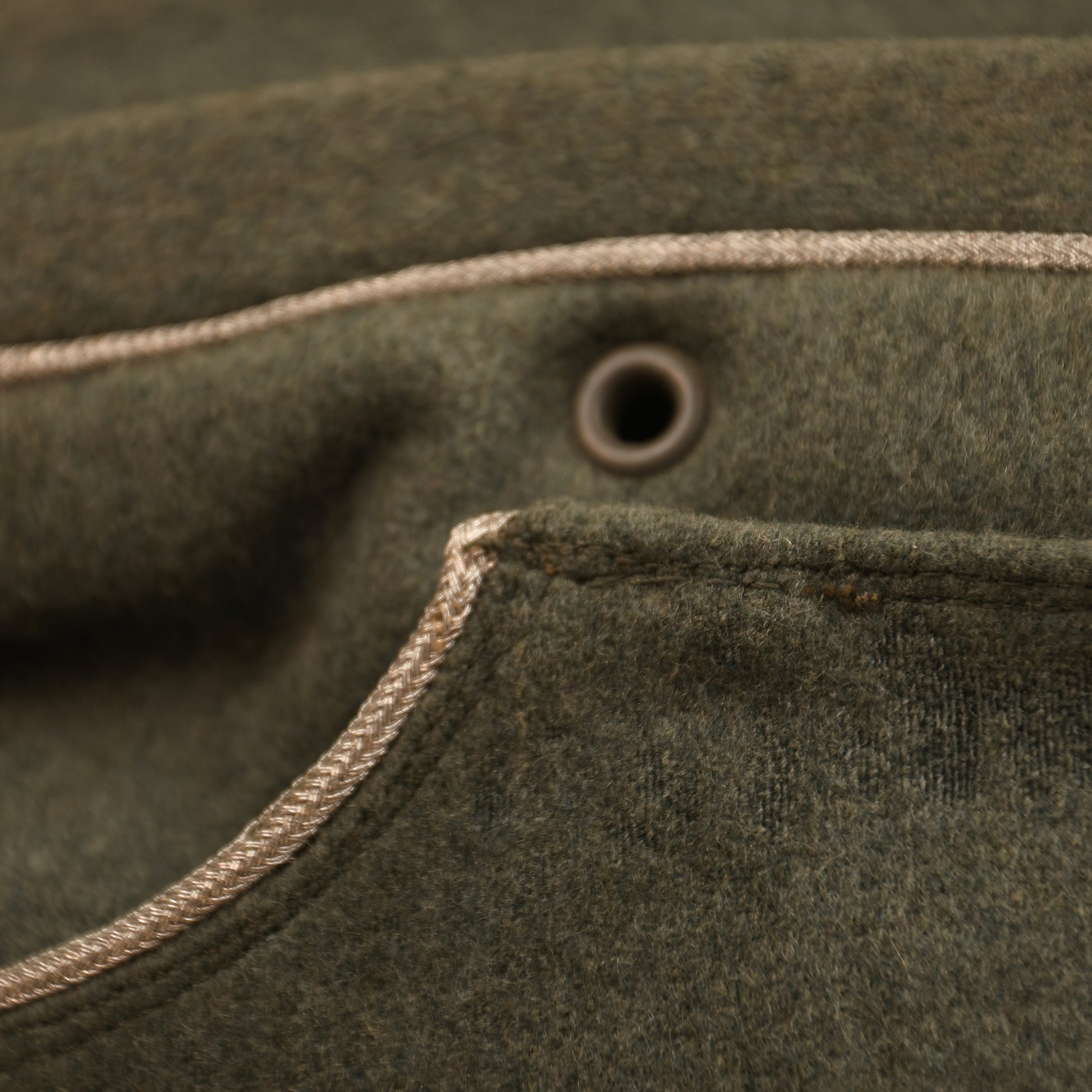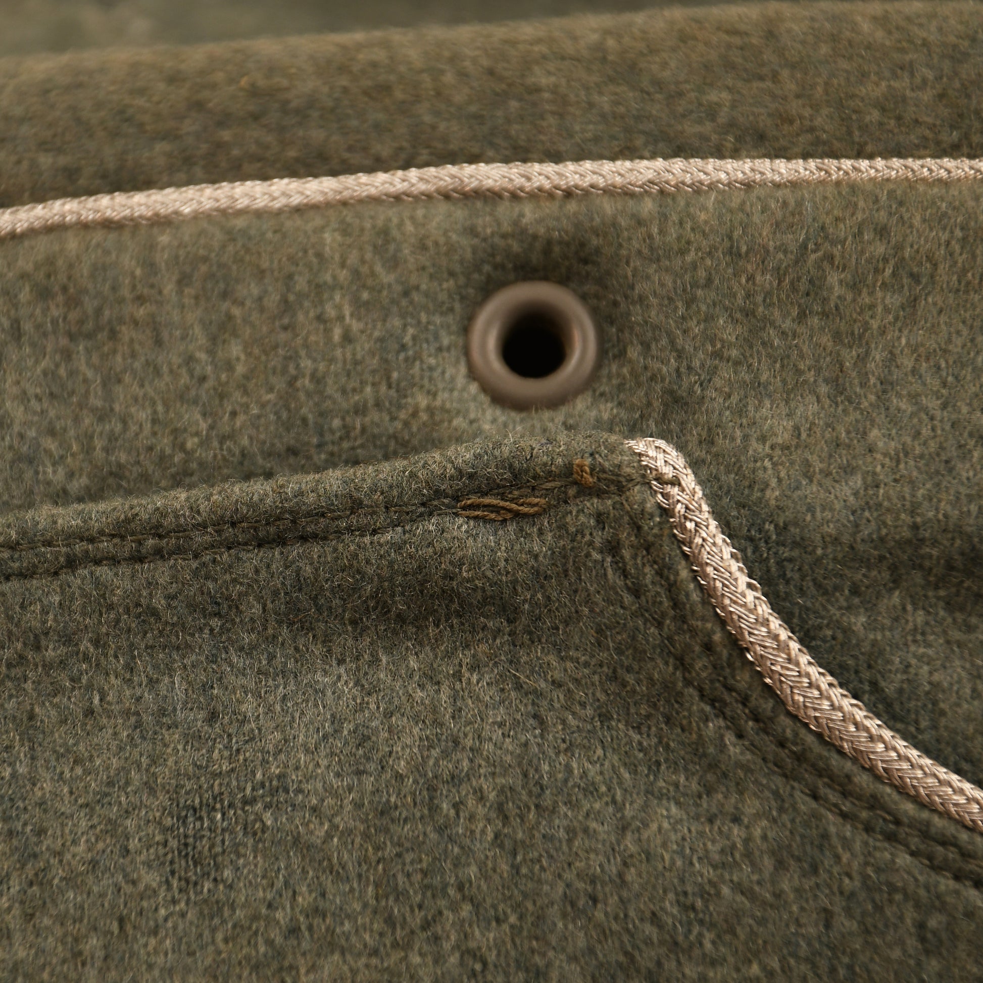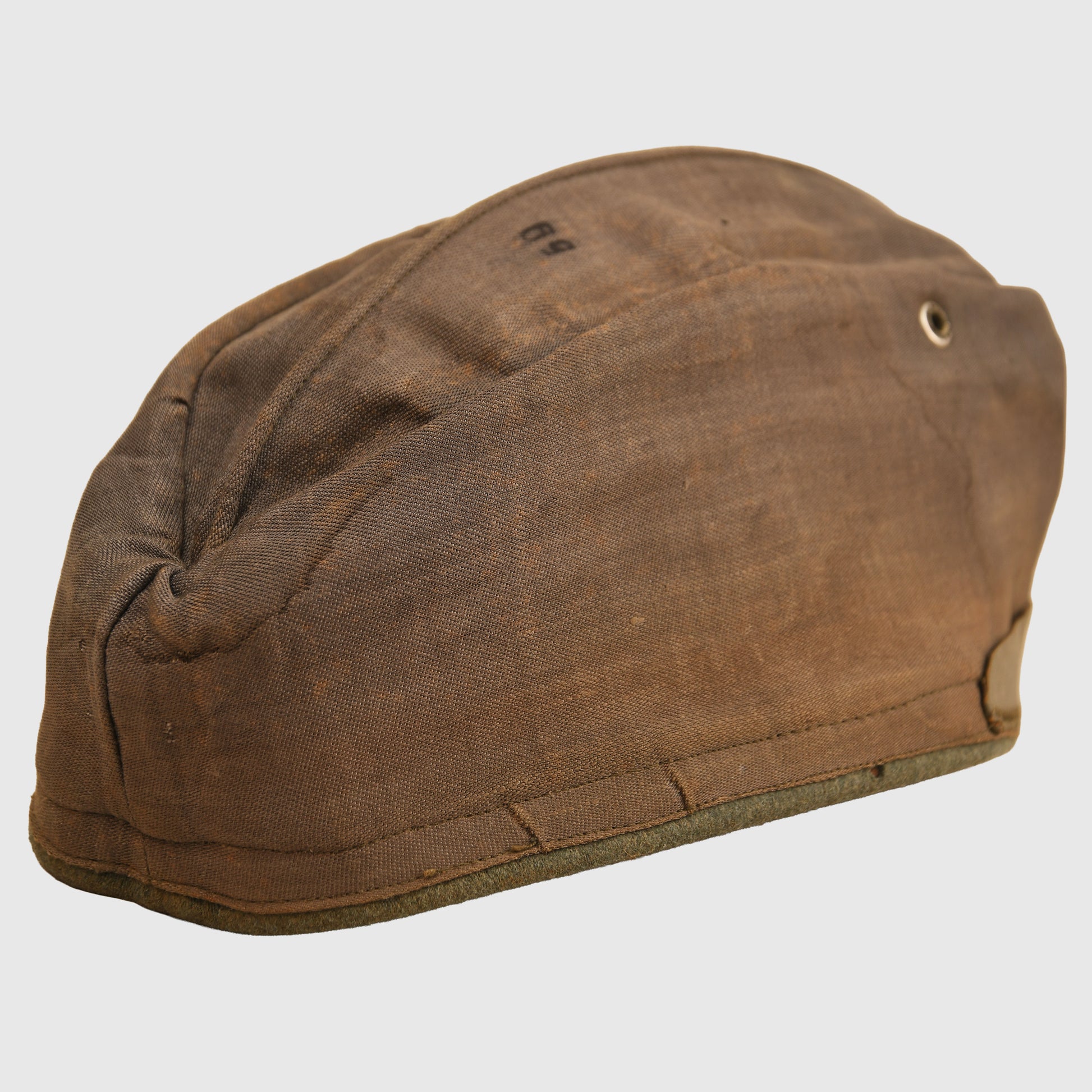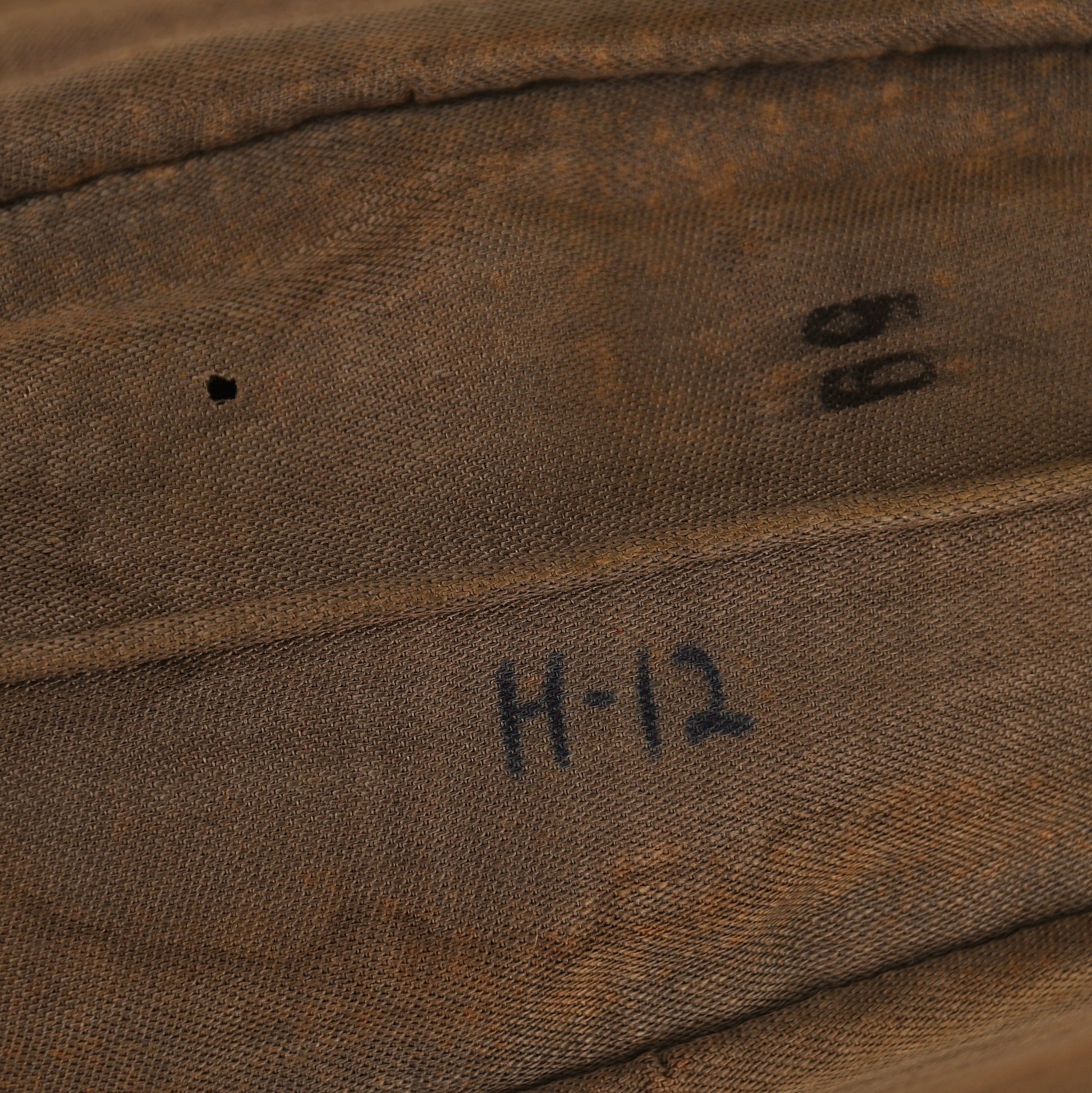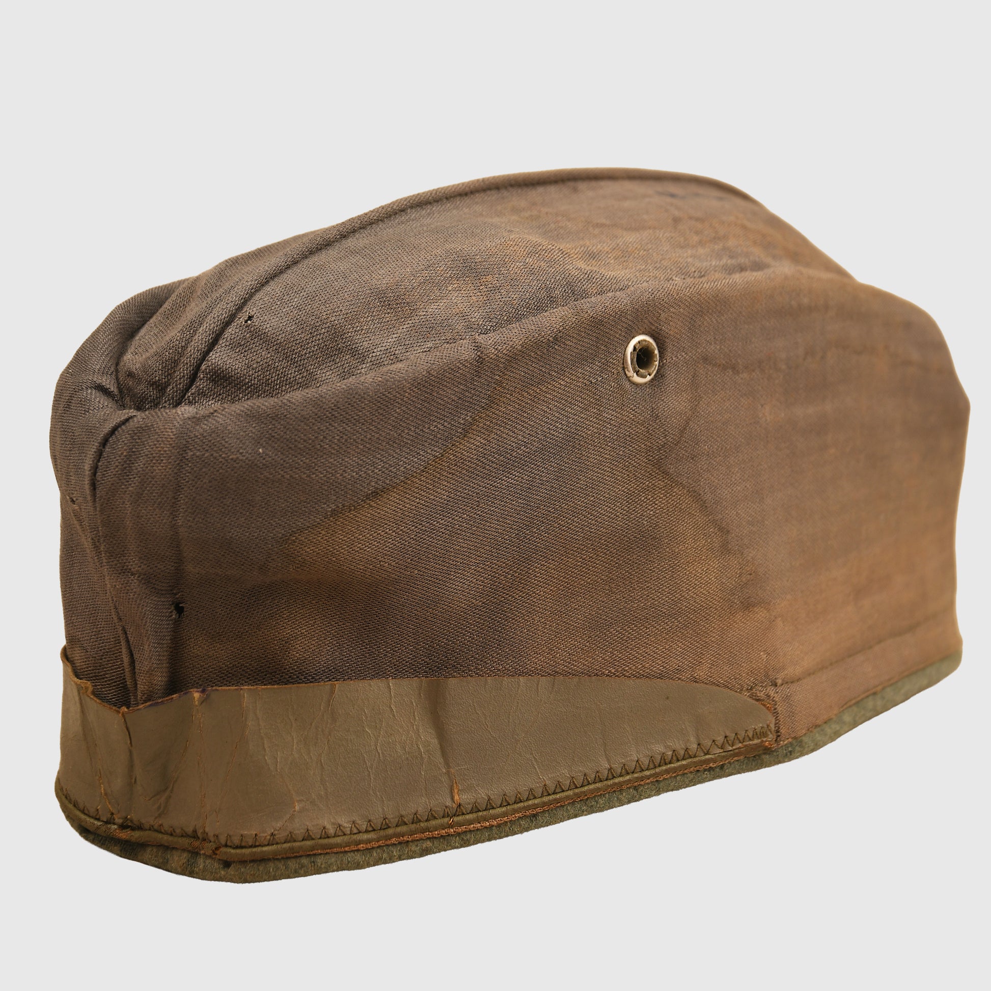 A nice worn example of an officers overseas cap, showing minor moth tracking to the nap only. Fitted in the correct officers configuration with silver waffenfarbe to the crown and front scallop. Interior features slightly worn grey brushed cotton lining stamped size ‘59’ with an additional designation ‘H12’ of unknown meaning. Soft grey ersatz half-moon forehead lining present. The cap is complete with its correct officers Bevo silver wire eagle on a dark green background, administration green waffenfarbe, and matching bullion wire cockade.