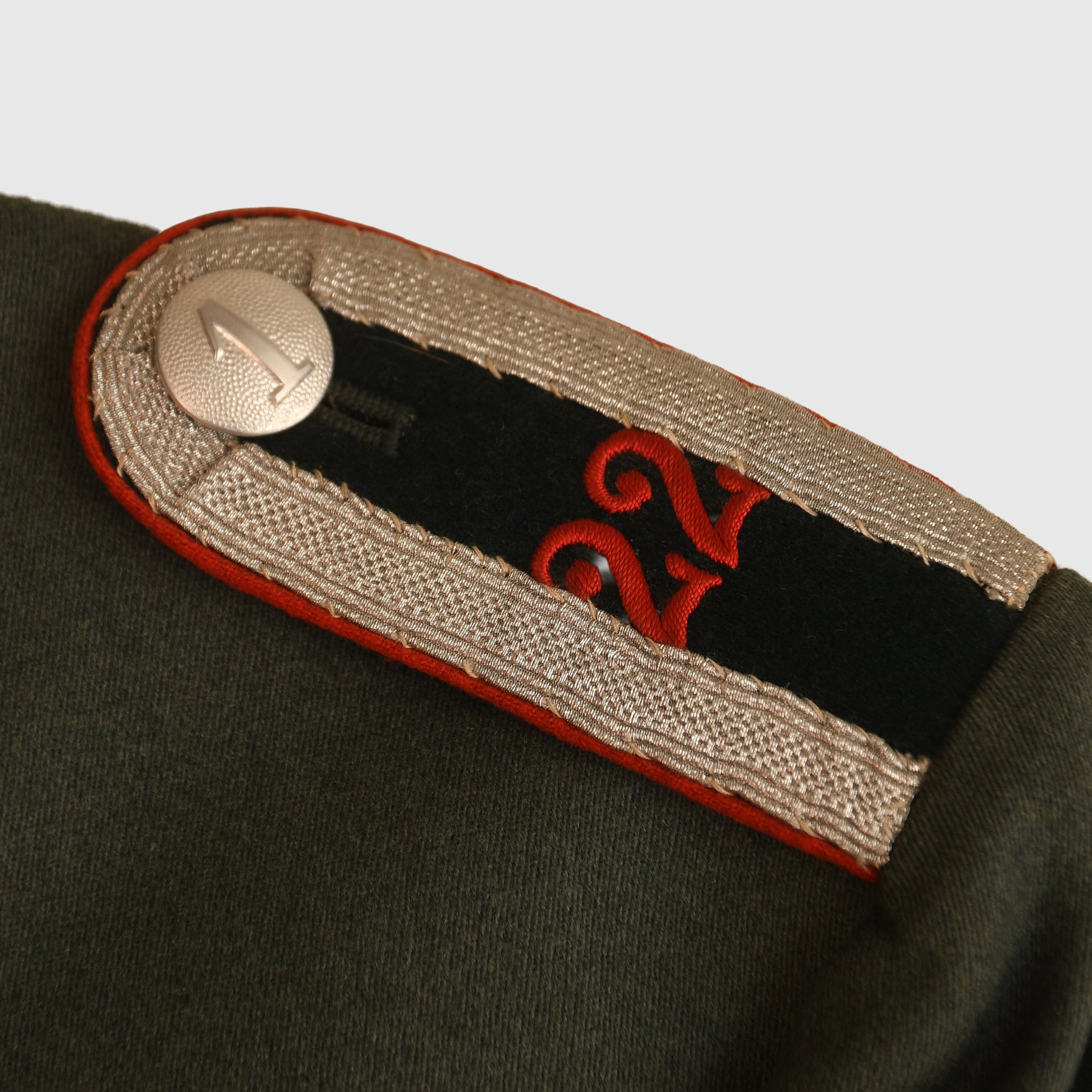 A superb large-size parade uniform of an Artillery Regiment 22 NCO, comprising tunic and matching trousers. The tunic is completely moth-free, with vivid red waffenfarbe detailing on all fittings. Silver tress shoulder boards feature Number 1 Company buttons and embroidered Regiment 22 numerals at the centre of the dark green boards. A soft-wire NCO breast eagle is professionally fitted. The uniform includes a shield-type shooting award with Third Reich eagle and swastika for Groups 1–4. Matching long grey trousers are finished with a striking red side stripe, while NCO lace decorates the upper collar. A fine, complete set in excellent condition.