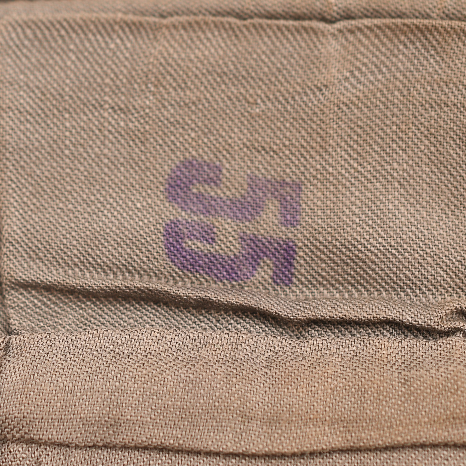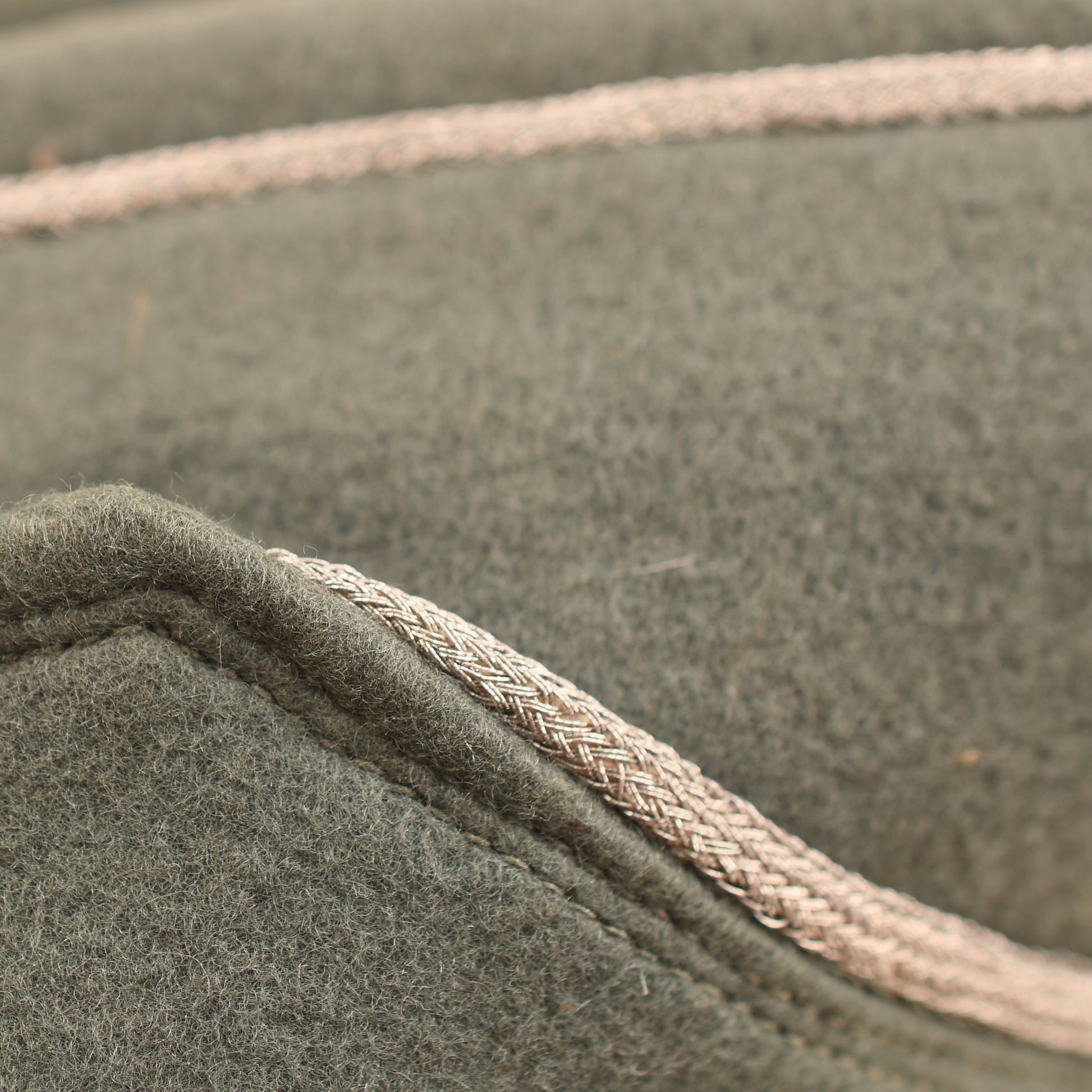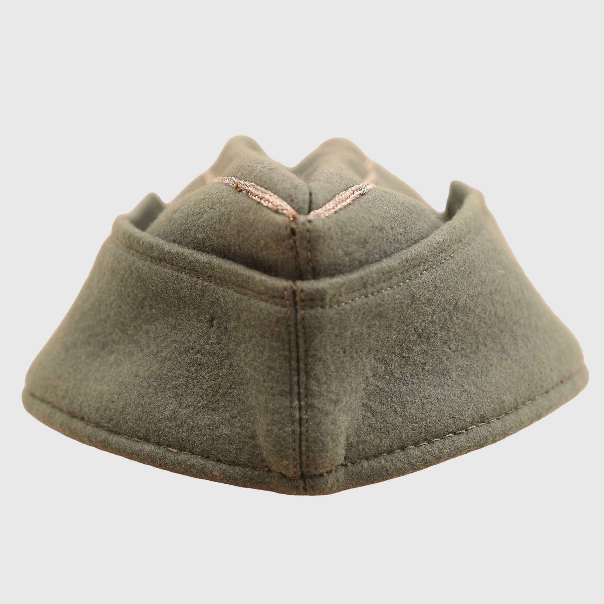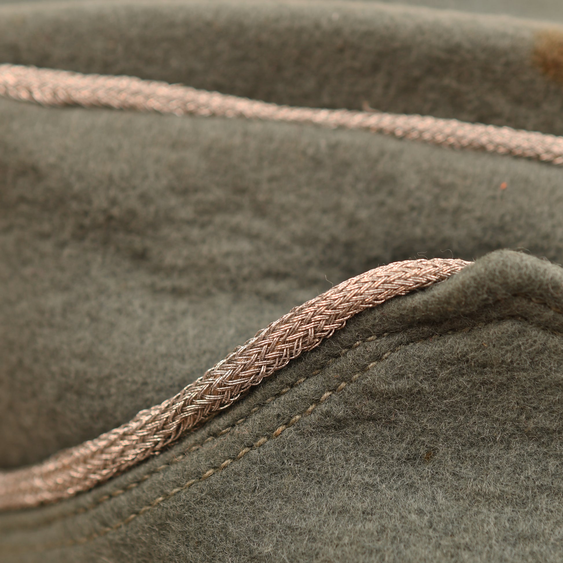 A heavy Melton material officers overseas cap in a slightly lighter grey shade. The cloth displays excellent nap with no moth damage. Features silver piping to the crown and front scallop, mint bright Bevo woven silver eagle on green background with matching cockade, and red inverted waffenfarbe. Interior lined in grey brushed cotton, stamped size ‘55’, with a grey leather forehead sweatband showing minor cracking. One small unidentifiable stain to the crown area.