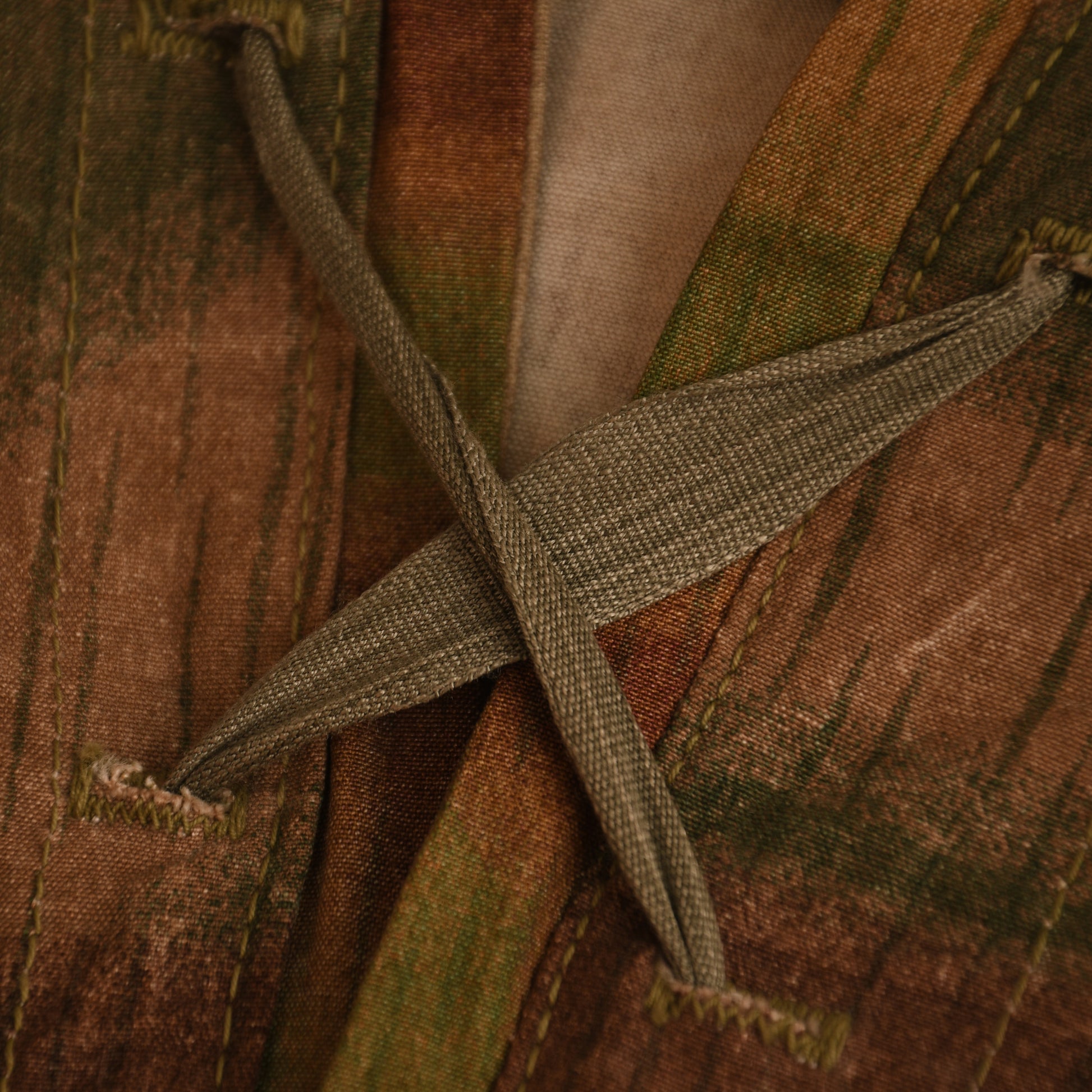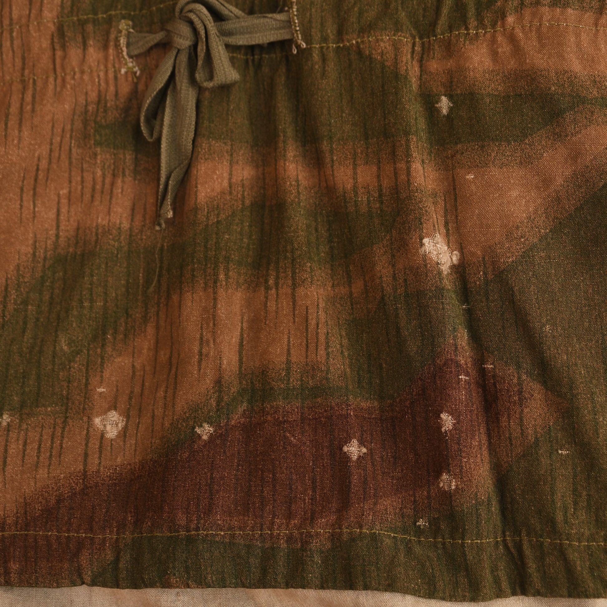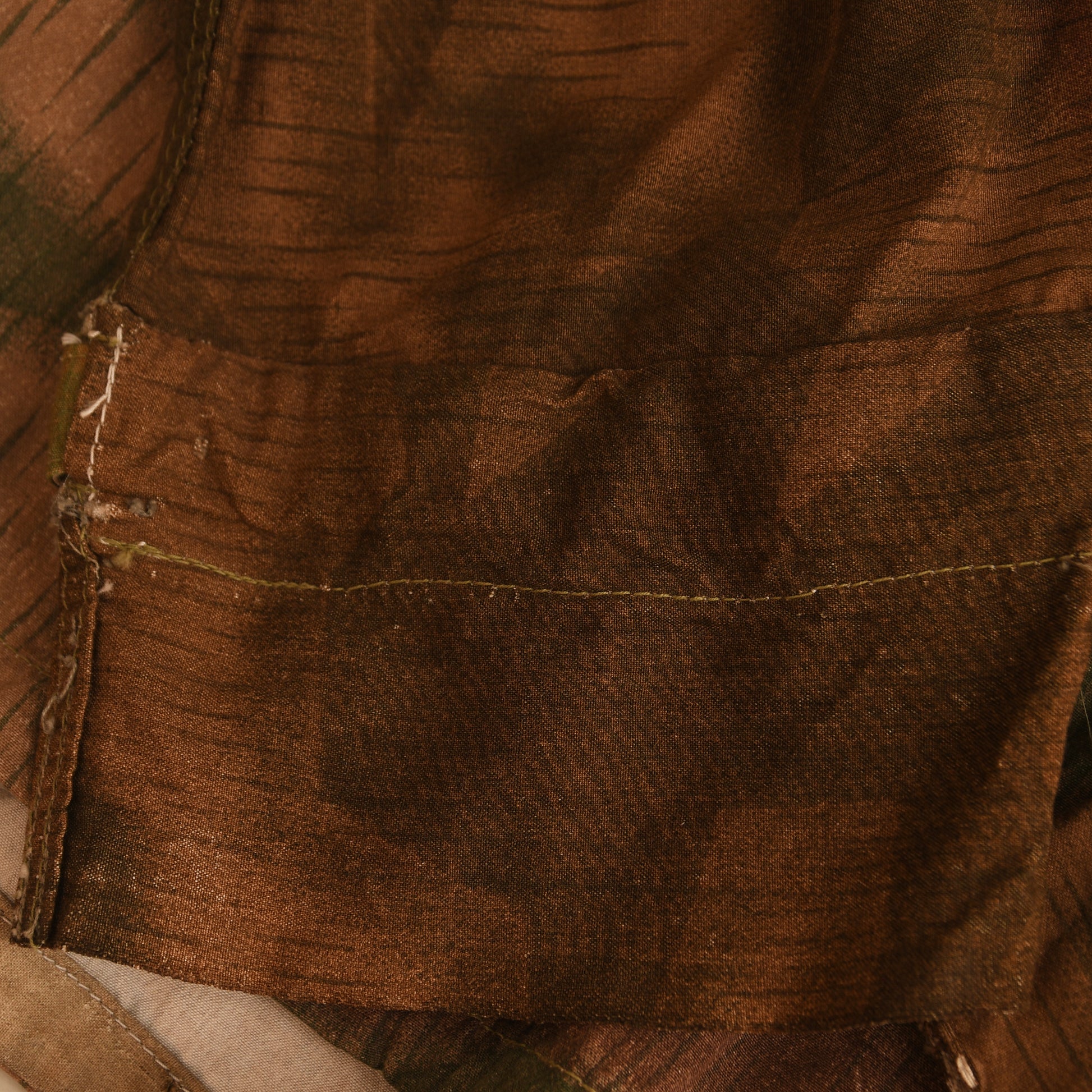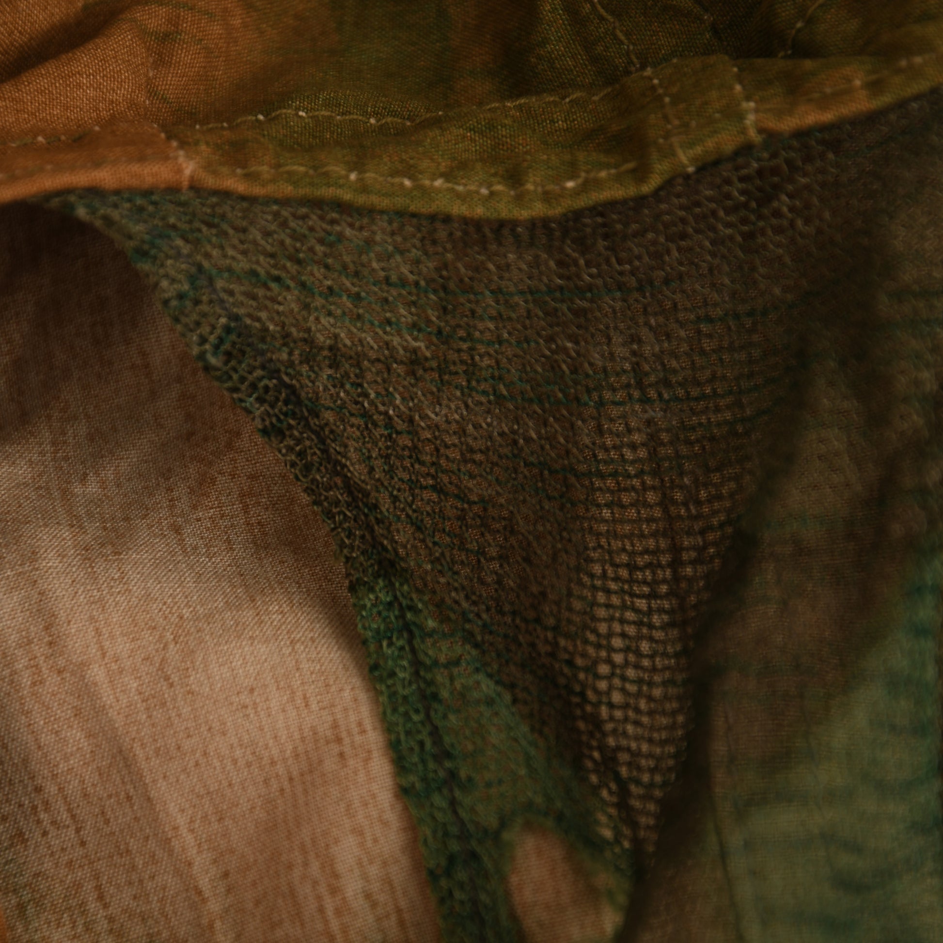 The hood is a darker tan and water shade than the main body and retains the original sniper veil. All original manufacturer closure tapes remain intact. Minor small nicks are present to the lower front of the smock just below the closure cord. Faint RB number markings are visible on the interior of one access pocket flap. The material around the smock’s opening, used for concealment, is also a slightly different camouflage tone than the main body. All original paper buttons on the cuffs are present, with adjustable closure tabs in a contrasting camouflage pattern.