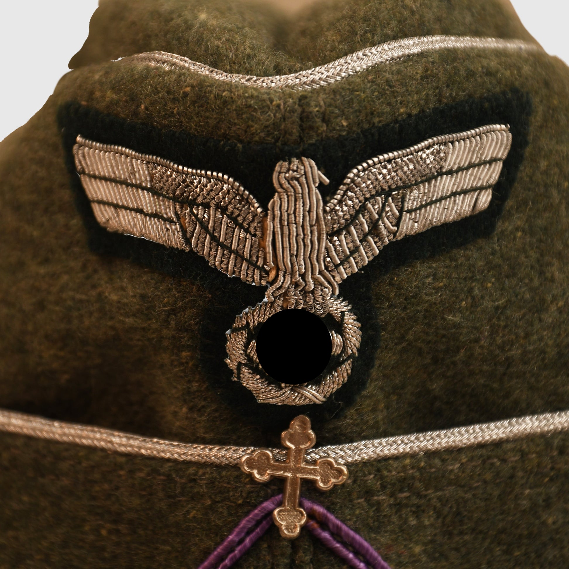 This is a remarkably rare piece of specialist headgear, representing the Chaplains Department of the German Army. The cap is a size 57 officer's overseas pattern and is in superb condition, being completely free from moth damage.