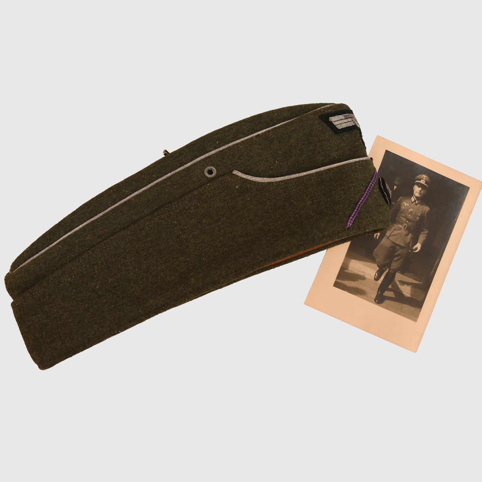The interior is lined with a grey-green satin material in excellent condition. It features a light tan leather forehead sweatband which bears the stamped mark Qualitat Marke. Adding significant historical value to this piece is an accompanying original photograph of the owner in his chaplain's uniform; while he is wearing a visor cap in the image, it provides a direct personal link to the original wearer of this overseas cap.