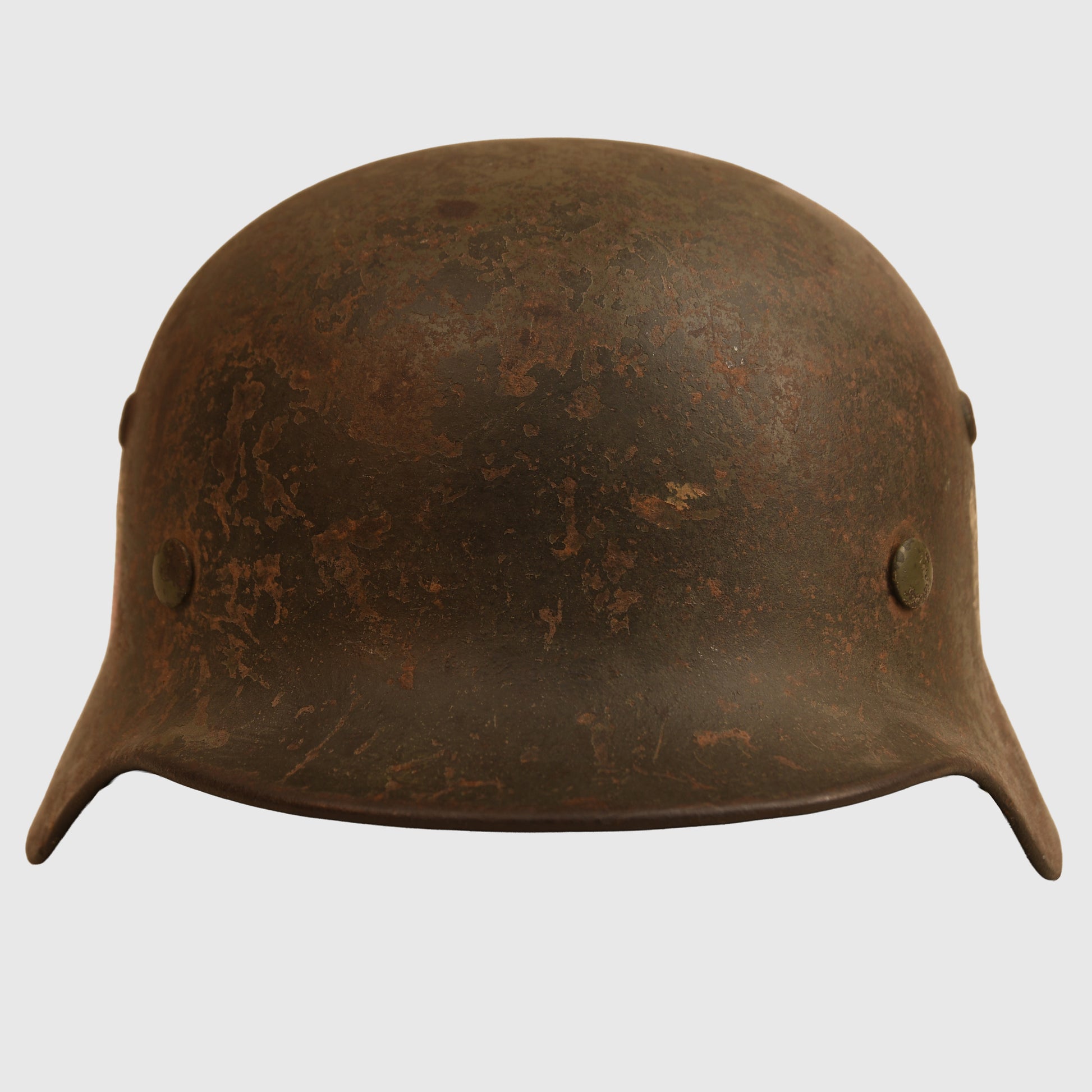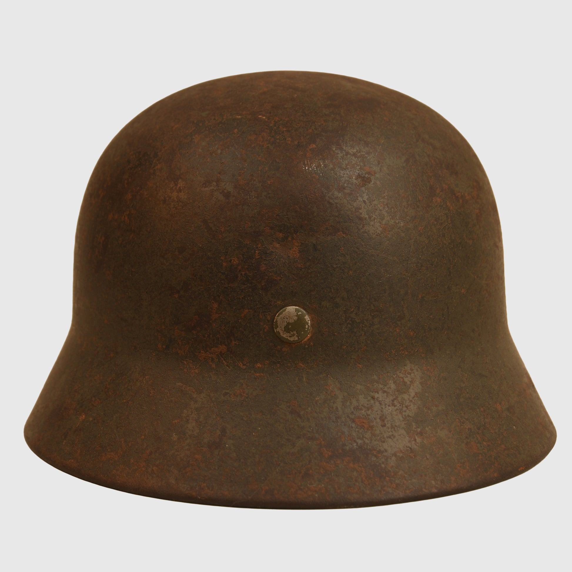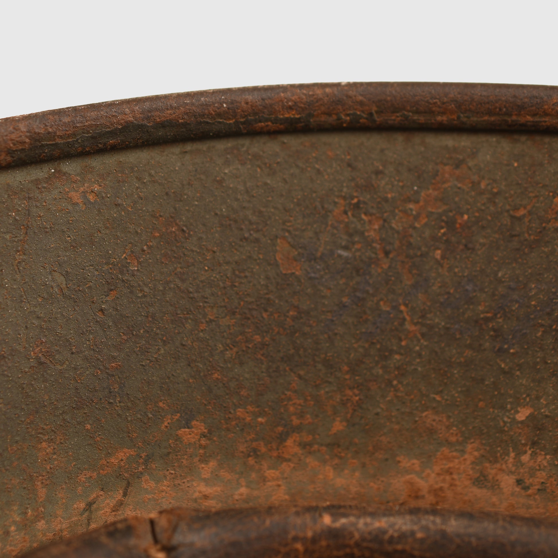A fine example of a size 62 M35 double decal combat helmet. Both decals remain clear, showing light abrasions as visible in our web images. The shell appears to have received a secondary coat over the original apple green finish, with most of the paint still present, including on the liner retaining rivet heads. The interior features the original 1935-pattern aluminium liner band, dated 1940, complete with its leather liner — all eight tongues intact, though two are slightly delicate. The original chinstrap is also present, showing age but remaining complete.