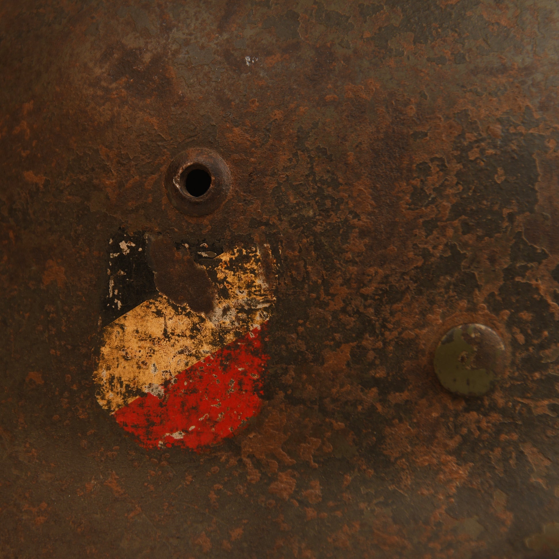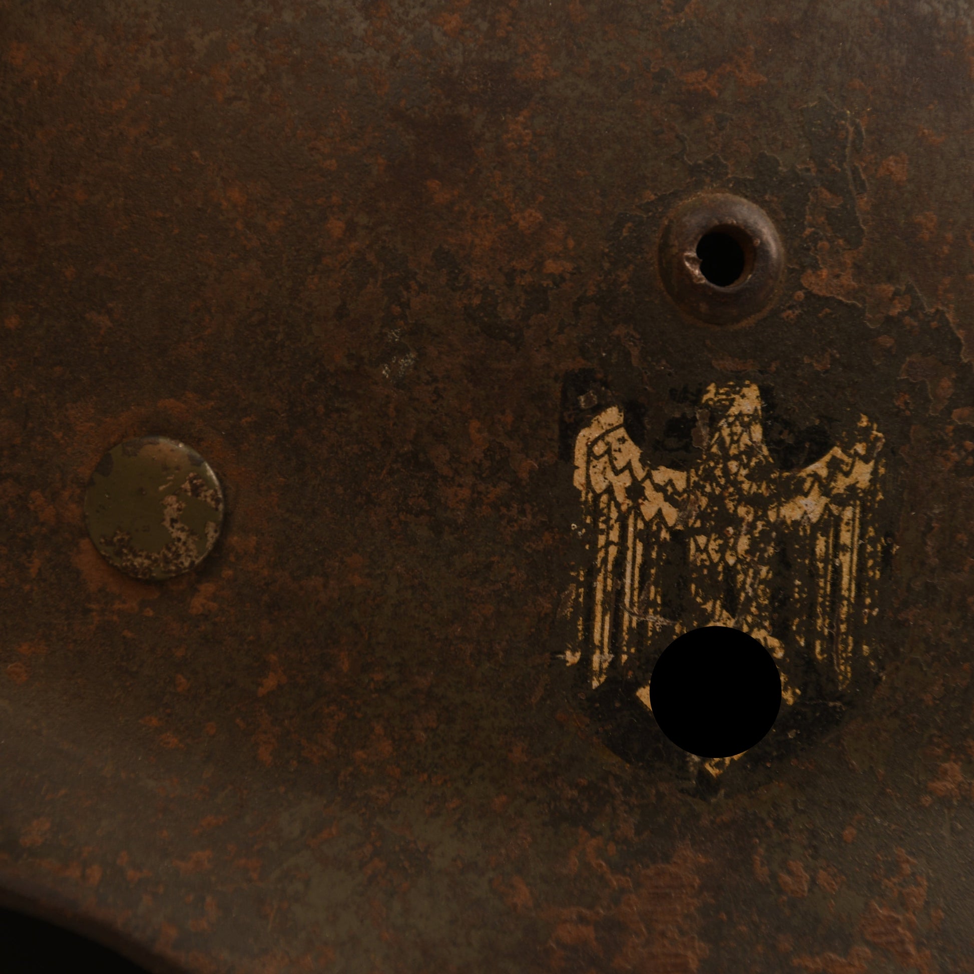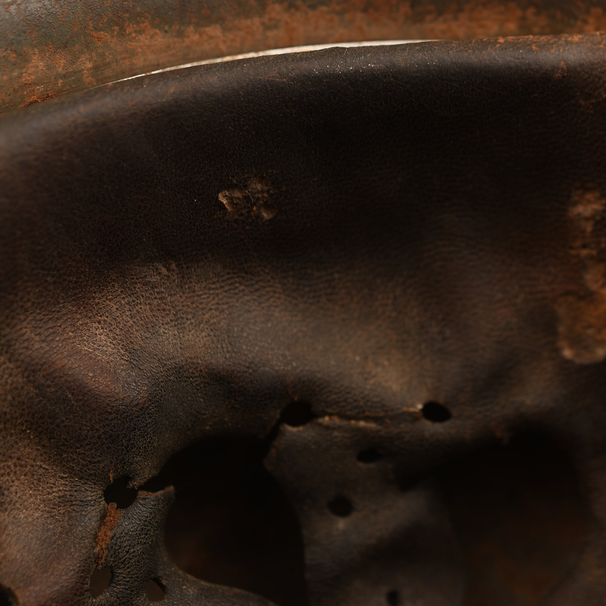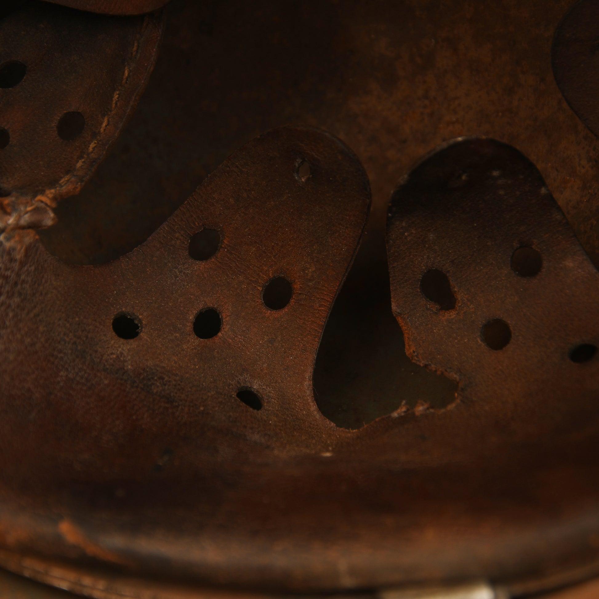 A fine example of a size 62 M35 double decal combat helmet. Both decals remain clear, showing light abrasions as visible in our web images. The shell appears to have received a secondary coat over the original apple green finish, with most of the paint still present, including on the liner retaining rivet heads. The interior features the original 1935-pattern aluminium liner band, dated 1940, complete with its leather liner — all eight tongues intact, though two are slightly delicate. The original chinstrap is also present, showing age but remaining complete.