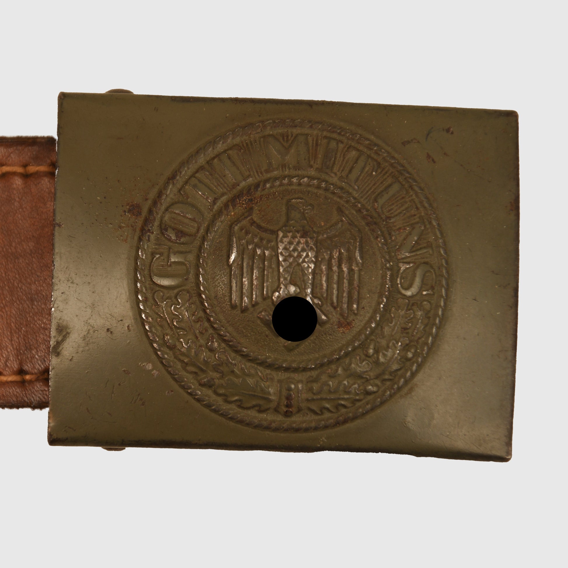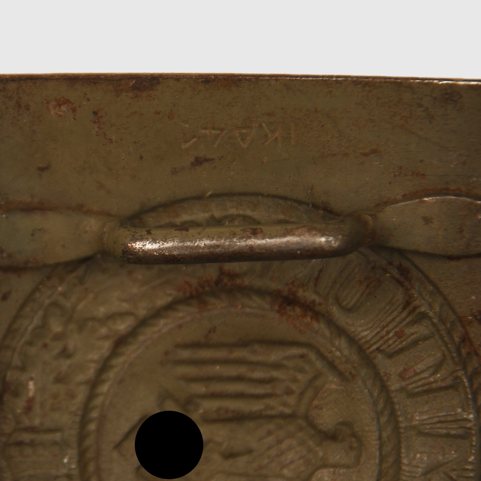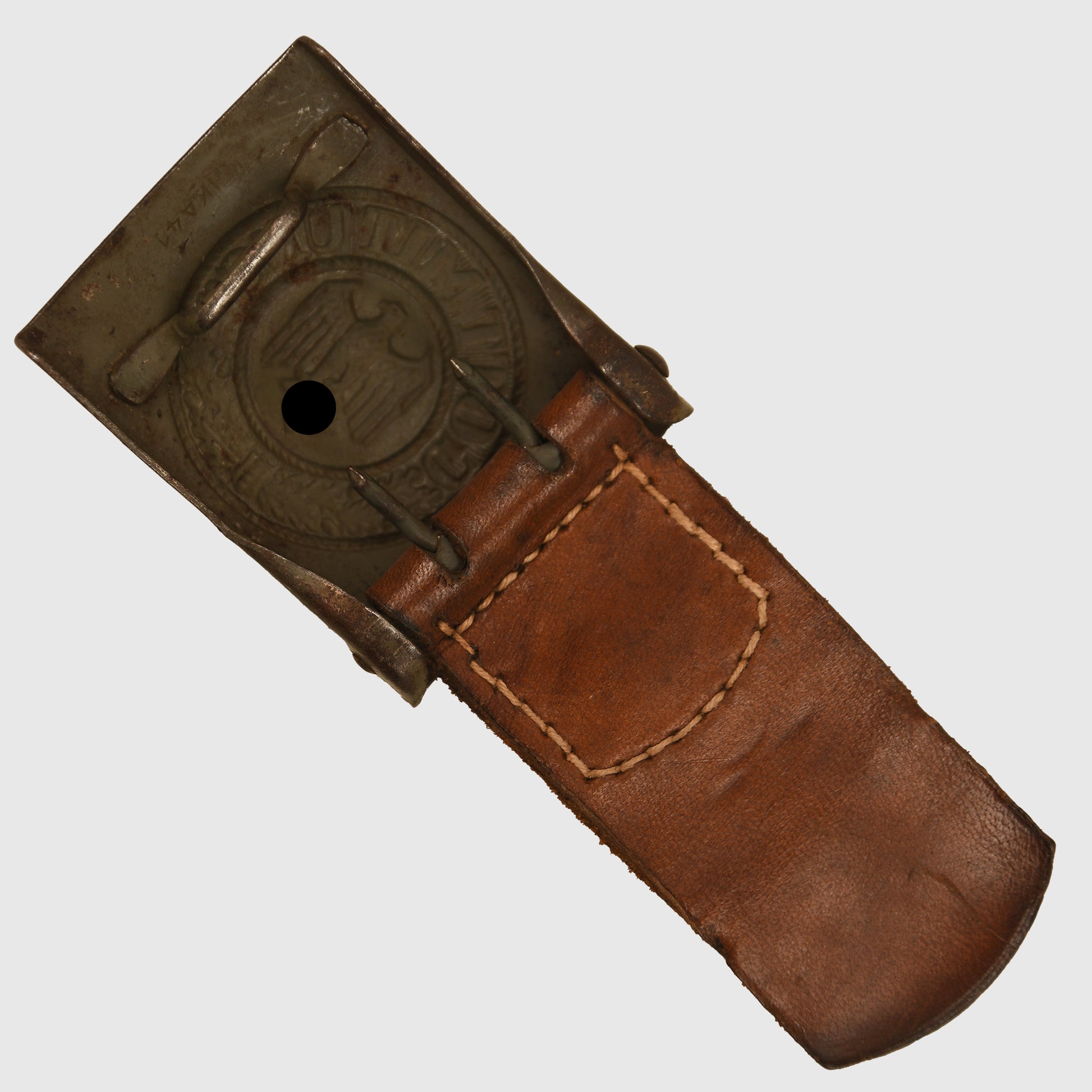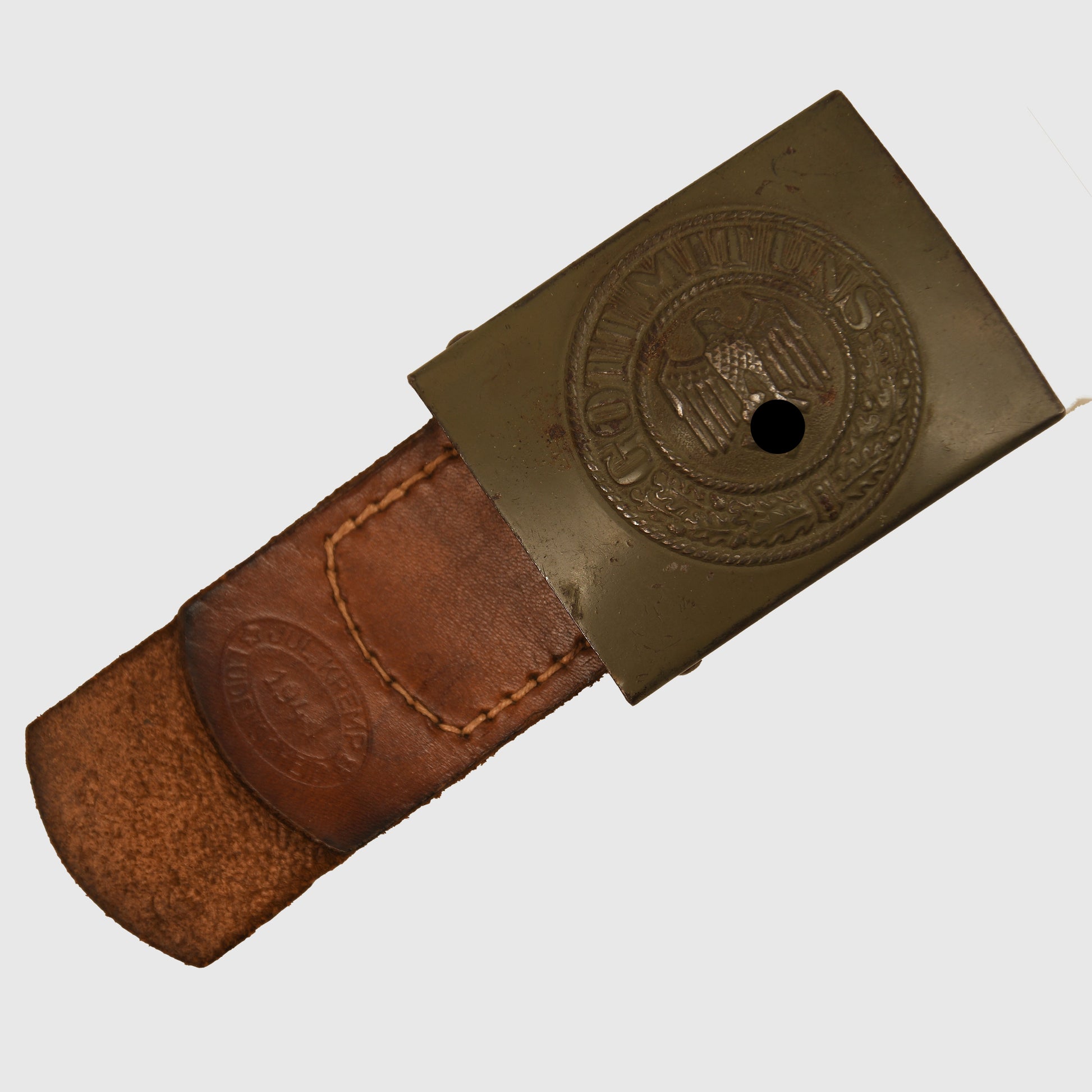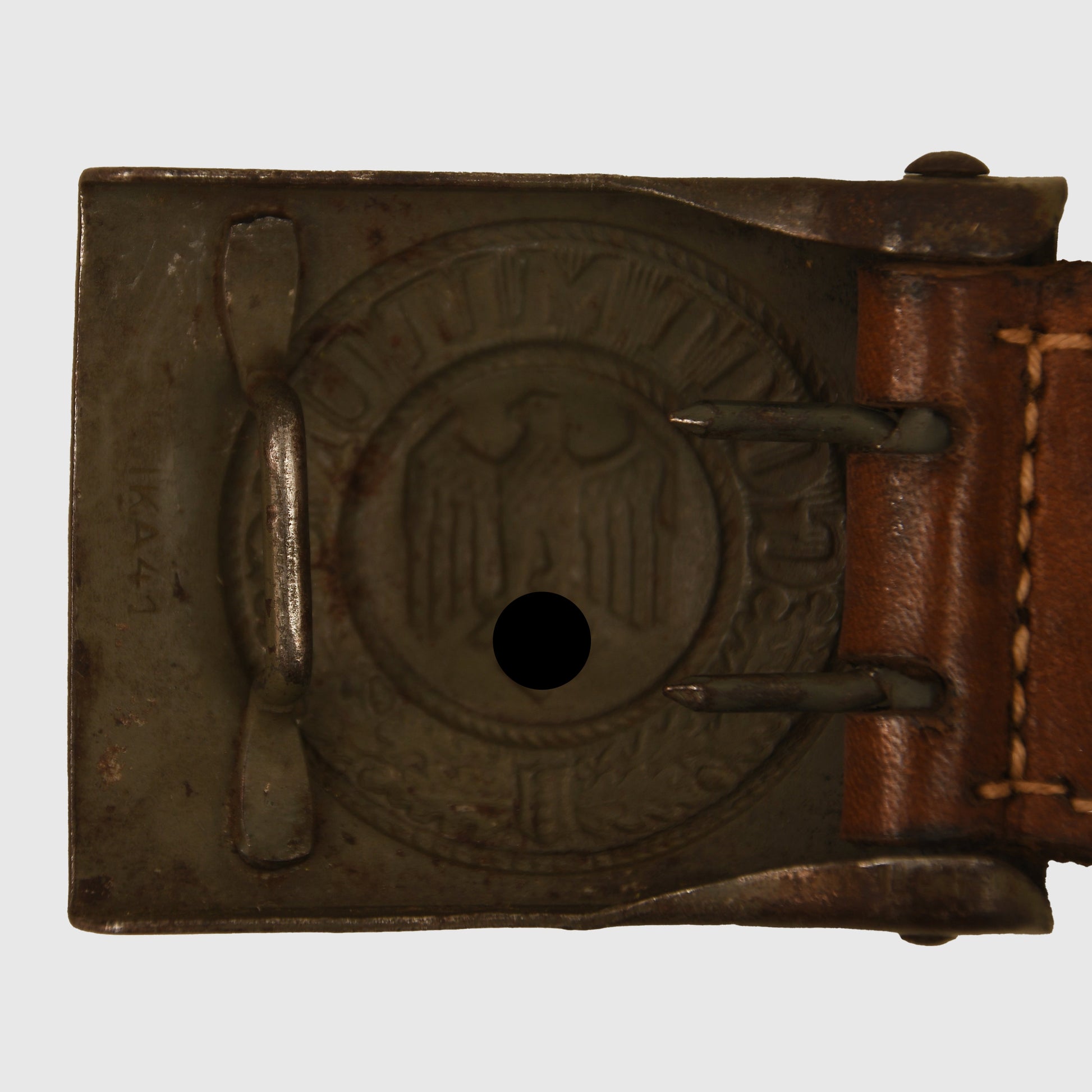 A very nice, virtually unworn example of the all one-piece stamped steel Army buckle, marked IKA 41. Aside from a few minor blemishes, the original paint finish remains largely intact. Accompanied by its original leather tab, maker marked Julius Kremp of Lüdenscheid, 1941.