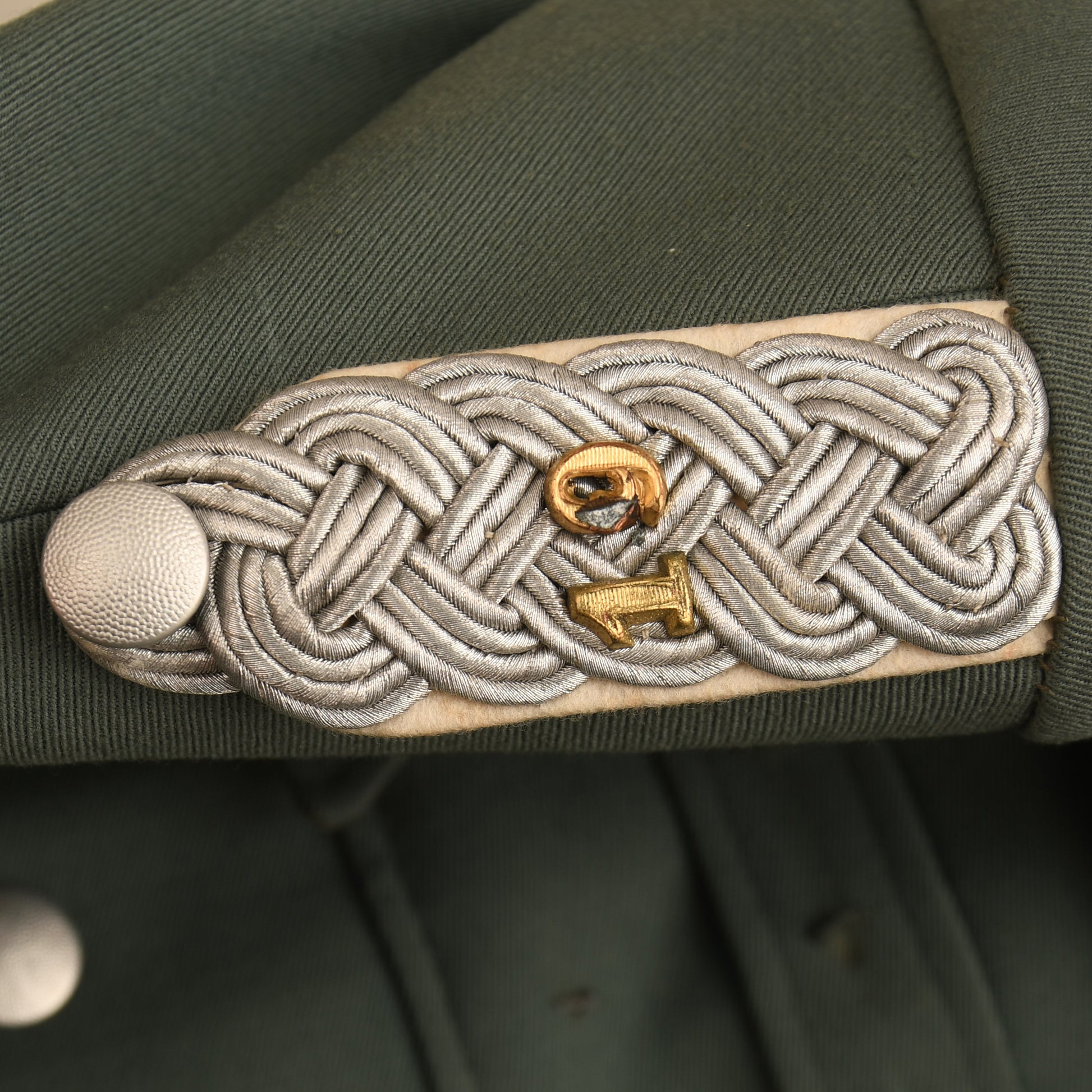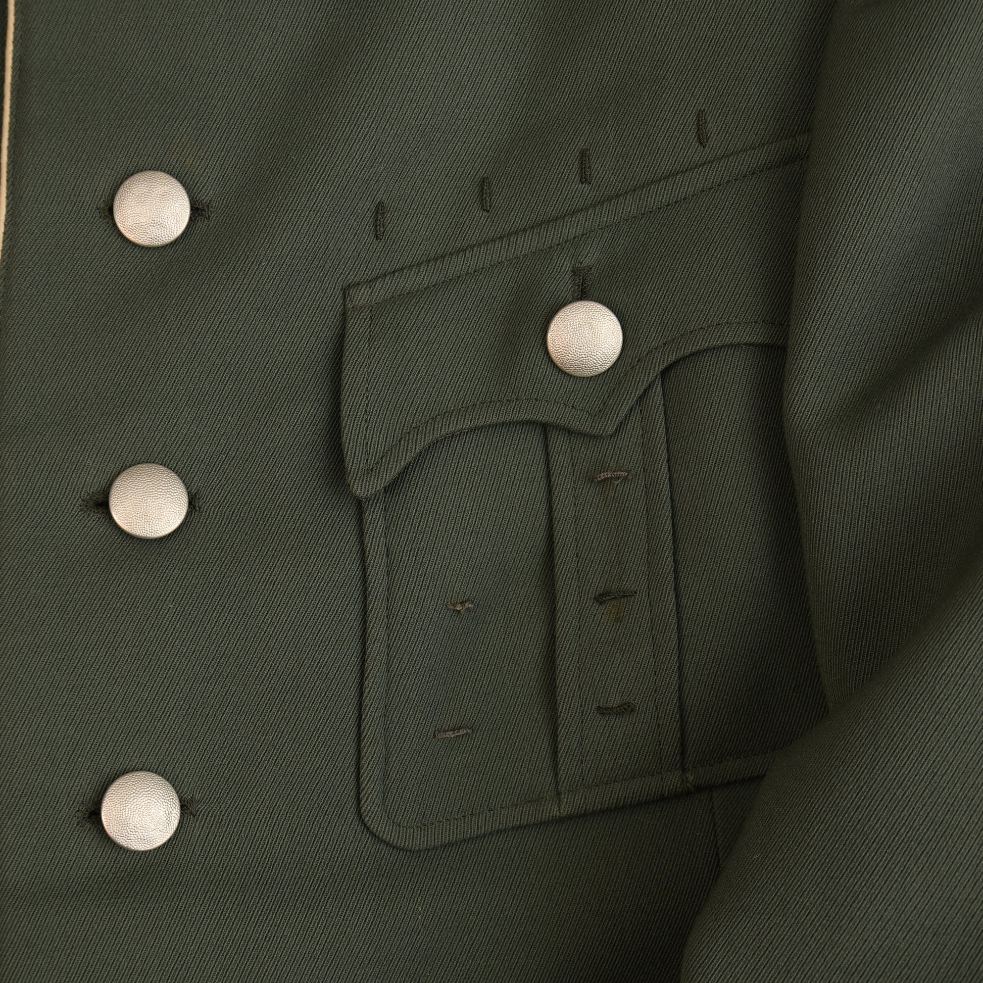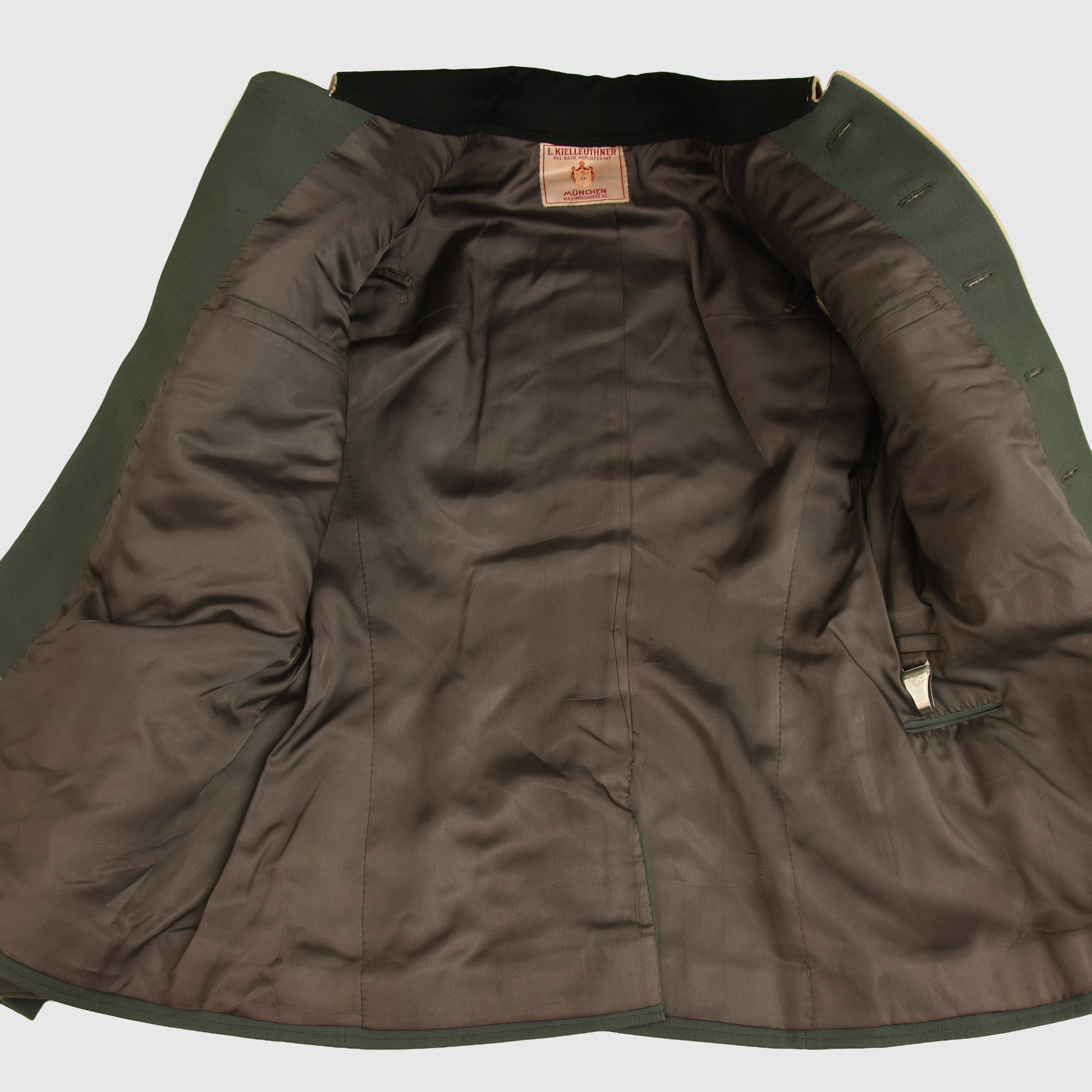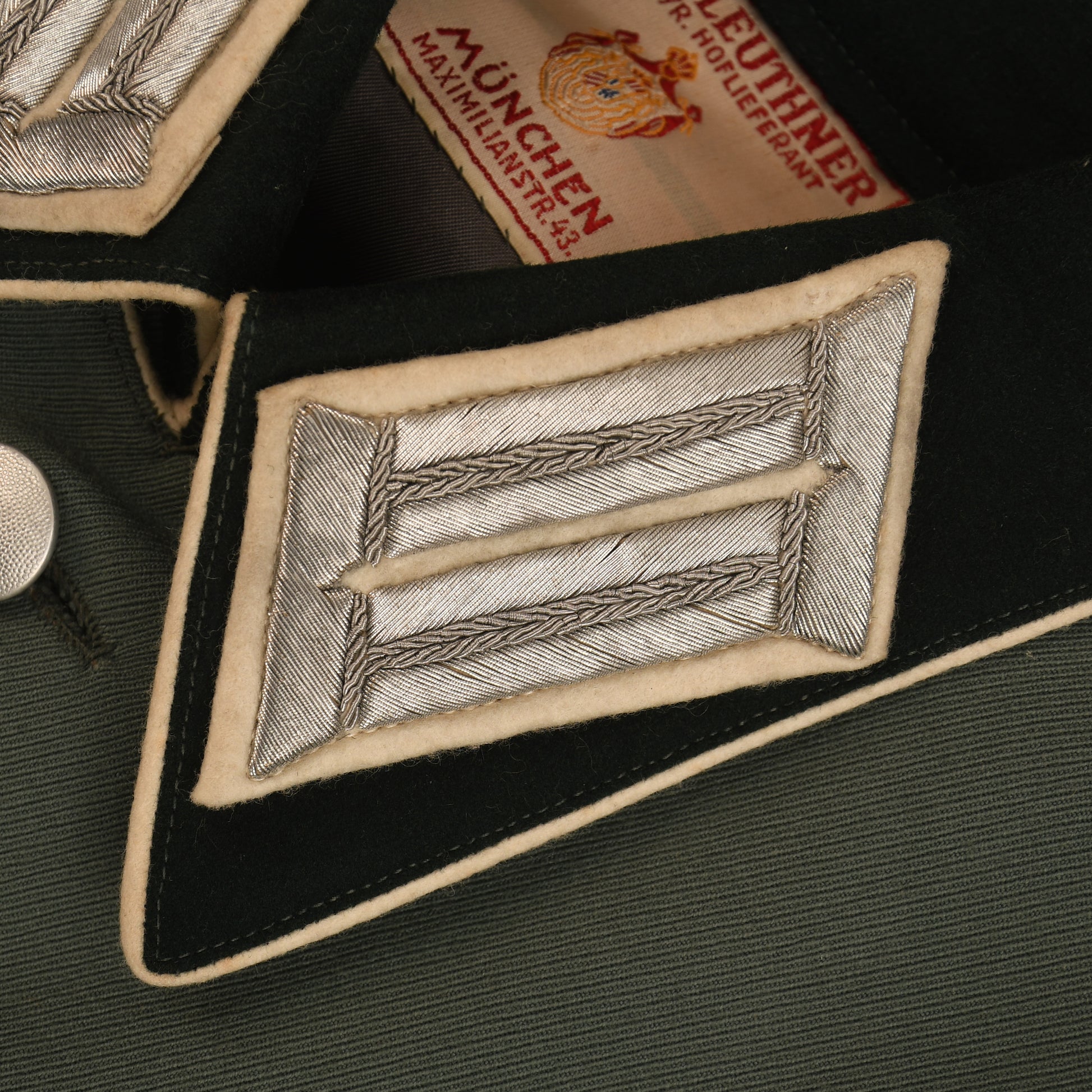 A most beautiful tunic constructed in good heavyweight officers material in field grey green having white waffenfarbe to all of the elements of the tunic. The rank of Major in the 19th Infantry Regiment, high quality breast eagle fitted with one strand of the upper left hand wing loose. Two loops for either a Spanish Cross or a German Cross to the left hand breast pocket as the tunic is worn. To the opposite side of the tunic are four loops for a long medal ribbon bar, a set of double loops and a further set of triple loops for awards. A fabulous red and cream maker’s label for the tailoring company of L. Kielleuthner of Maximillian Strasse , Munich. A hole has been tailored through the lower left hand pocket with a belt clip for the hanging of a sword or dagger. This is a superb tunic. No moth damage or staining. Good bright contrasting colours.
