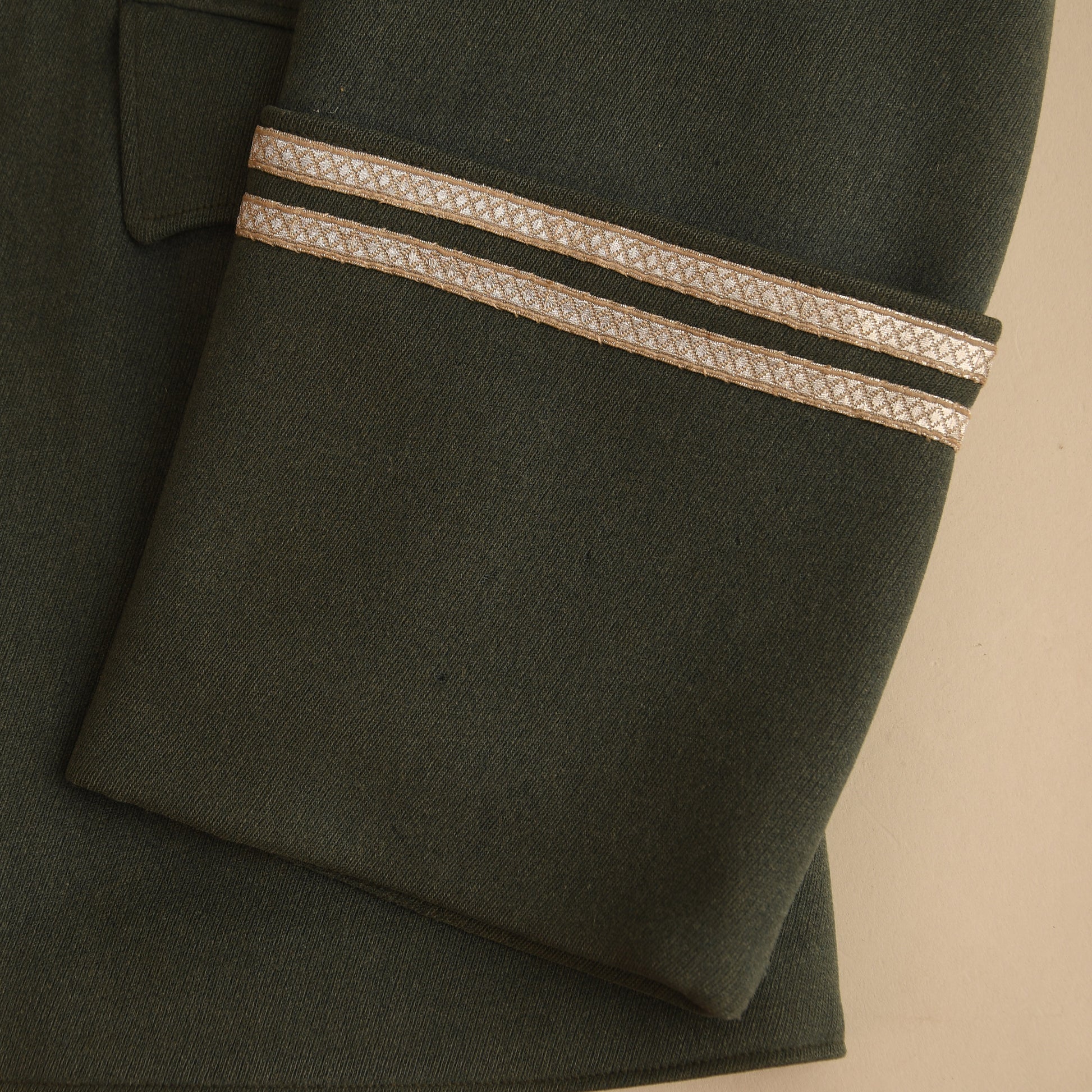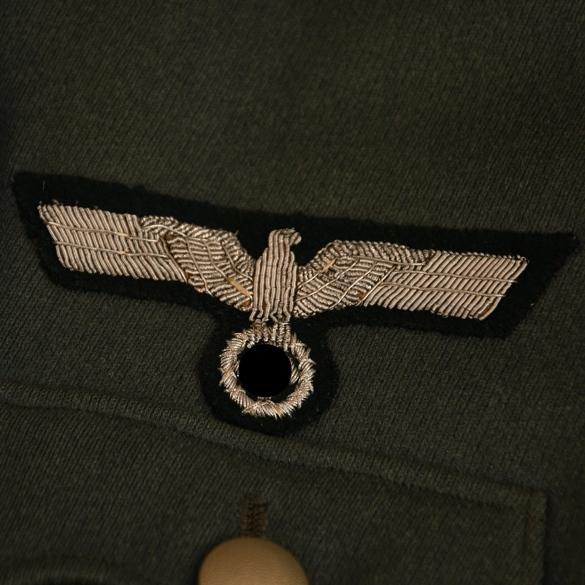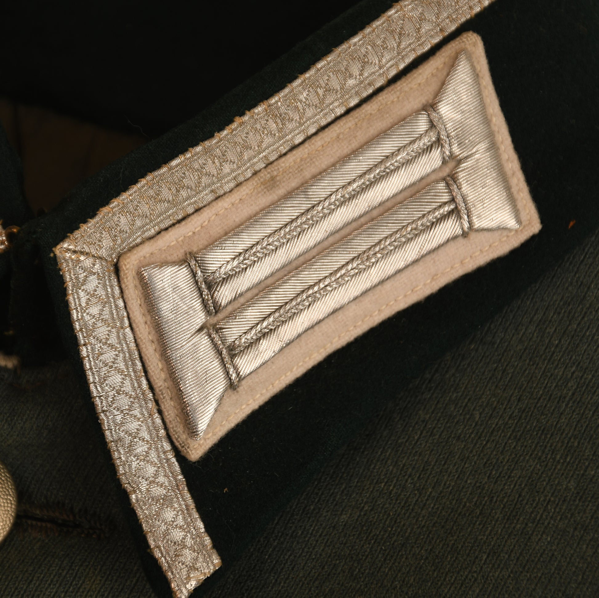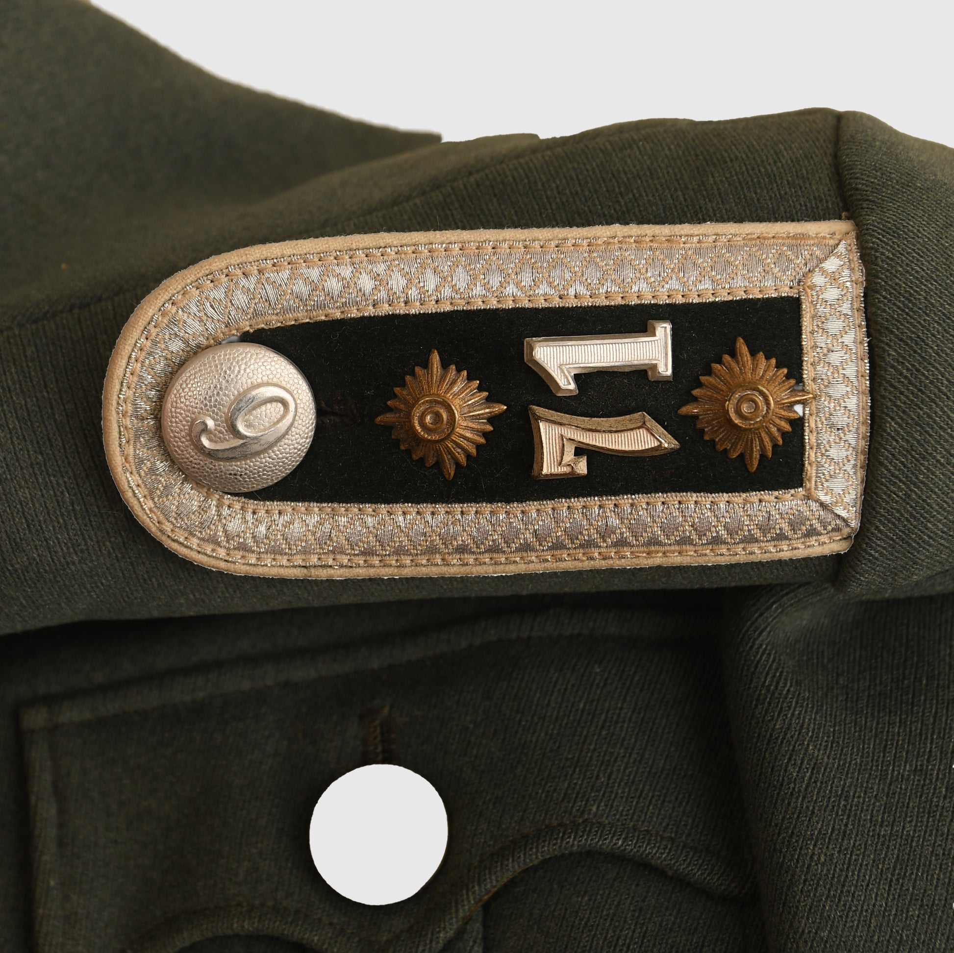 A very fine condition piped walking-out tunic for a senior NCO of Infantry Regiment 71, crafted in high-quality officers’ material. The tunic’s full complement of insignia includes parade-style heavy bullion collar patches, white-piped NCO shoulder boards indicating the rank of Oberfeldwebel, an officers’ bullion wire breast eagle, two rows of lace on the deep turnback cuffs, three loops for a short medal ribbon bar, and a double set for a single award on the upper right breast.