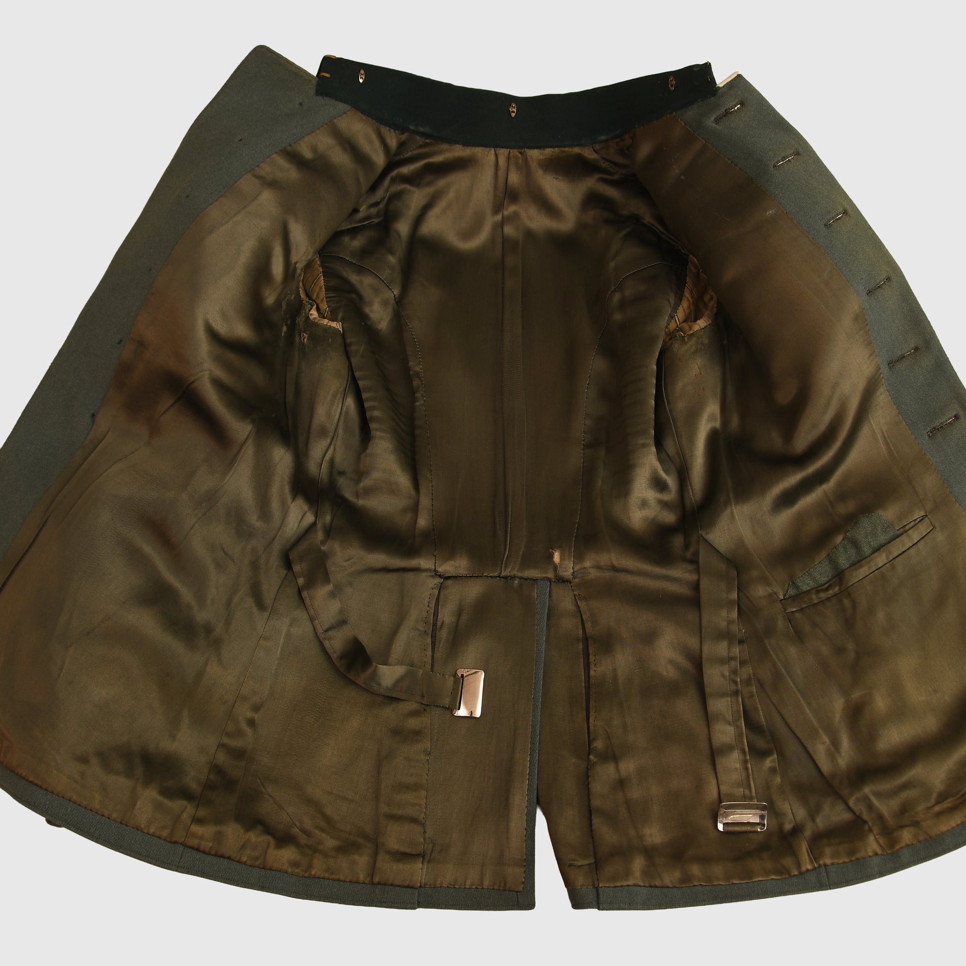 Cut in the Austrian style, the tunic features two upper patch pockets, two lower angled pockets, six-button closure, and a M15 skirted back. The dark green collar is fitted with NCO tresse. There is one small moth hole near the second upper button. Fully satin lined inside, this is a very attractive upper-medium sized tunic.