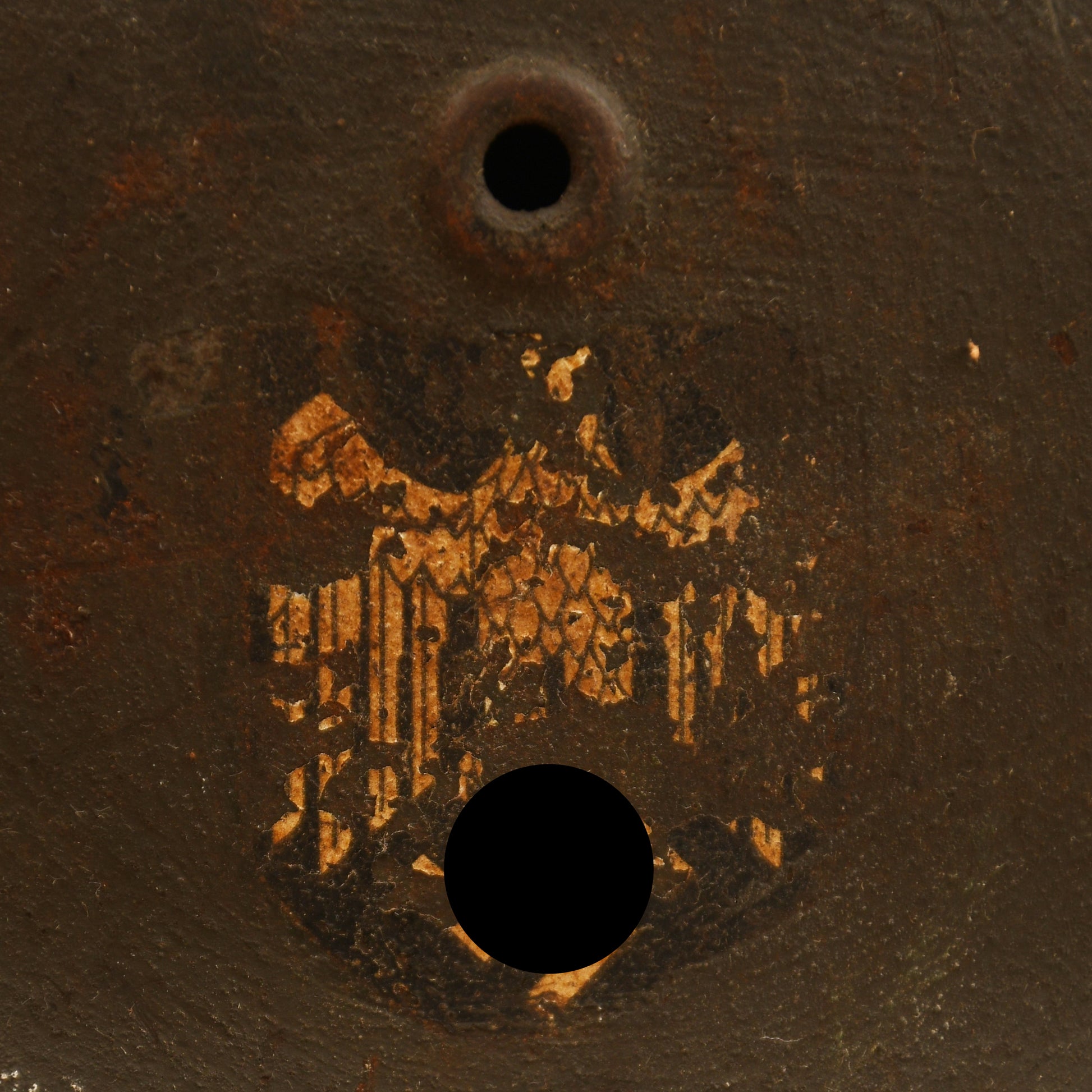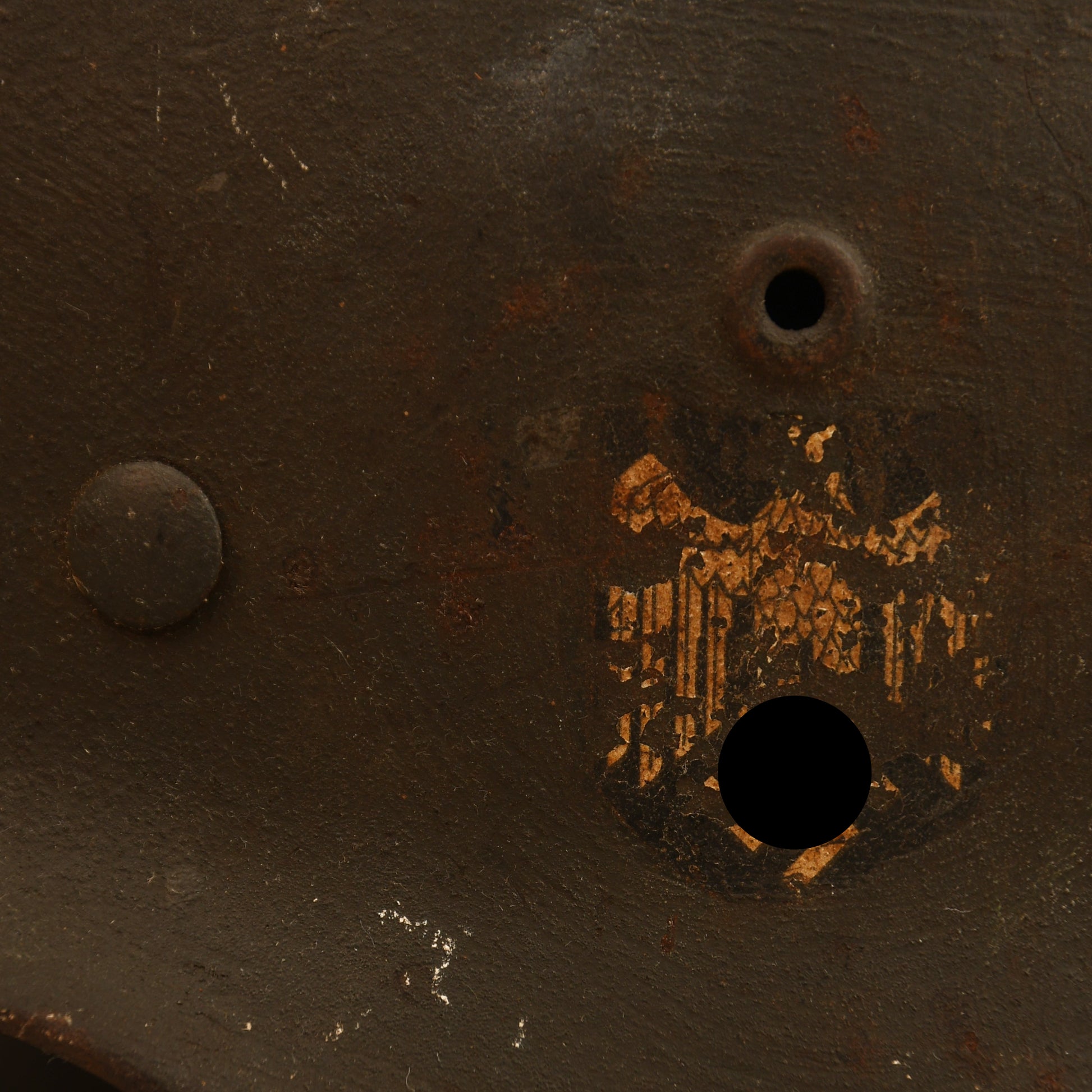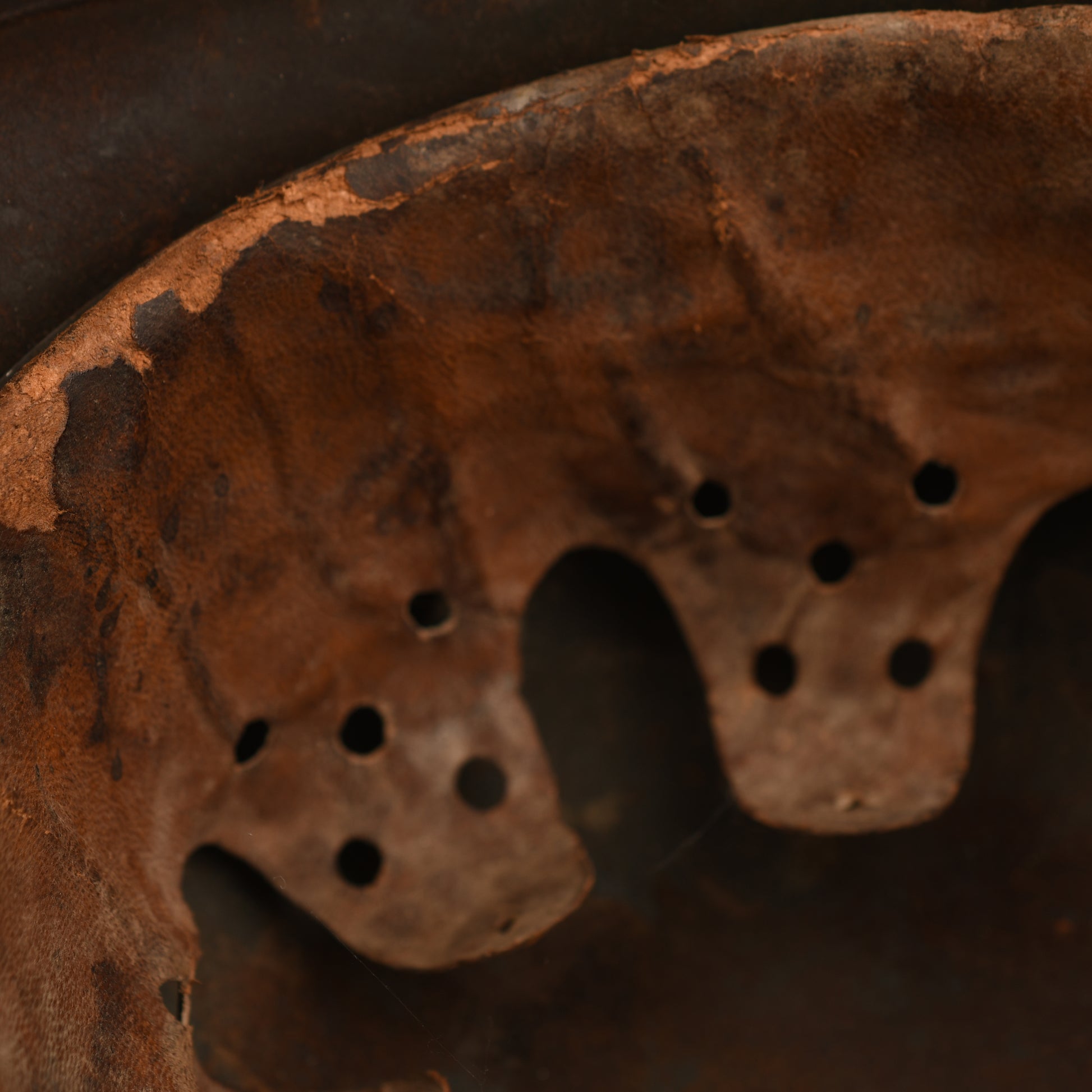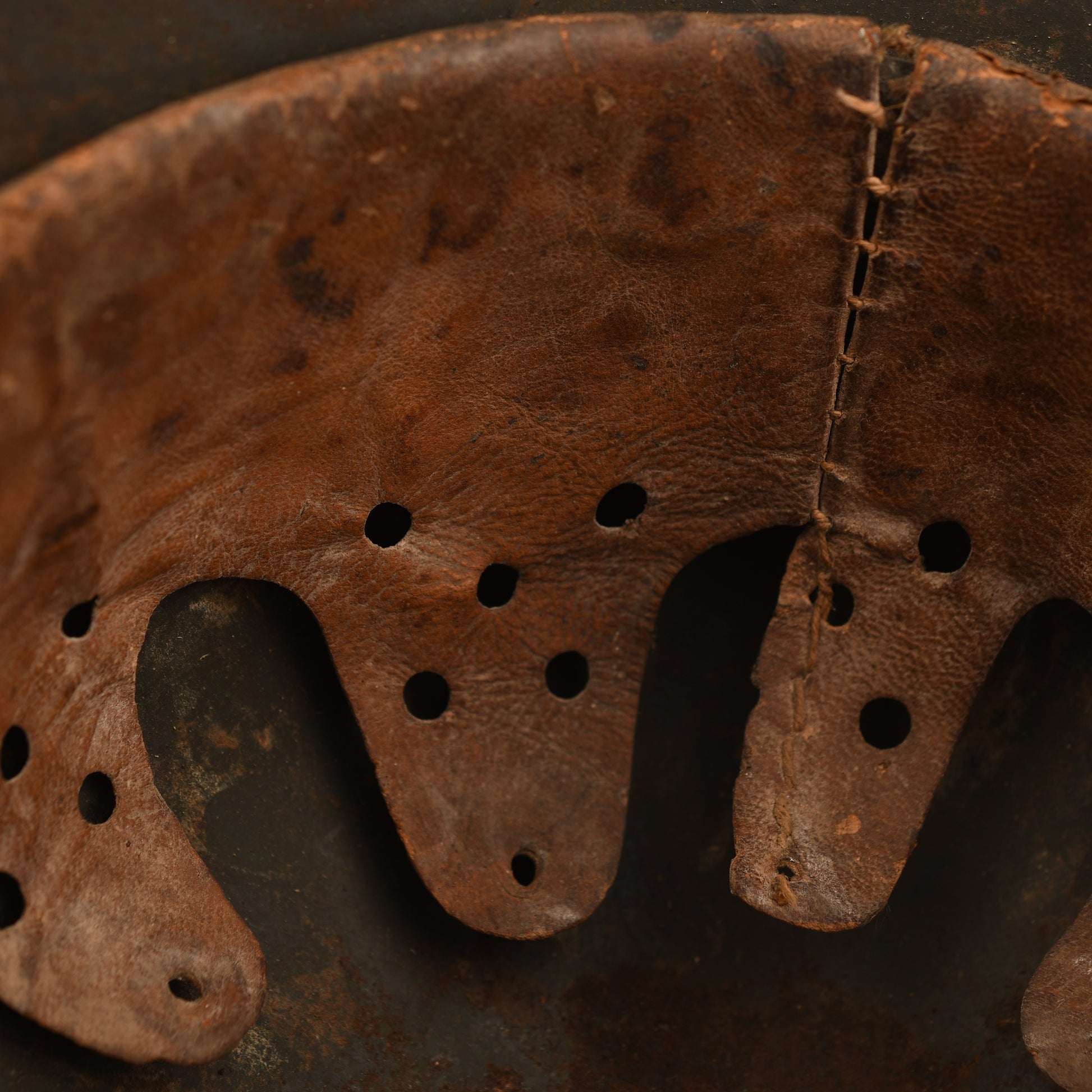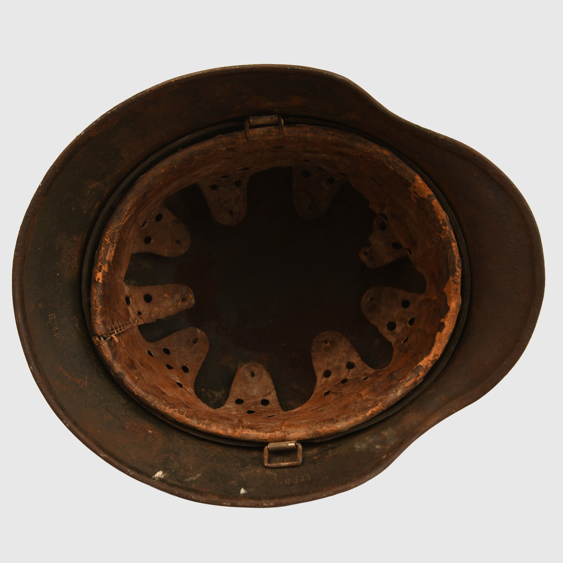 A large SE66 stamped M.40 shell retaining much of its secondary green semi-camouflage matt finish. The army decal shows some losses, as visible in our website images, with additional minor paint losses to the crown. Fitted with its complete 9-tongued original liner, all tongues intact, though one shows slight rodent gnawing. A very well-preserved and atmospheric example.