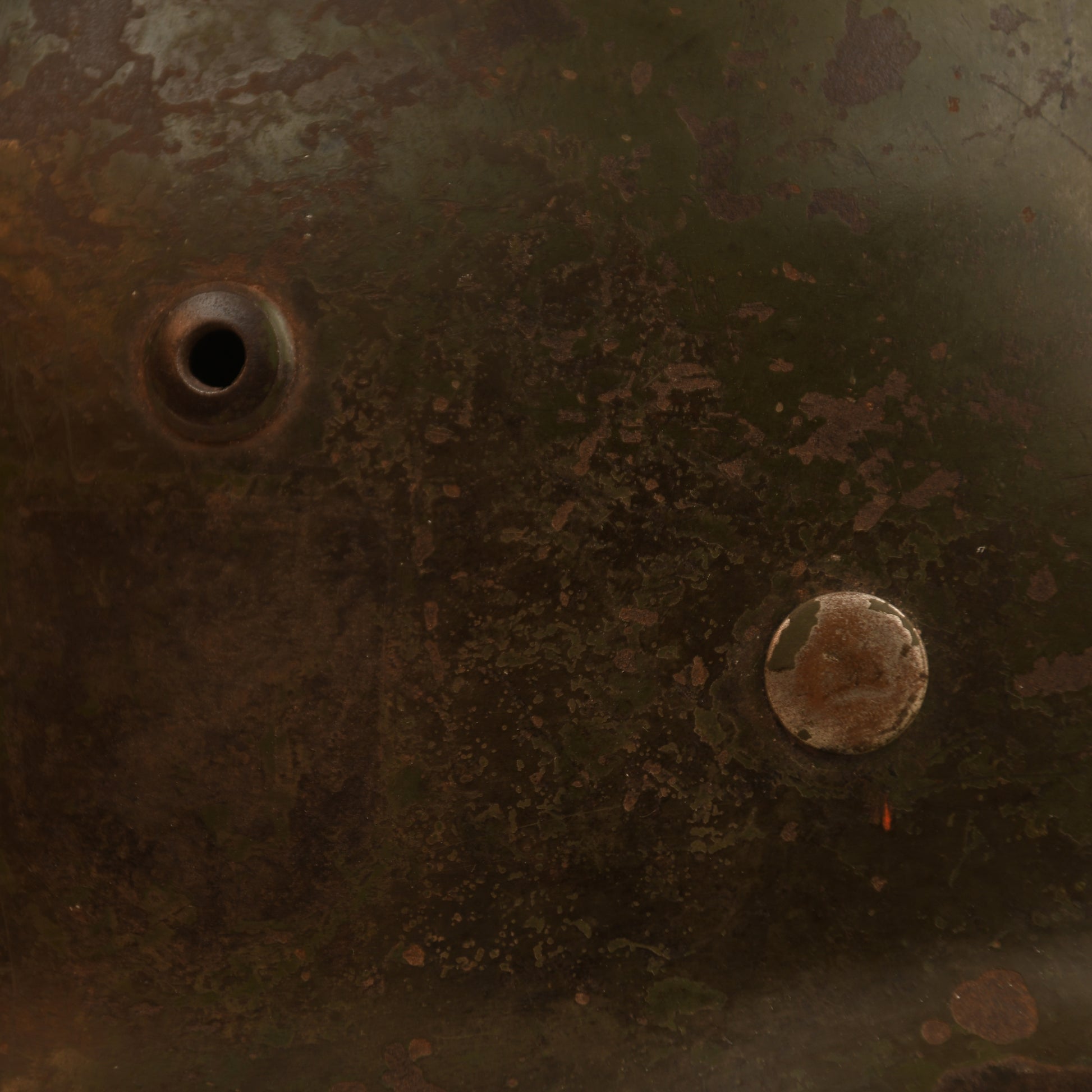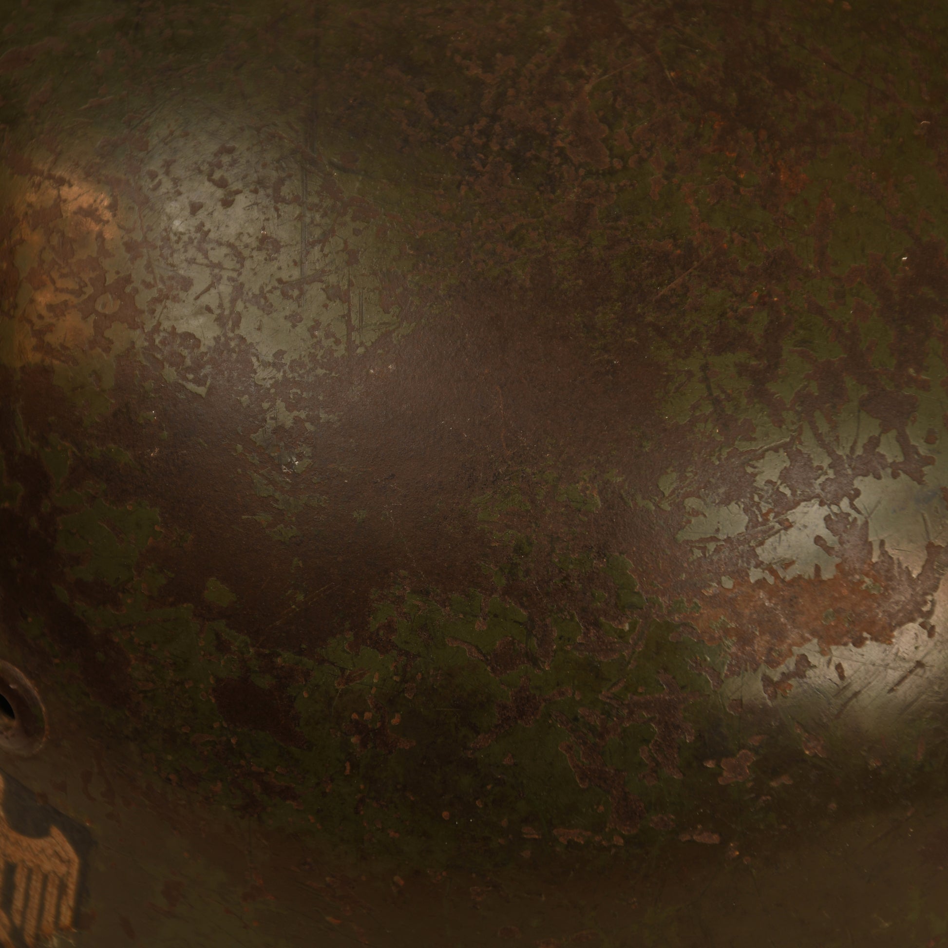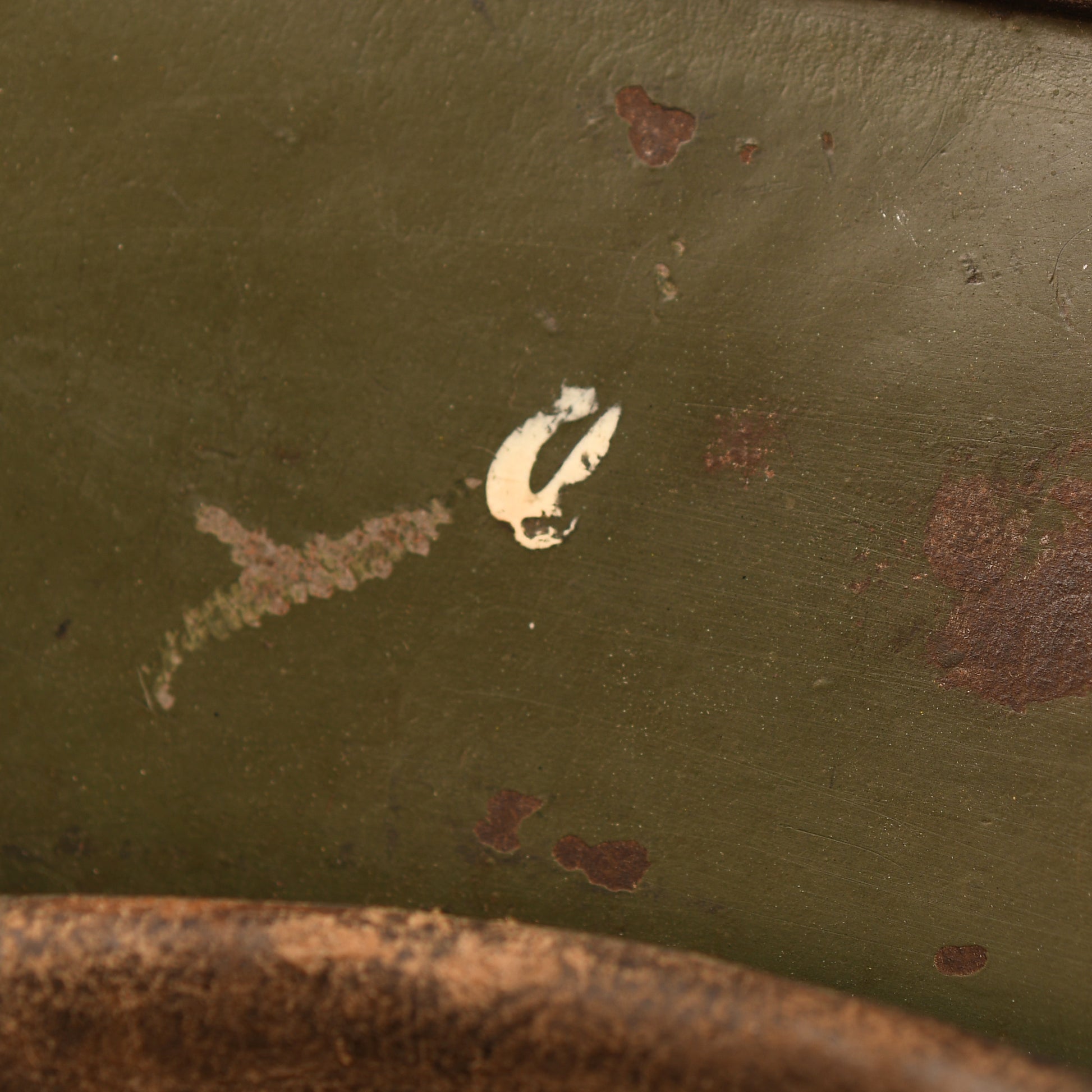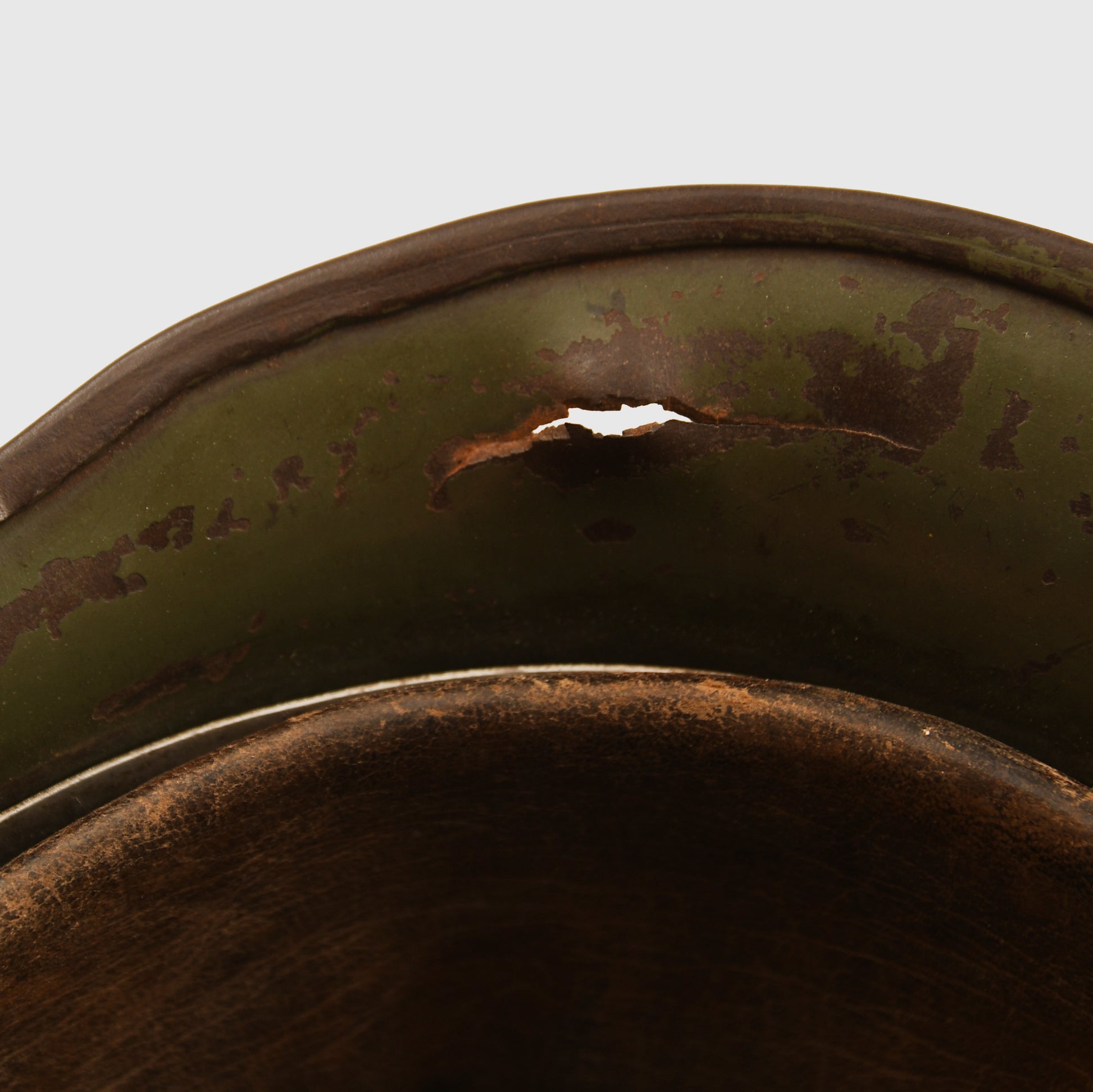 A scarce and historically interesting M35 helmet, originally issued with the apple green double decal configuration. Under 1940 regulations, the national tricolour decal was removed, leaving a large portion of the early apple green finish intact, with some losses visible in our web images. The helmet shows combat use with shrapnel damage to the front visor. The three liner retaining rivet heads have lost most of their paint, flaking from the aluminium. The remaining decal is clear with a minor abrasion to the lower right wing. The helmet is complete with its original aluminium-banded liner, full liner with all tongues intact, original drawstring, and original maker-marked chinstrap.
