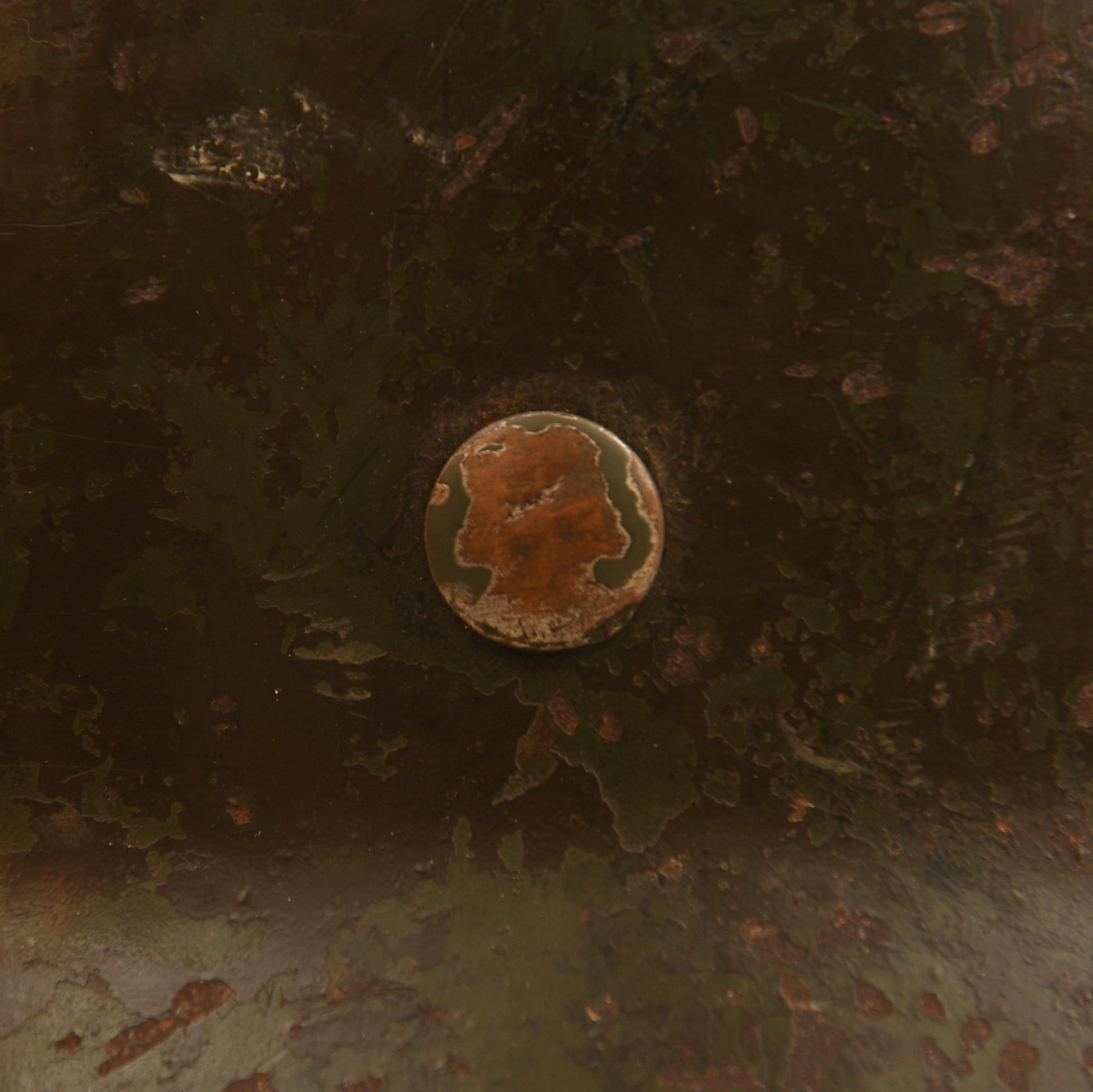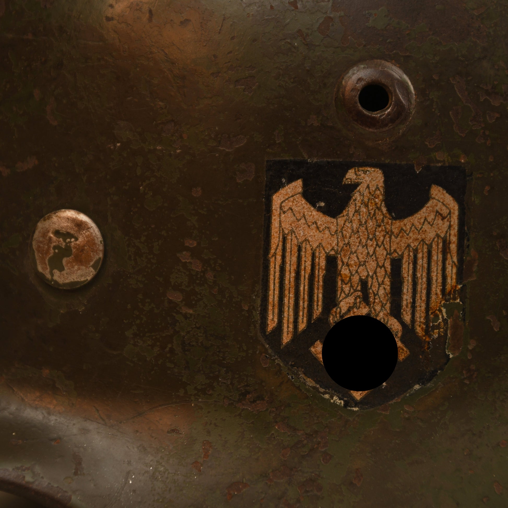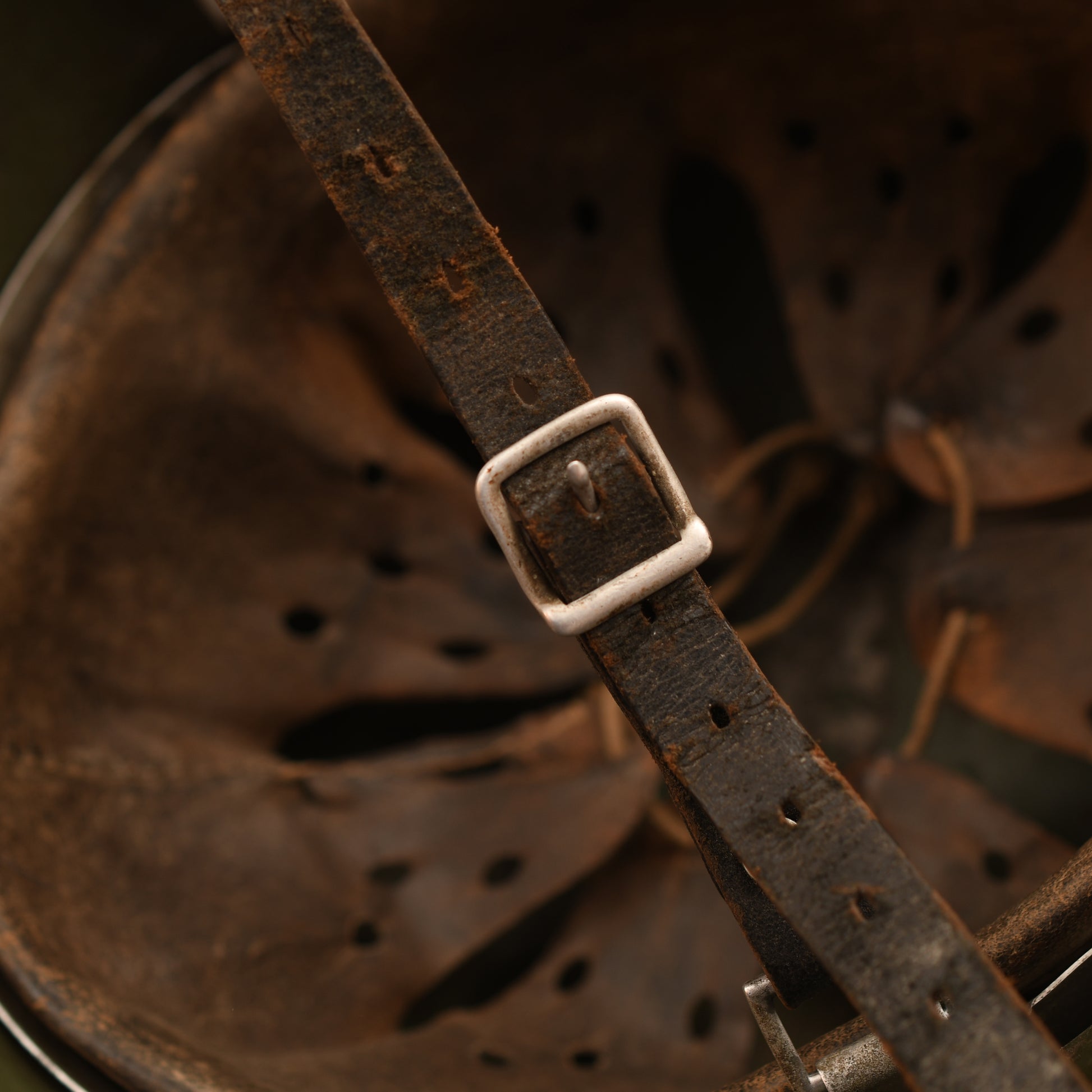 A scarce and historically interesting M35 helmet, originally issued with the apple green double decal configuration. Under 1940 regulations, the national tricolour decal was removed, leaving a large portion of the early apple green finish intact, with some losses visible in our web images. The helmet shows combat use with shrapnel damage to the front visor. The three liner retaining rivet heads have lost most of their paint, flaking from the aluminium. The remaining decal is clear with a minor abrasion to the lower right wing. The helmet is complete with its original aluminium-banded liner, full liner with all tongues intact, original drawstring, and original maker-marked chinstrap.