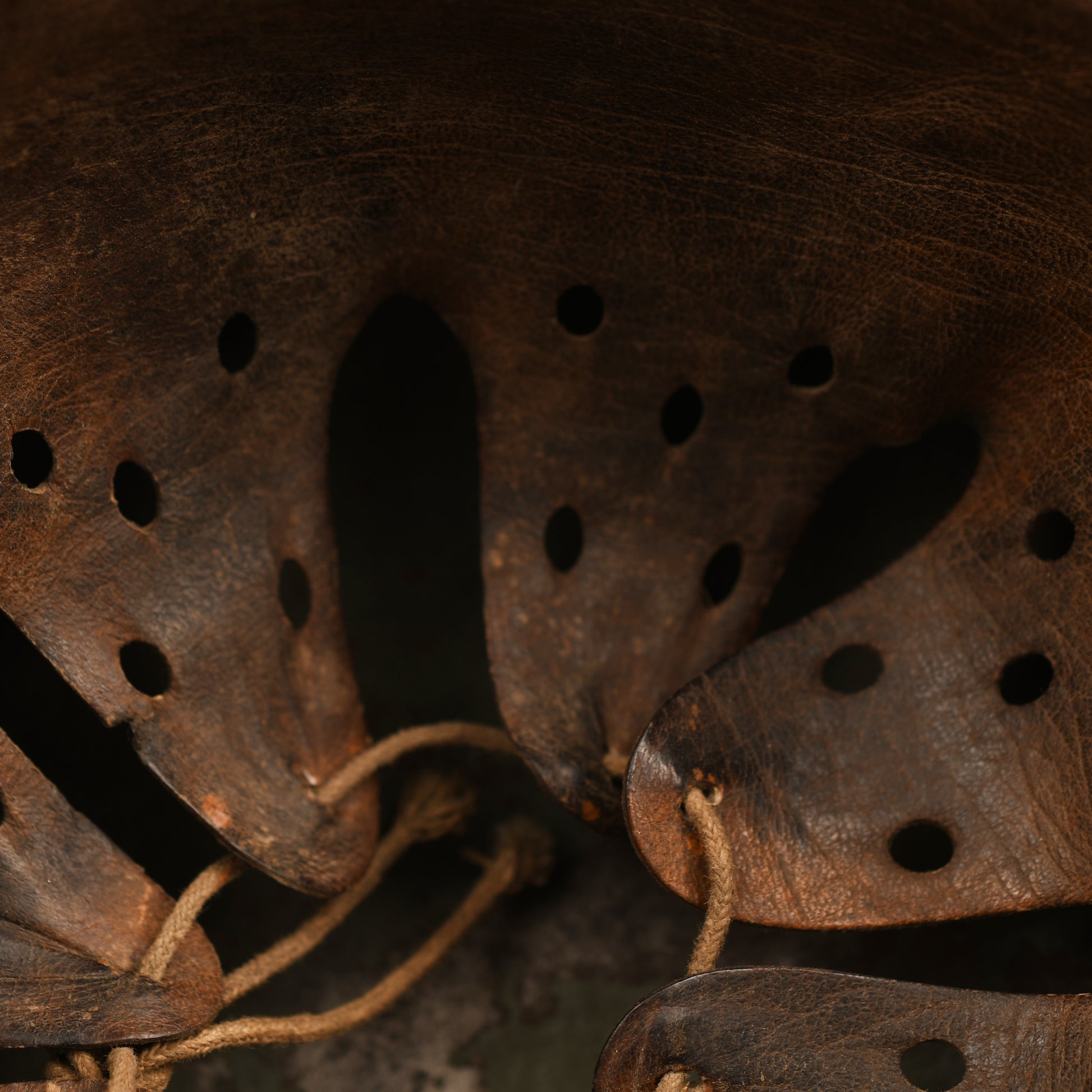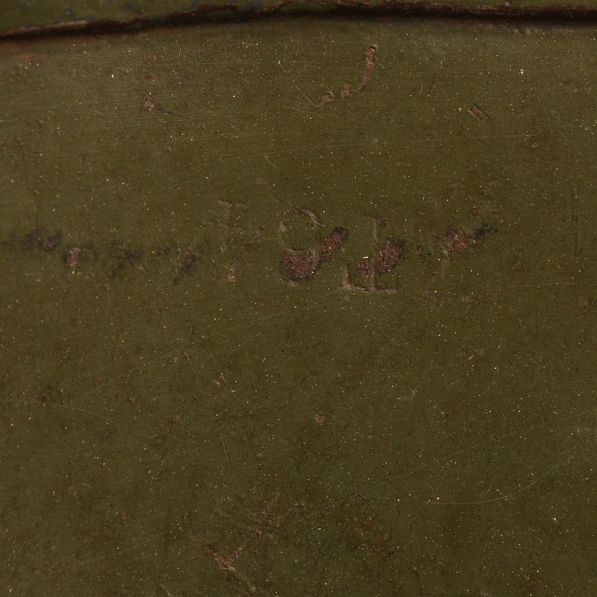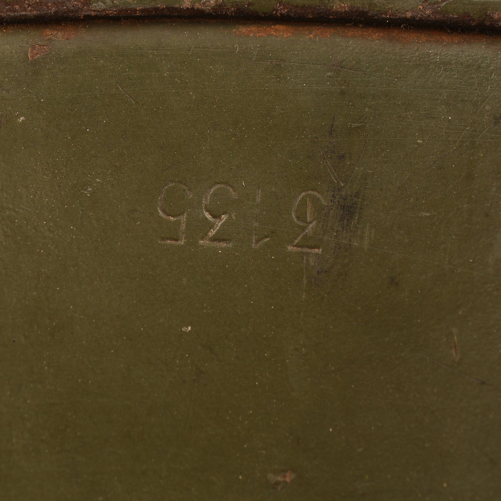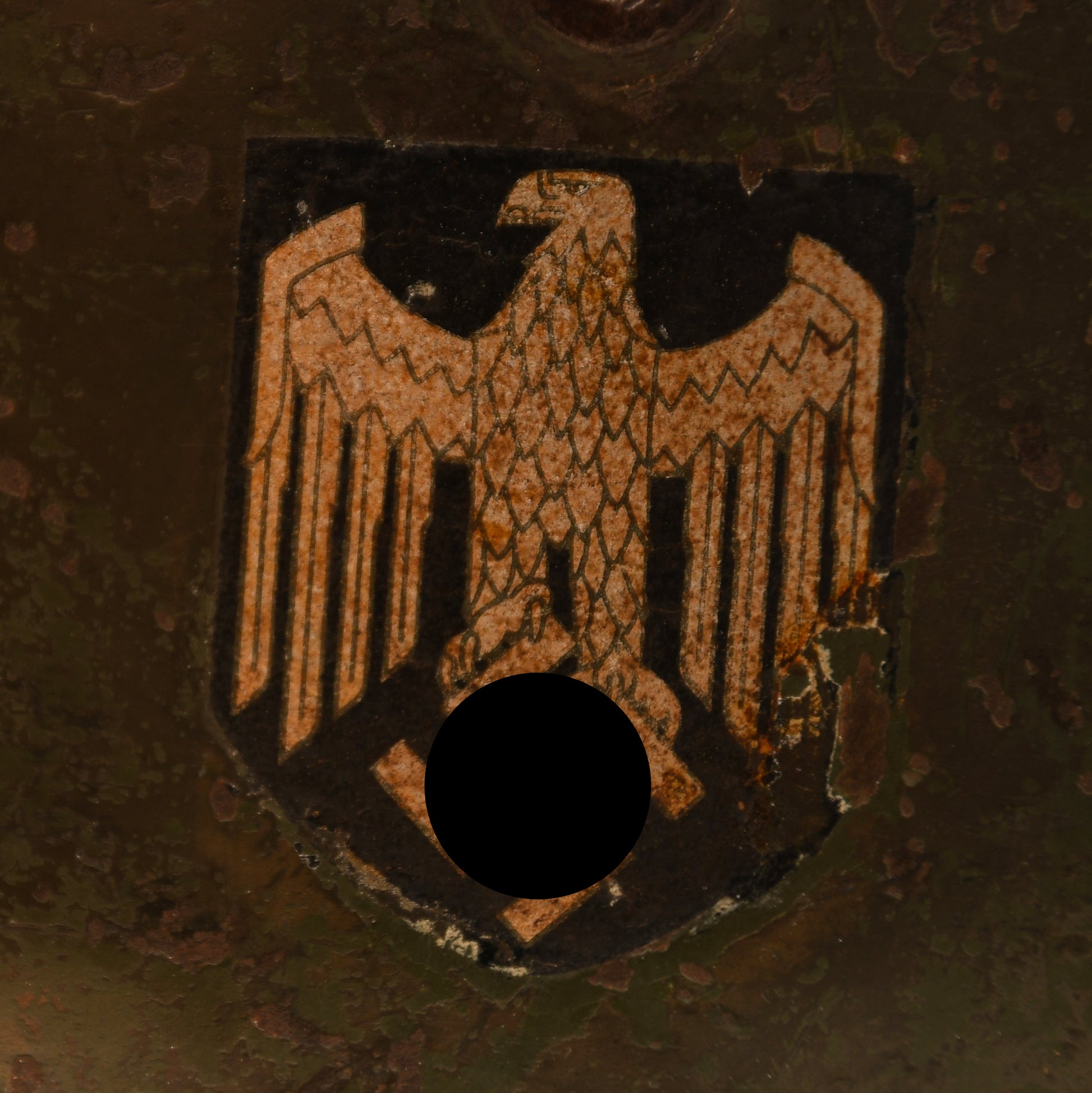 A scarce and historically interesting M35 helmet, originally issued with the apple green double decal configuration. Under 1940 regulations, the national tricolour decal was removed, leaving a large portion of the early apple green finish intact, with some losses visible in our web images. The helmet shows combat use with shrapnel damage to the front visor. The three liner retaining rivet heads have lost most of their paint, flaking from the aluminium. The remaining decal is clear with a minor abrasion to the lower right wing. The helmet is complete with its original aluminium-banded liner, full liner with all tongues intact, original drawstring, and original maker-marked chinstrap.