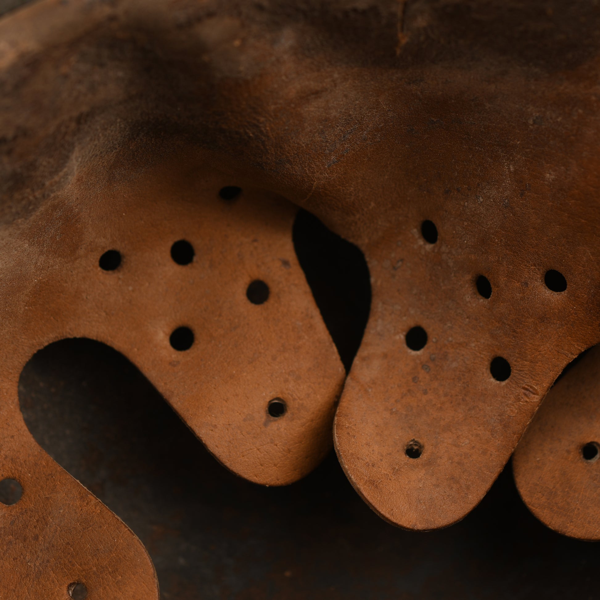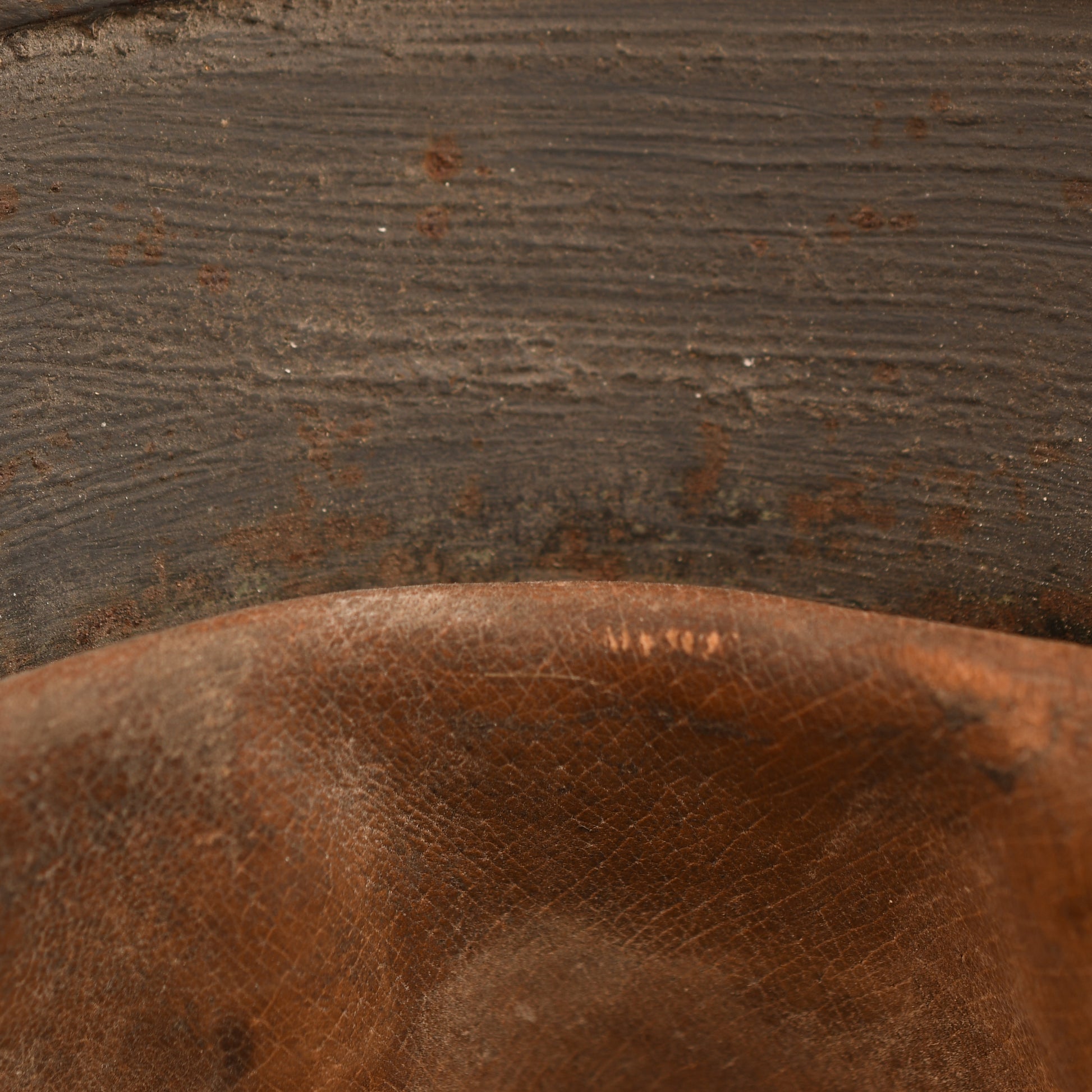 A well-presented example of an M40 Army combat helmet, featuring a secondary brush-applied matt grey finish. The helmet once had a wire camouflage cradle fitted, now removed but with its outline still clearly visible across the shell. The heavy paint layer obscures the shell size stamp, though the liner—appearing to be approximately size 56—remains complete. The liner stitching has deteriorated, separating it into two halves, yet the leather retains good colour with some areas of solidification. An excellent example showing authentic field modification and service wear.