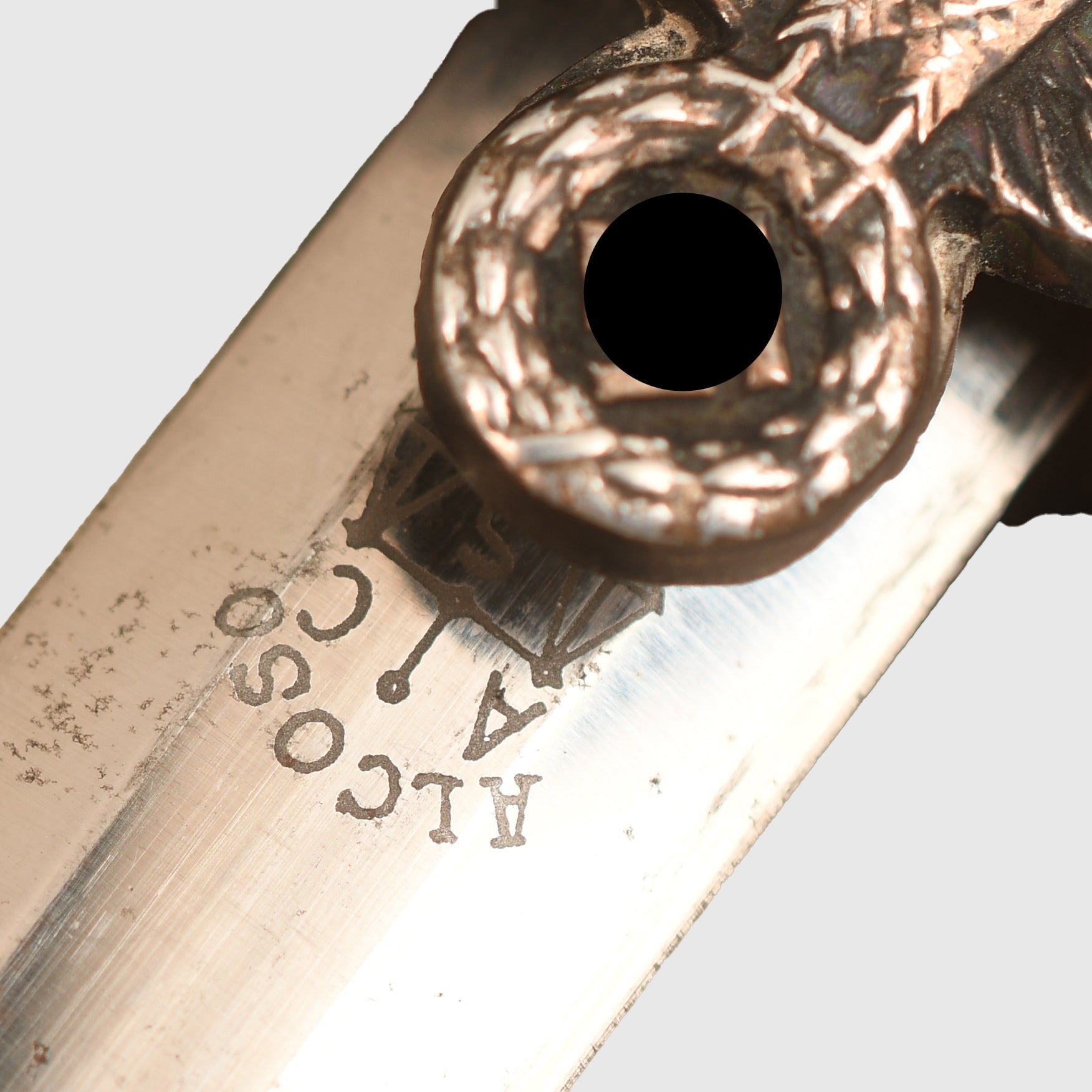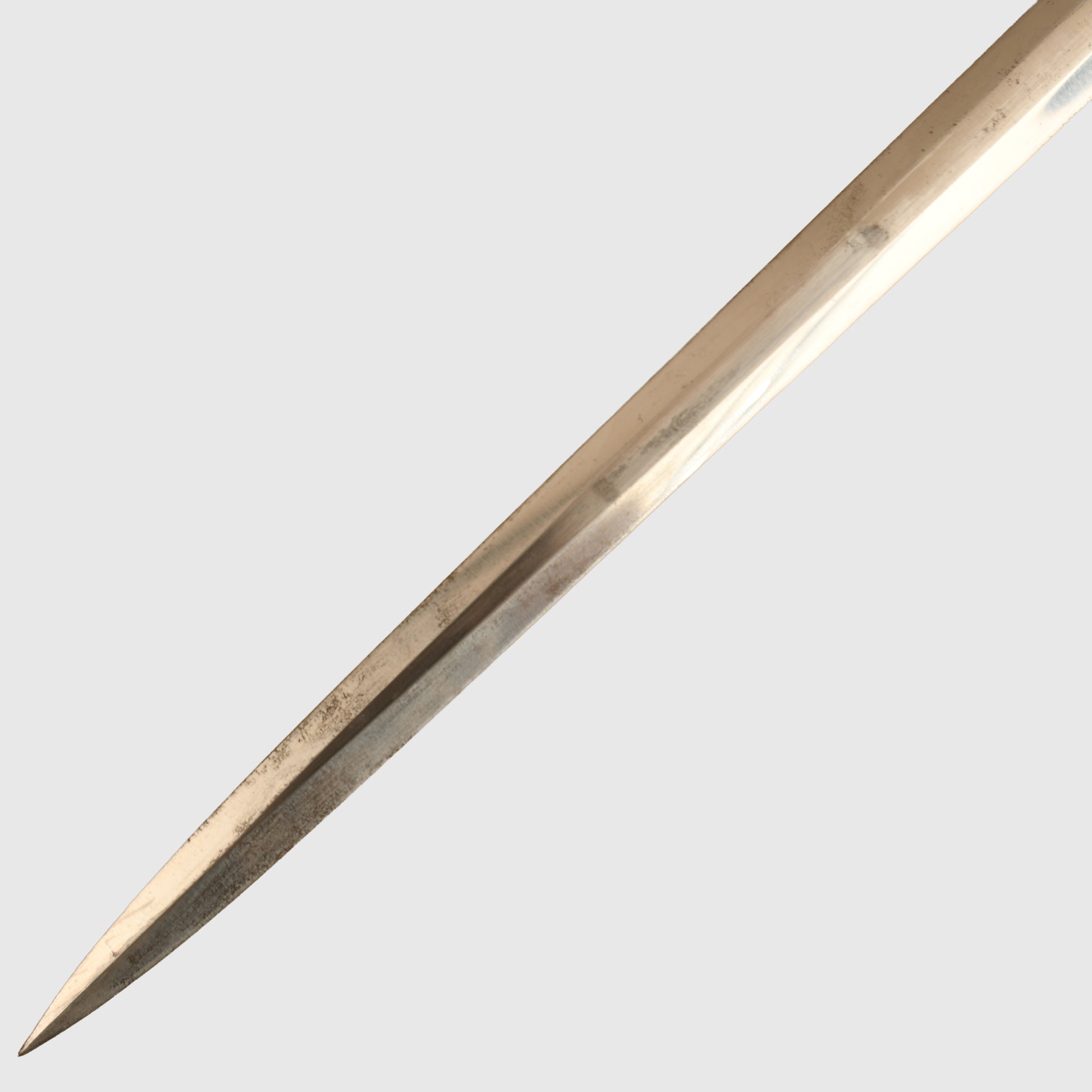 Absolutely mint blade by Alcoso, Solingen. All the square edges to the flat top of both sides of the blade is sharp with the edges nice and clean, good bright cross grain finishing. All the fittings, which include the upper pommel, cross guard and scabbard, all match in colour and quality. Deep orange grip, which is without any cracking or damage, with its portapee knot and a set of officers' hanging straps, deluxe type, which have unfortunately slightly oxidised.