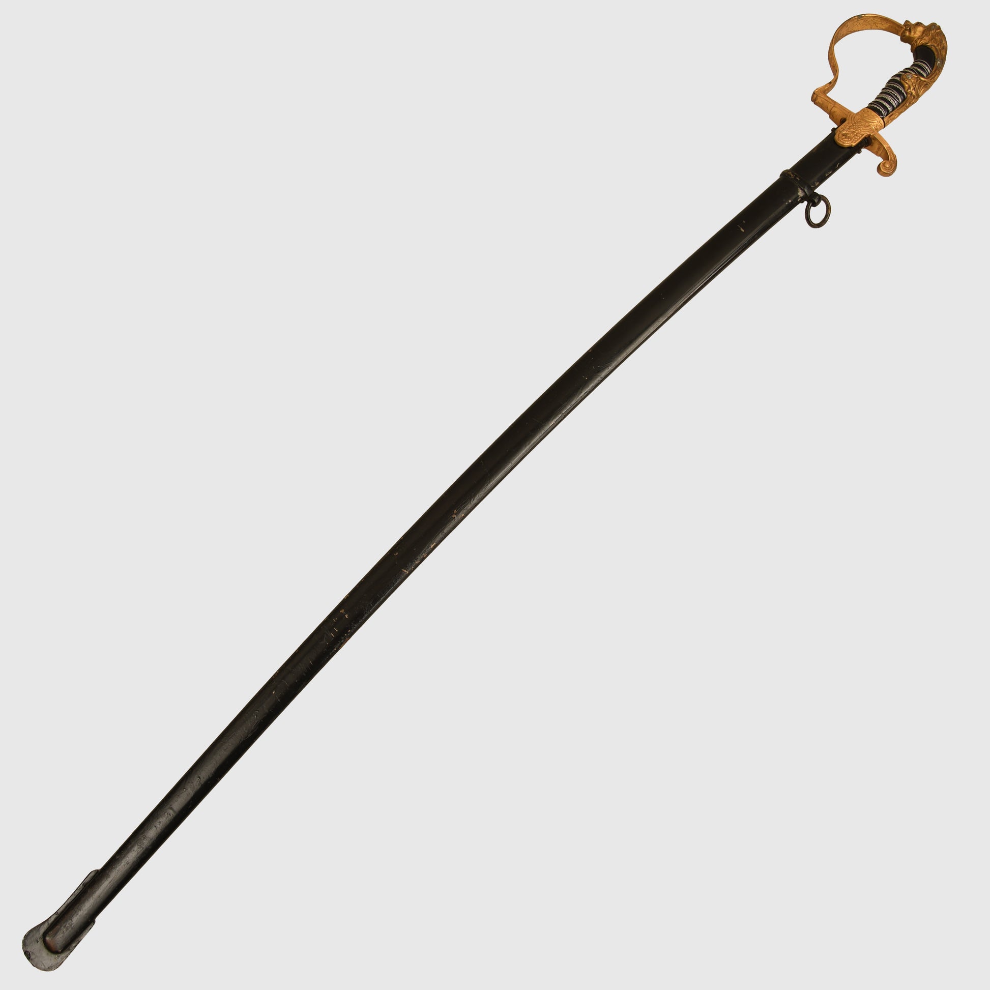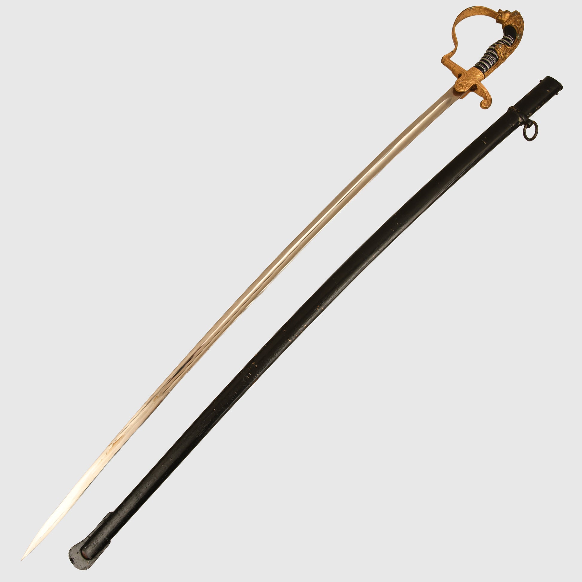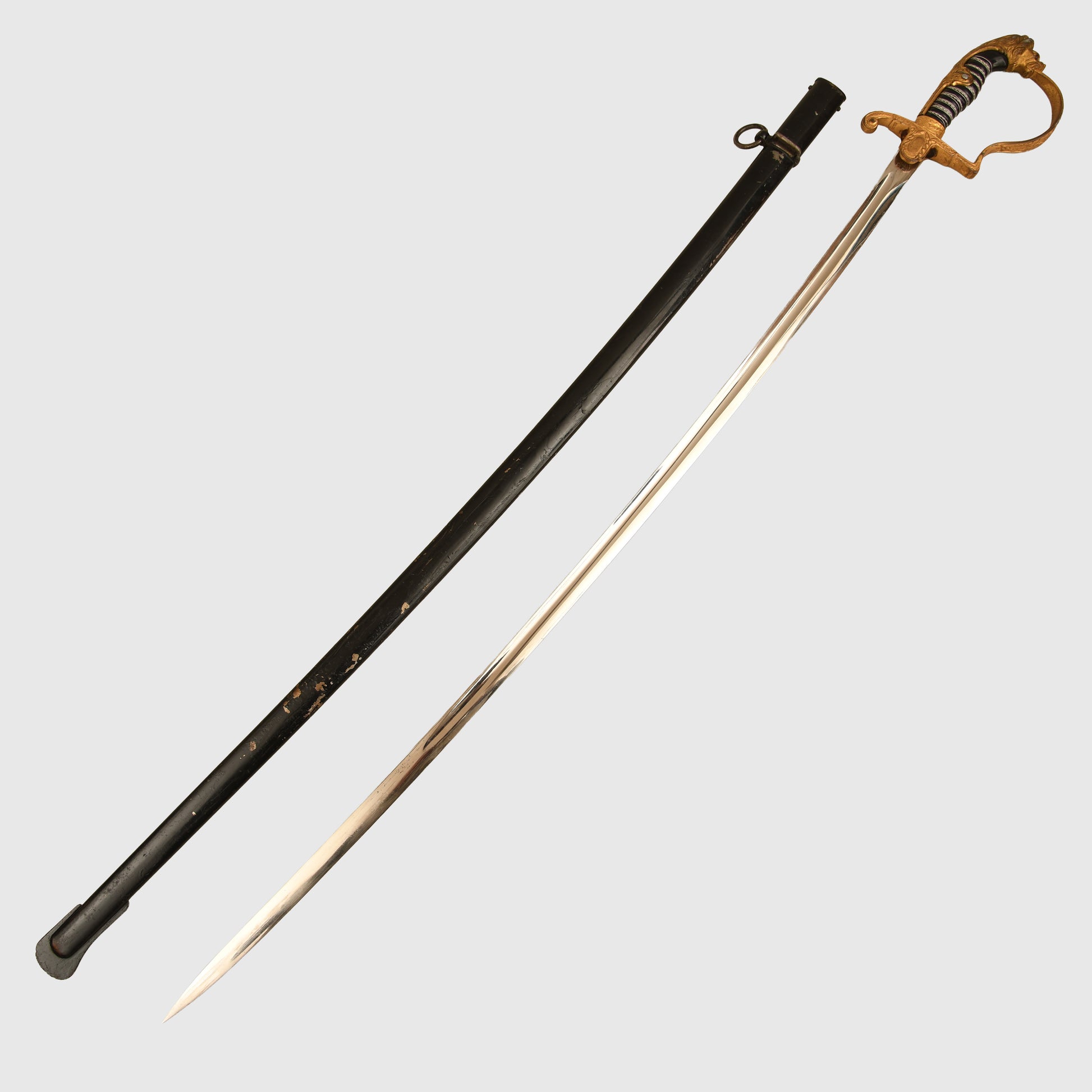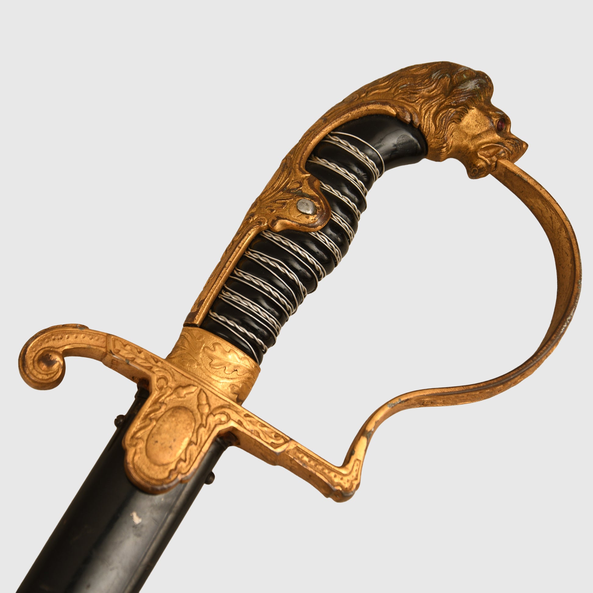 Excellent condition gilt to the hilt, some slight rubbing of the gilt on the right and left-hand side of the lion’s head. Twin red jewelled eyes. Grip undamaged, grip wire in place but slightly loose. Mint condition single fullered blade with the Eickhorn trademark fitted. The blade is 83cm long, in its original undented scabbard, with some minor abrasions to the paint finish to the lower half of the scabbard; otherwise, overall a good army officer's sword.
